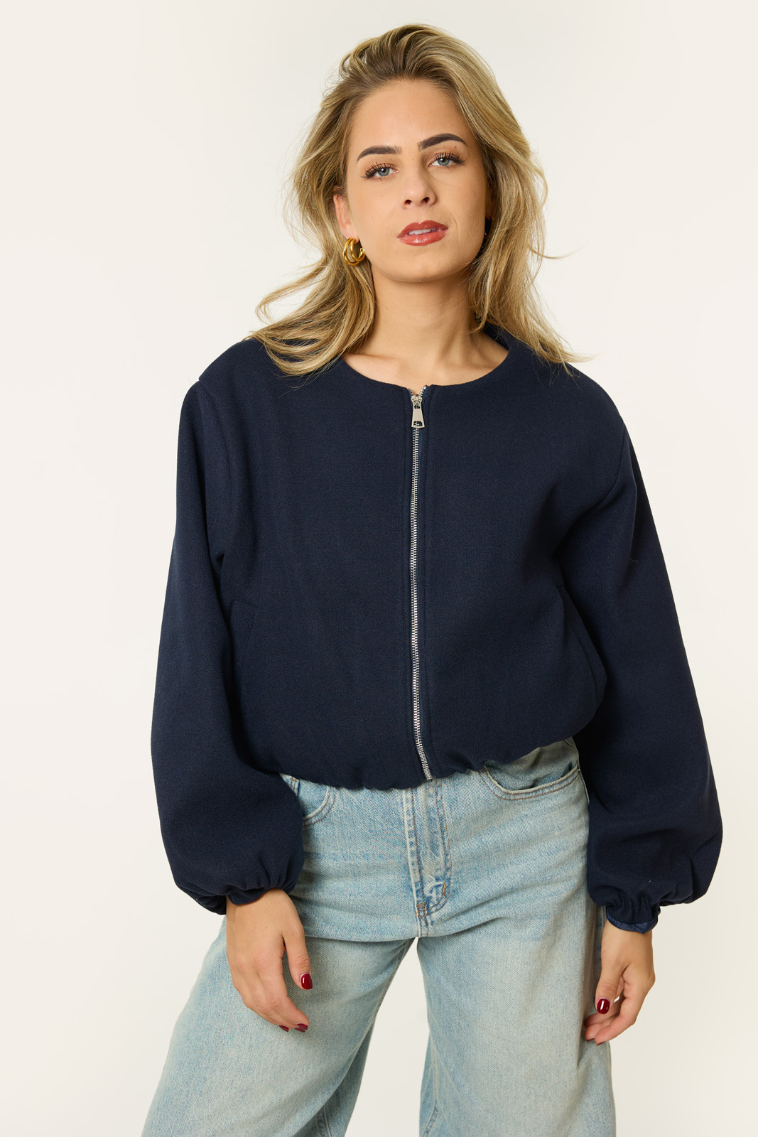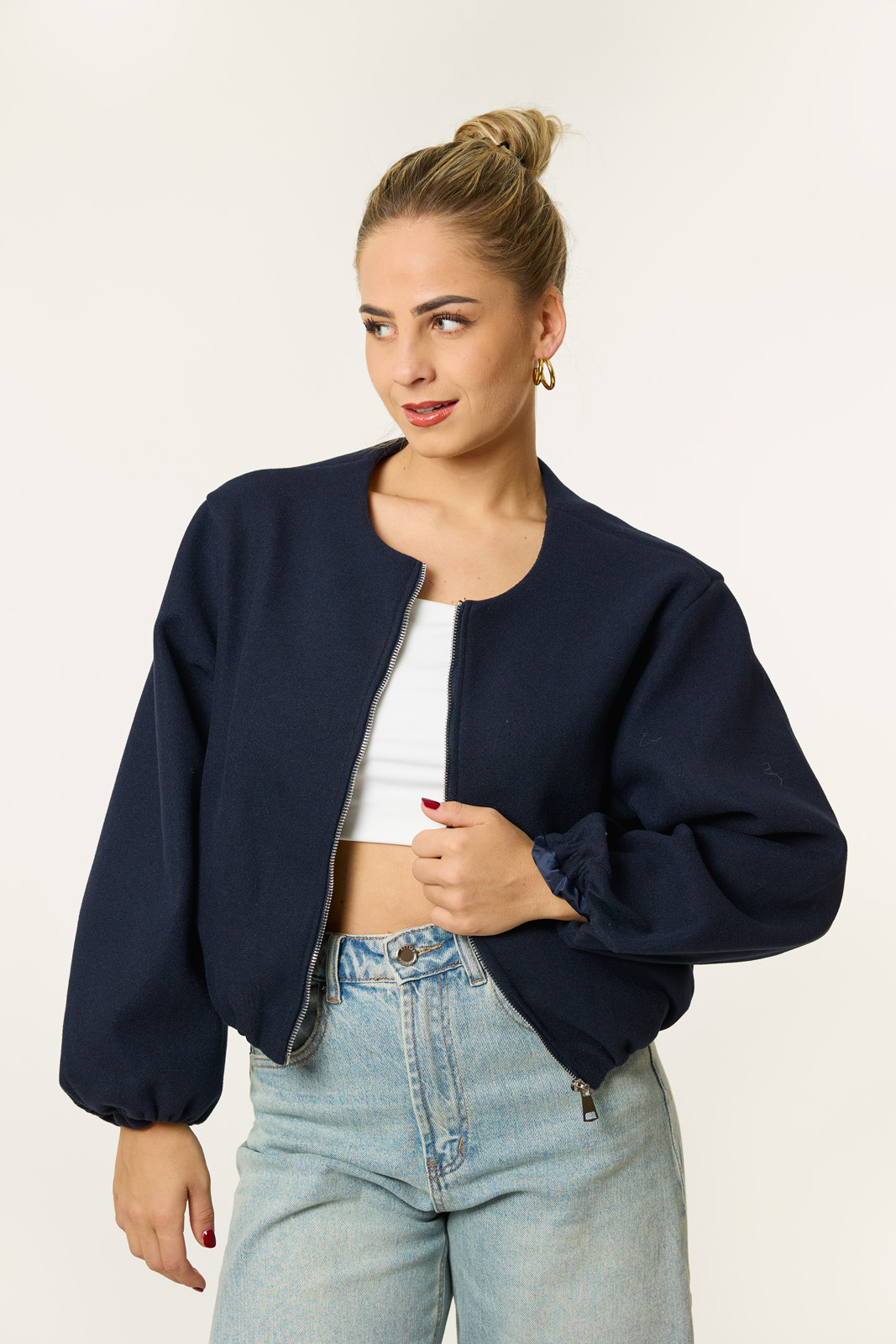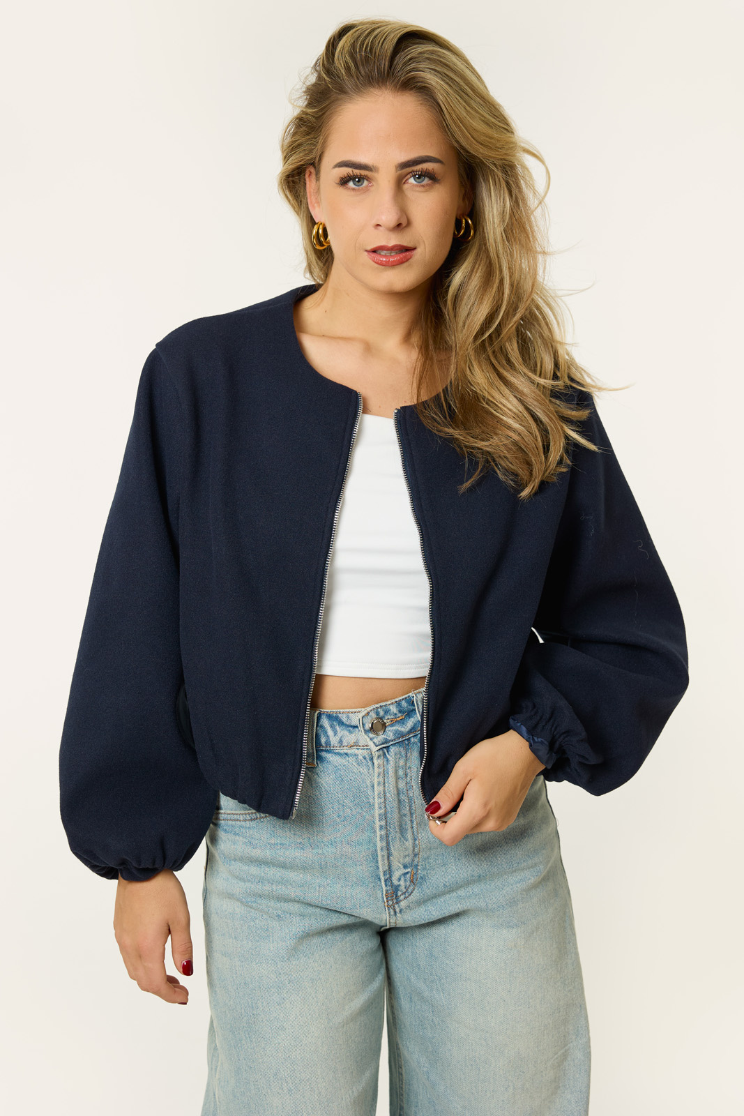 Deze navy blauwe bomberjas voor dames is de perfecte mix van sportief en stijlvol. Met de pofmouwen en korte lengte krijgt de jas een trendy uitstraling, ideaal om te combineren met een jeans van onze atelier lynn jeans lijn. Dankzij de ronde hals en ritssluiting draag je de bomber moeiteloos open of dicht, afhankelijk van je look. Een veelzijdige blauwe bomberjas die je outfits direct een stijlvolle upgrade geeft.