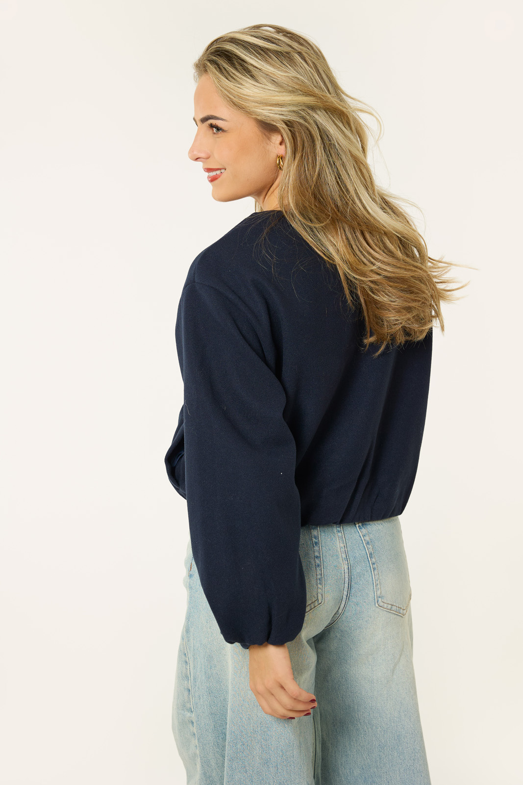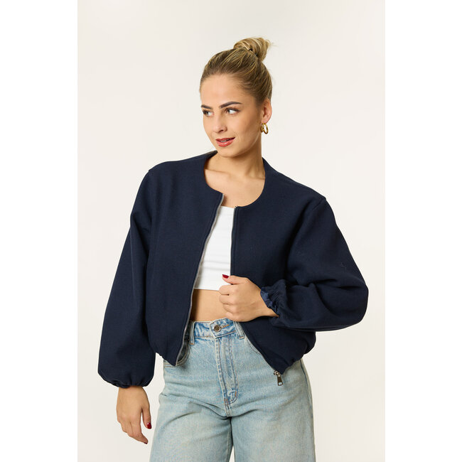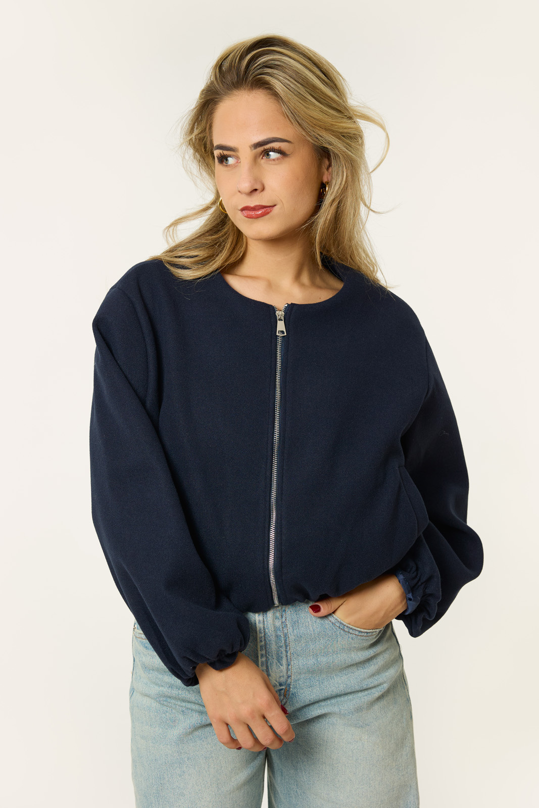Deze navy blauwe bomberjas voor dames is de perfecte mix van sportief en stijlvol. Met de pofmouwen en korte lengte krijgt de jas een trendy uitstraling, ideaal om te combineren met een jeans van onze atelier lynn jeans lijn. Dankzij de ronde hals en ritssluiting draag je de bomber moeiteloos open of dicht, afhankelijk van je look. Een veelzijdige blauwe bomberjas die je outfits direct een stijlvolle upgrade geeft.