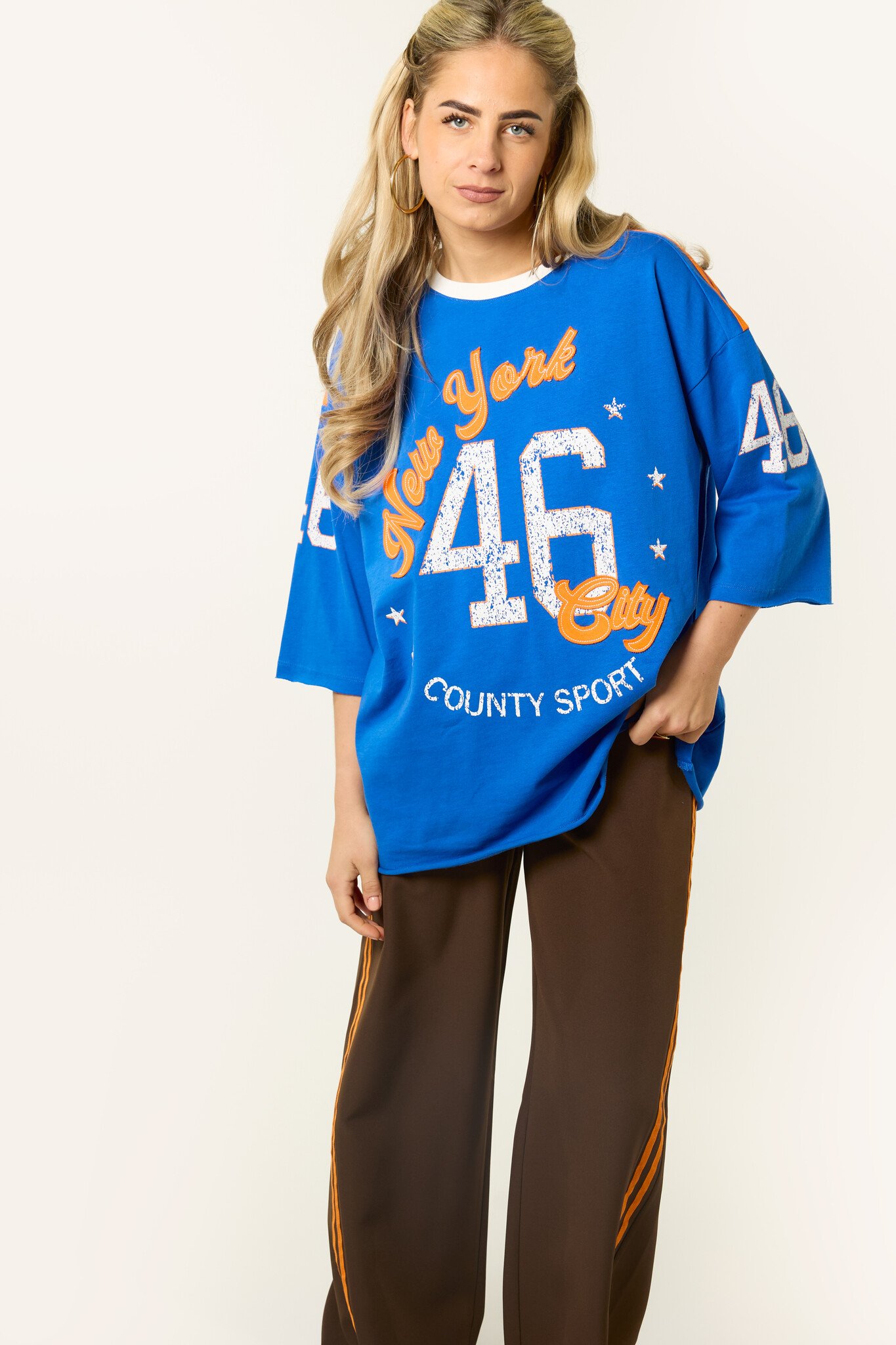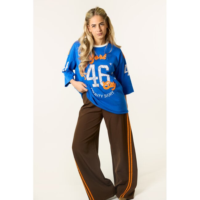Dankzij de blauw-oranje kleuren is dit T-shirt ook ideaal voor een Koningsdag outfit. Draag het oversized shirt met een jeans, short of rok voor een casual en trendy look die je ook na Koningsdag nog makkelijk blijft dragen.