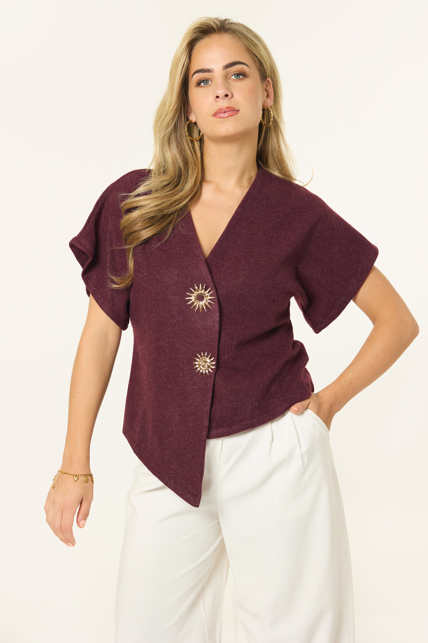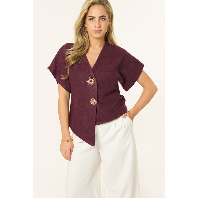 Deze bordeaux top krijgt net dat beetje extra door de gouden zonknopen aan de voorkant. Het zachte materiaal en de flatterende pasvorm maken de top perfect voor casual en party outfits. Combineer met een jeans voor alledaags of met een skort voor een girls night out.