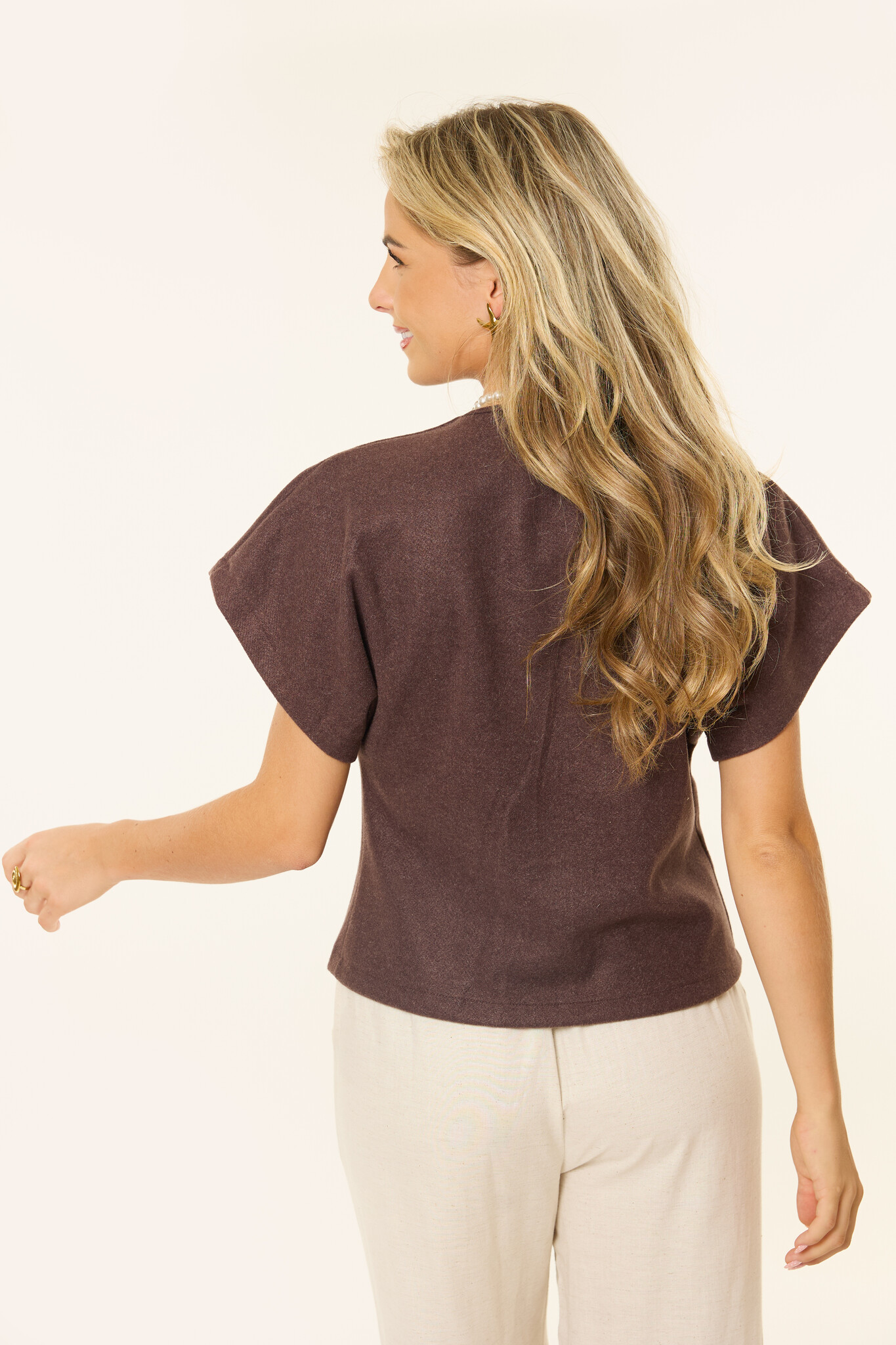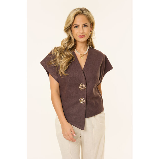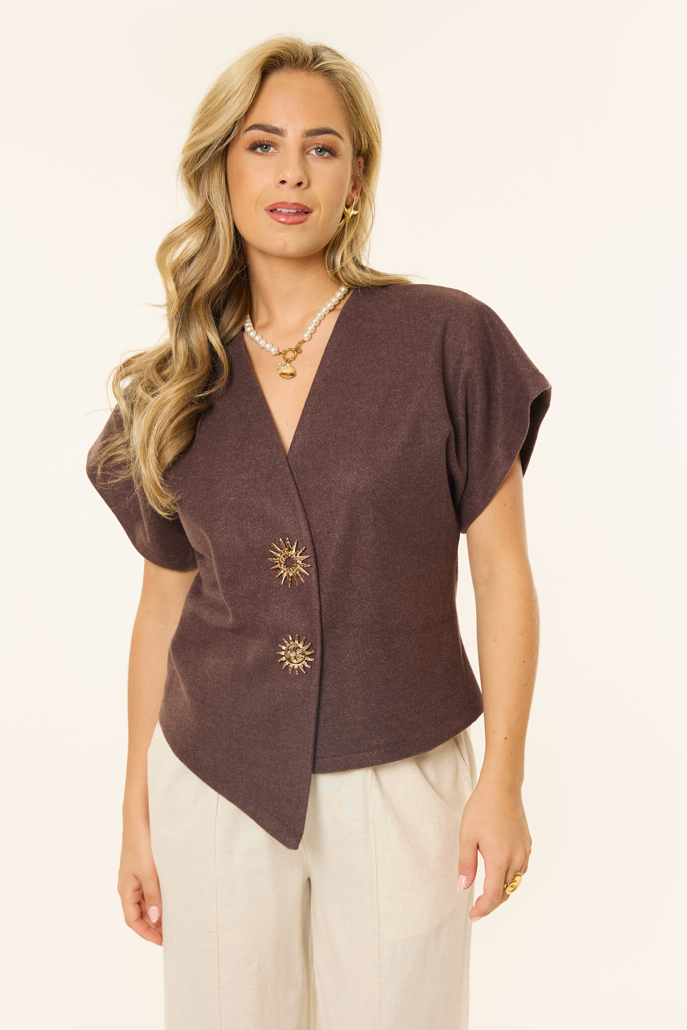 Deze bruine top krijgt net dat beetje extra door de gouden zonknopen aan de voorkant. Het zachte materiaal en de flatterende pasvorm maken de top perfect voor casual en party outfits. Combineer met een jeans voor alledaags of met een skort voor een girls night out.
