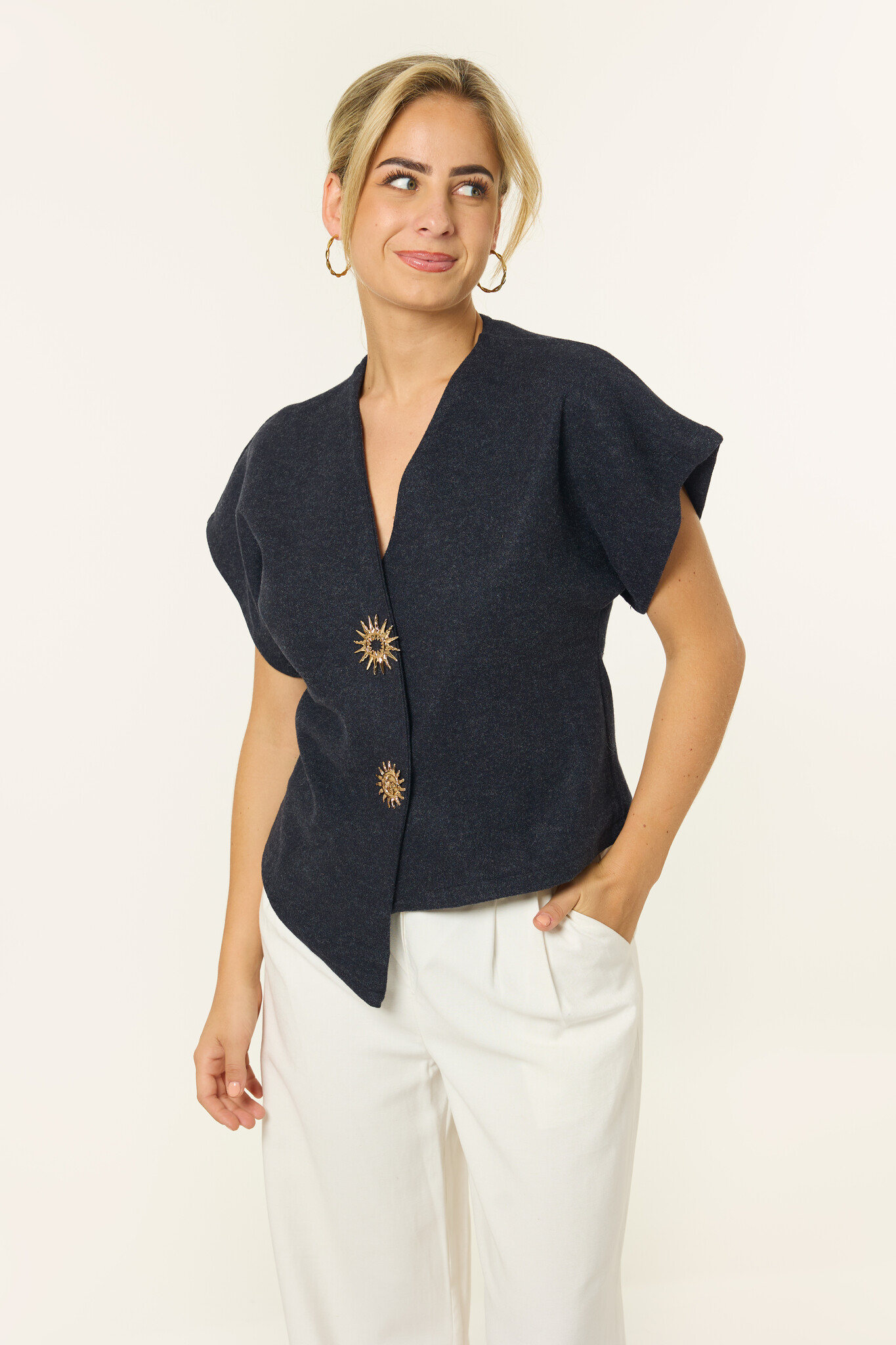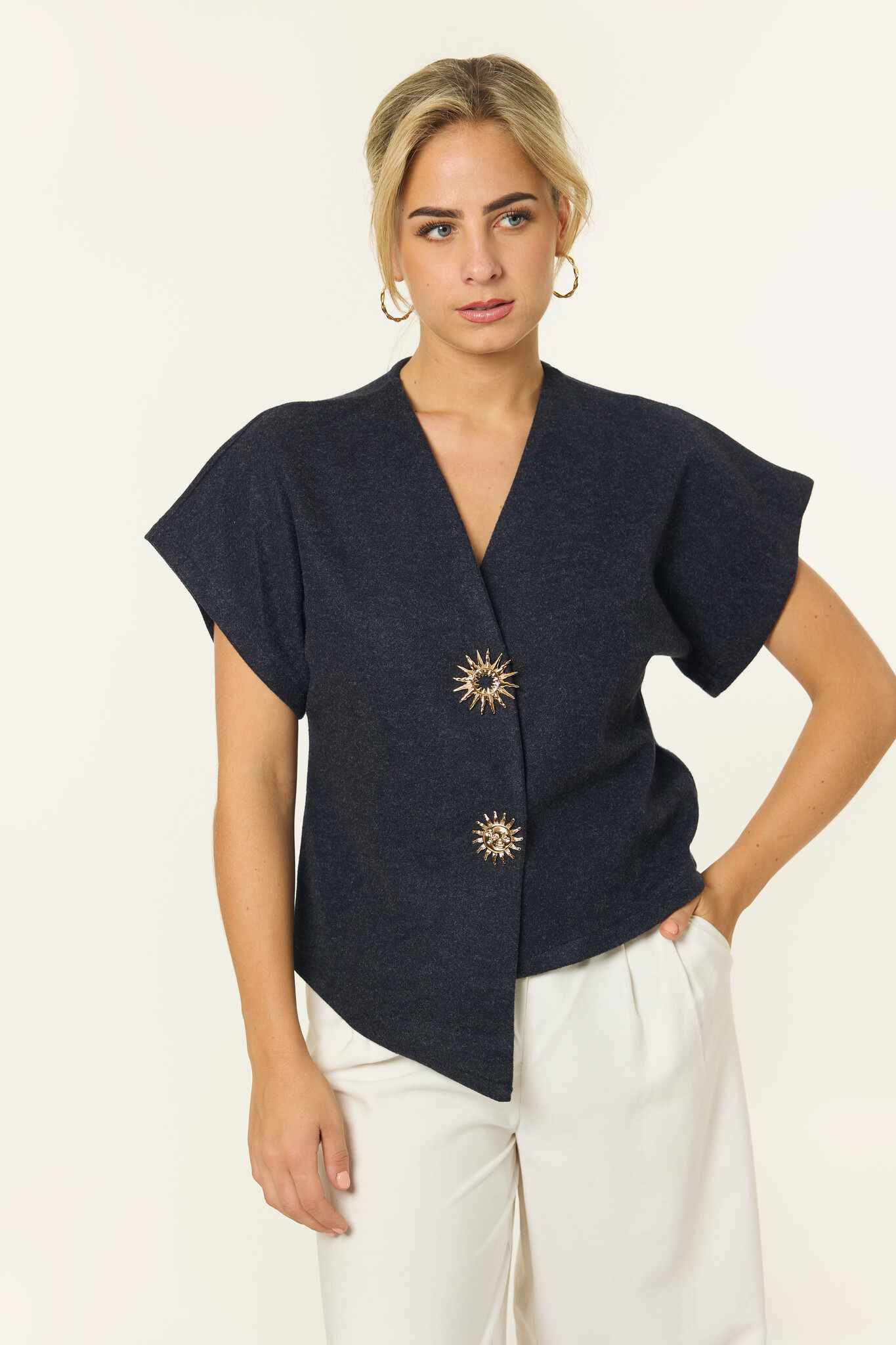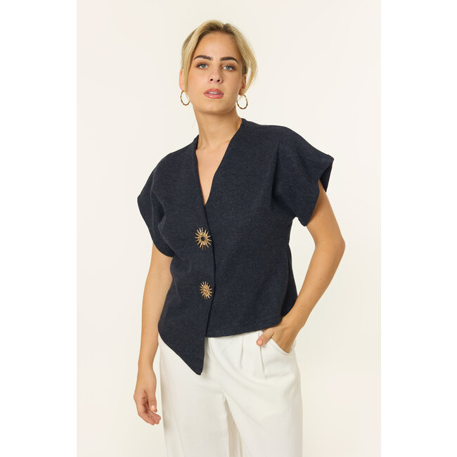 Deze donkerblauwe top krijgt net dat beetje extra door de gouden zonknopen aan de voorkant. Het zachte materiaal en de flatterende pasvorm maken de top perfect voor casual en party outfits. Combineer met een jeans voor alledaags of met een skort voor een girls night out.