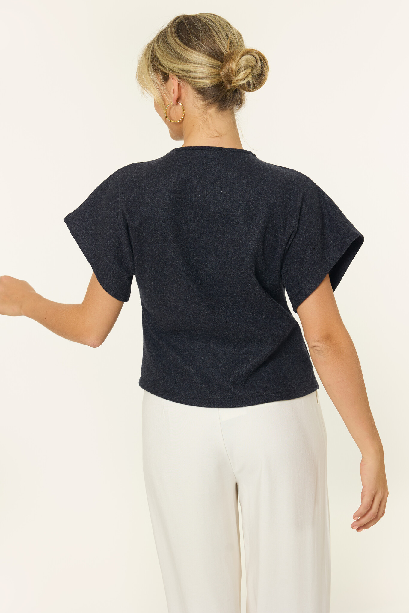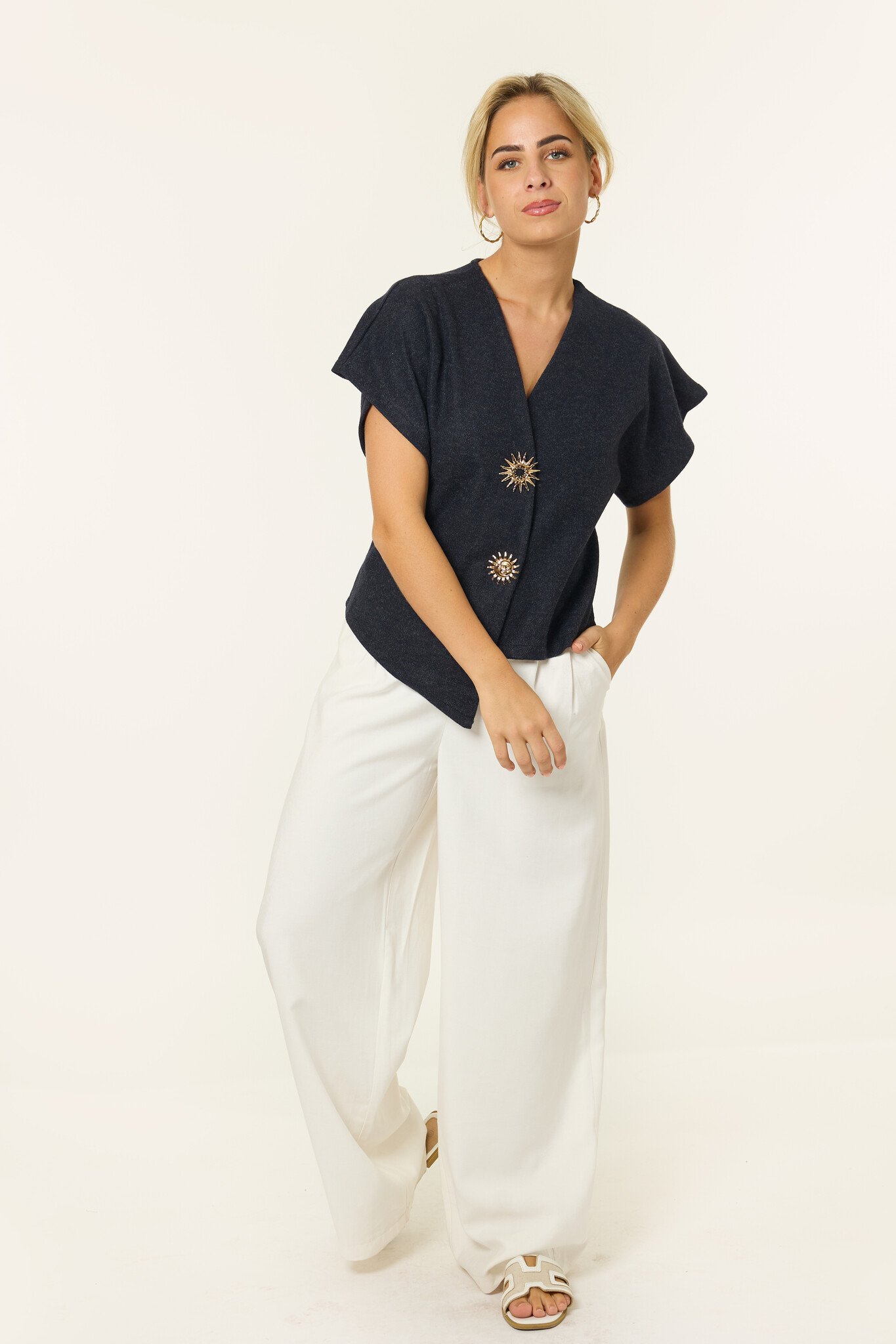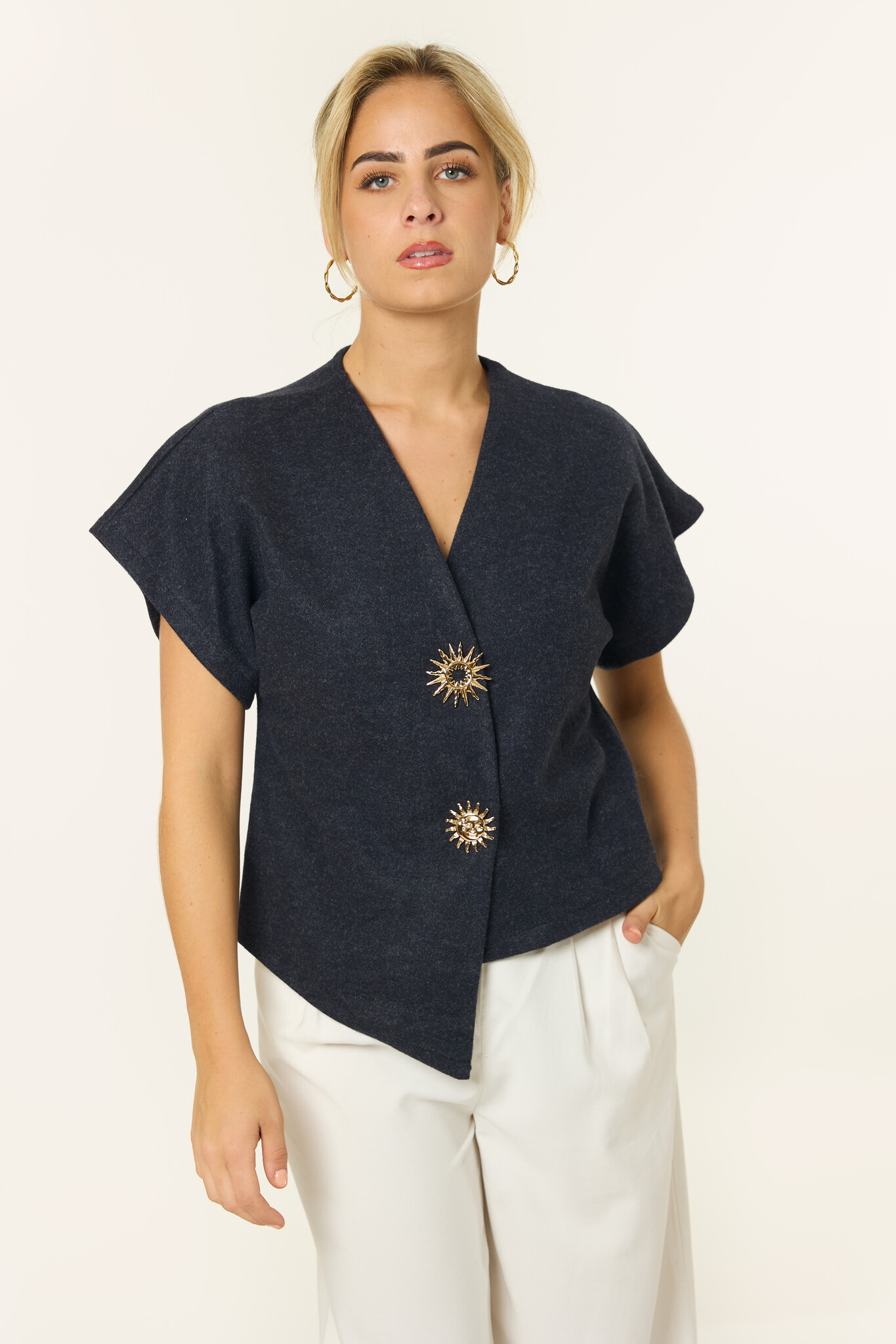 Deze donkerblauwe top krijgt net dat beetje extra door de gouden zonknopen aan de voorkant. Het zachte materiaal en de flatterende pasvorm maken de top perfect voor casual en party outfits. Combineer met een jeans voor alledaags of met een skort voor een girls night out.