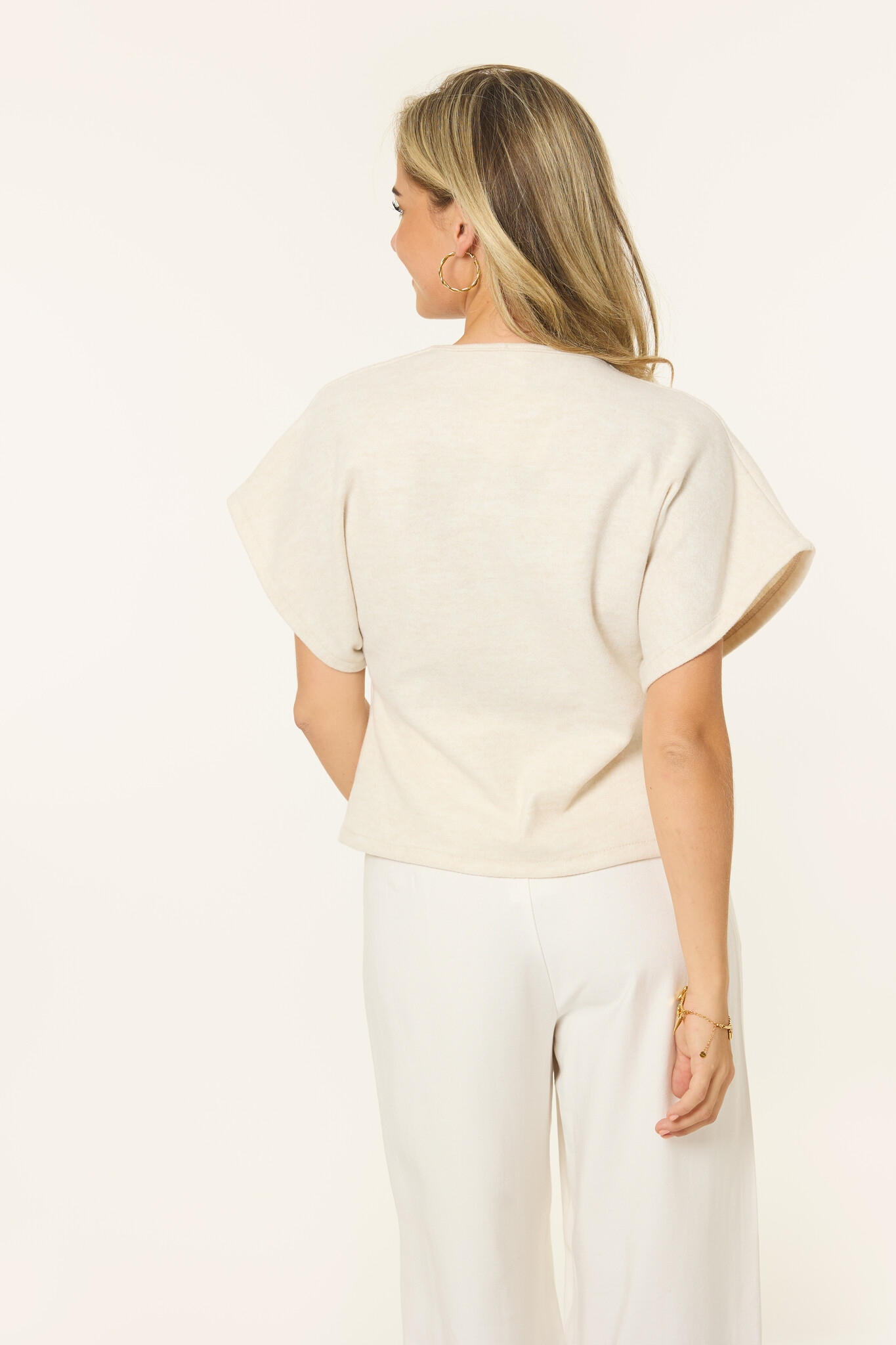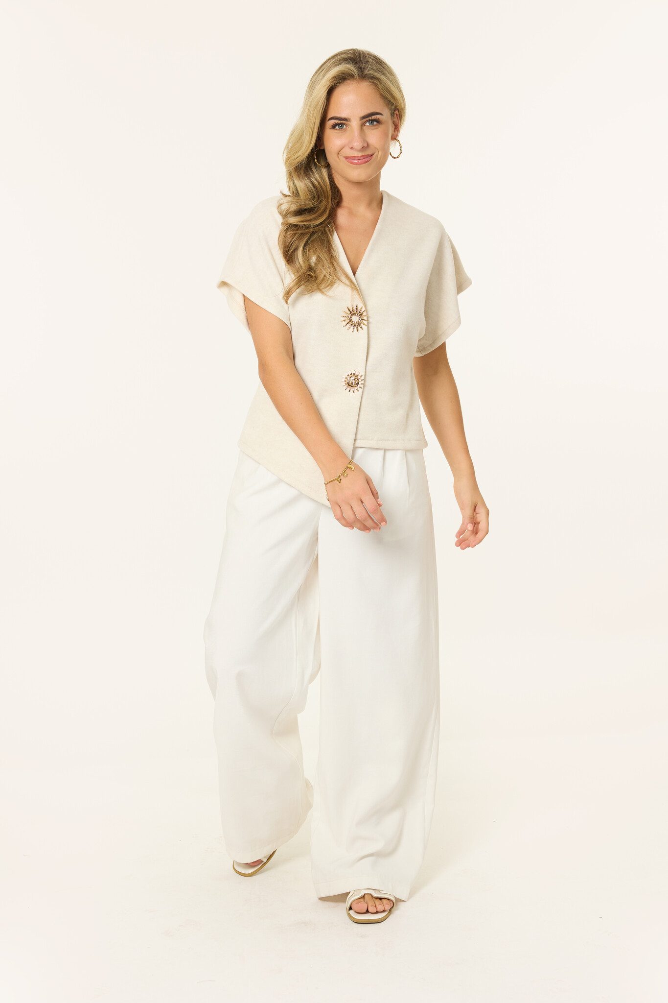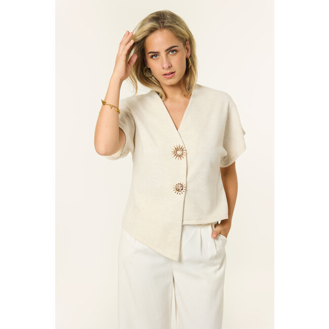 Deze off white top krijgt net dat beetje extra door de gouden zonknopen aan de voorkant. Het zachte materiaal en de flatterende pasvorm maken de top perfect voor casual en party outfits. Combineer met een jeans voor alledaags of met een skort voor een girls night out.