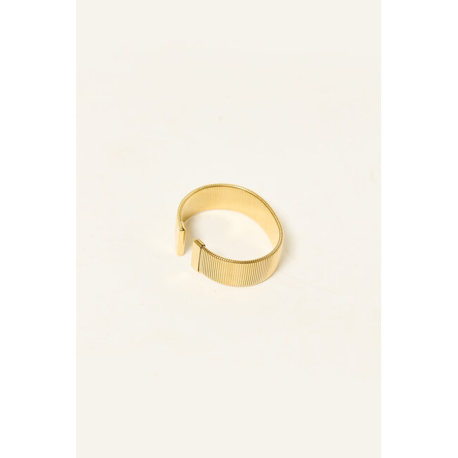 Deze goudkleurige cuff armband is een echte eyecatcher voor je outfit. Het brede model met subtiel ribbel detail geeft de armband een stijlvolle en trendy uitstraling. Perfect om los te dragen als statement piece of te combineren met meerdere gouden armbanden voor een trendy look.