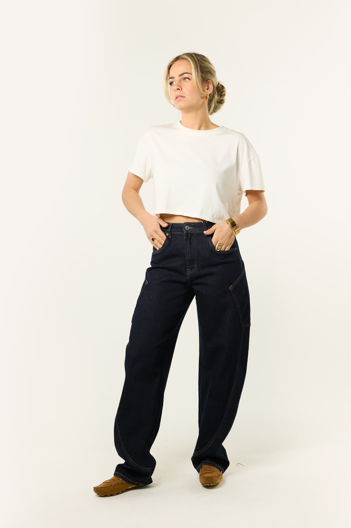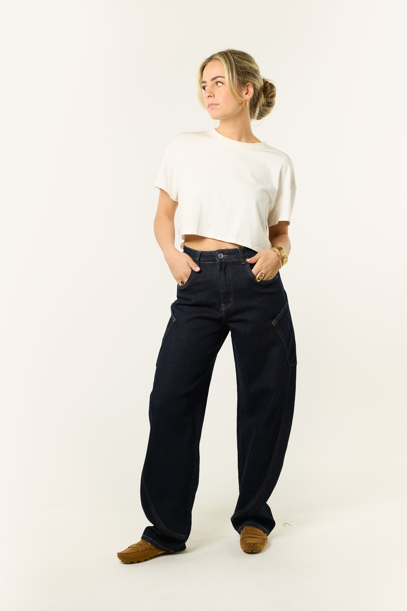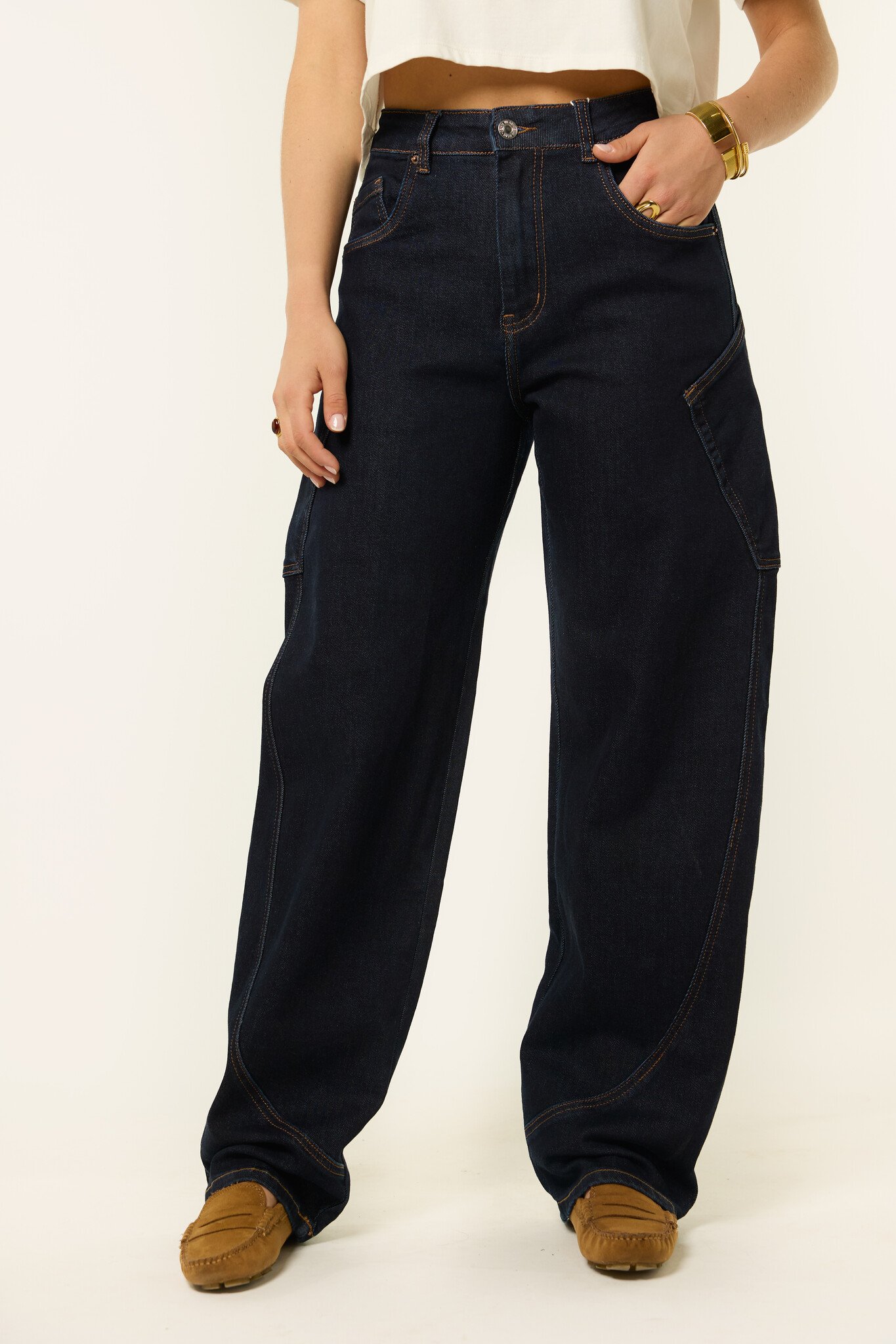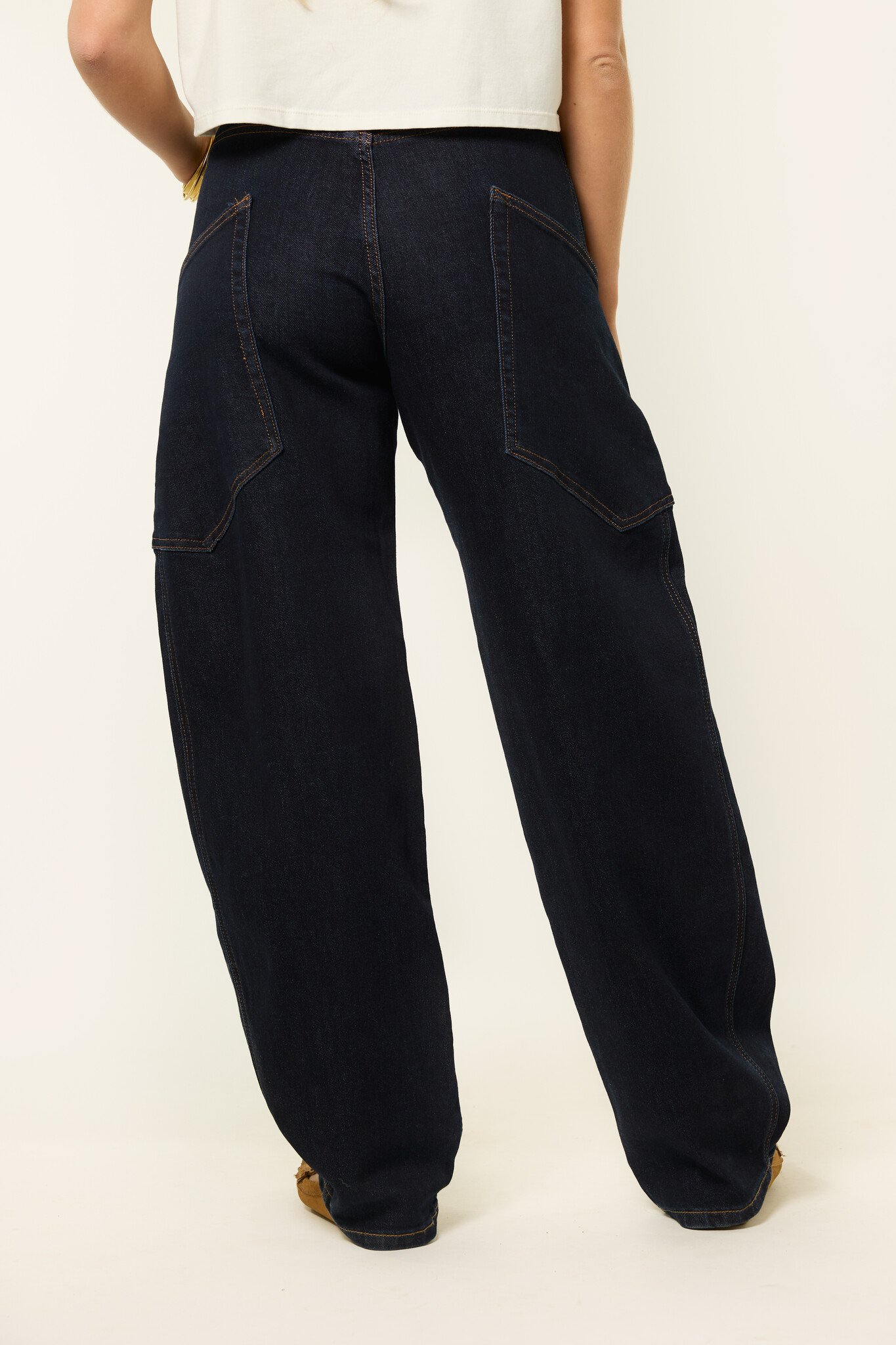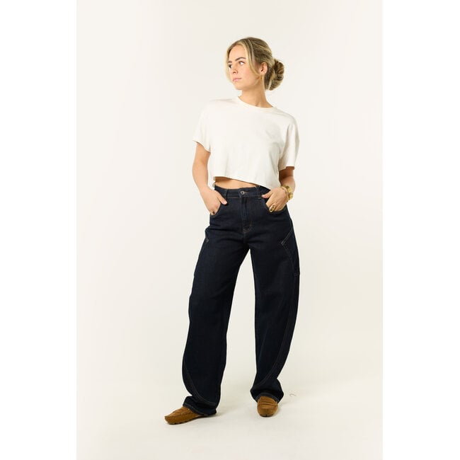 Deze donkerblauwe balloon jeans is een fijne basic met een trendy fit. De broek heeft een losse, wijde pasvorm en valt wat langer, wat zorgt voor een trendy look. De donkere denim maakt ’m makkelijk te combineren met al je favoriete items. Draag deze balloon jeans casual met een T-shirt of combineer ’m met een blouse of blazer voor een meer geklede look. Een comfortabele en veelzijdige jeans die je het hele seizoen door wilt dragen.