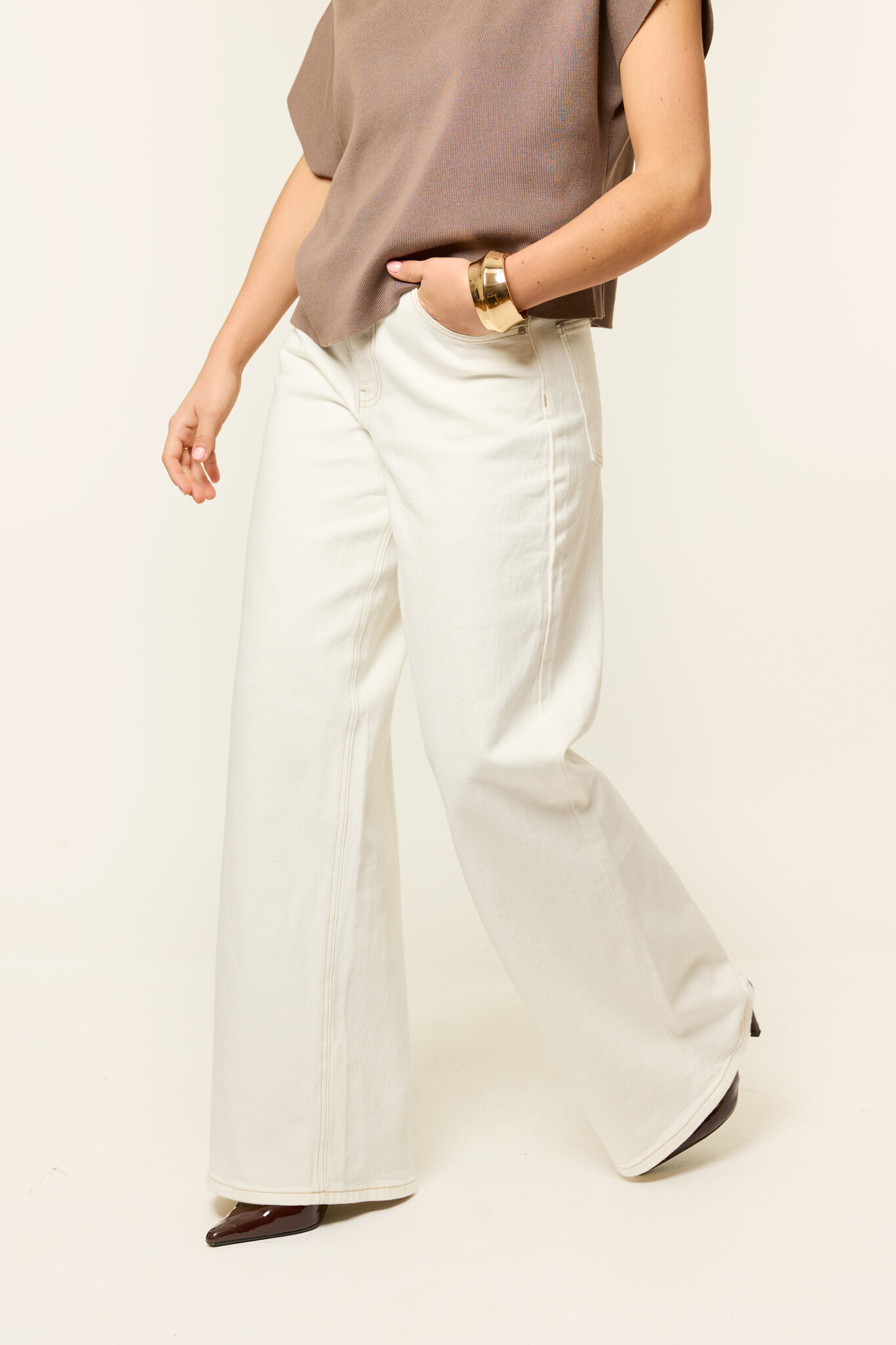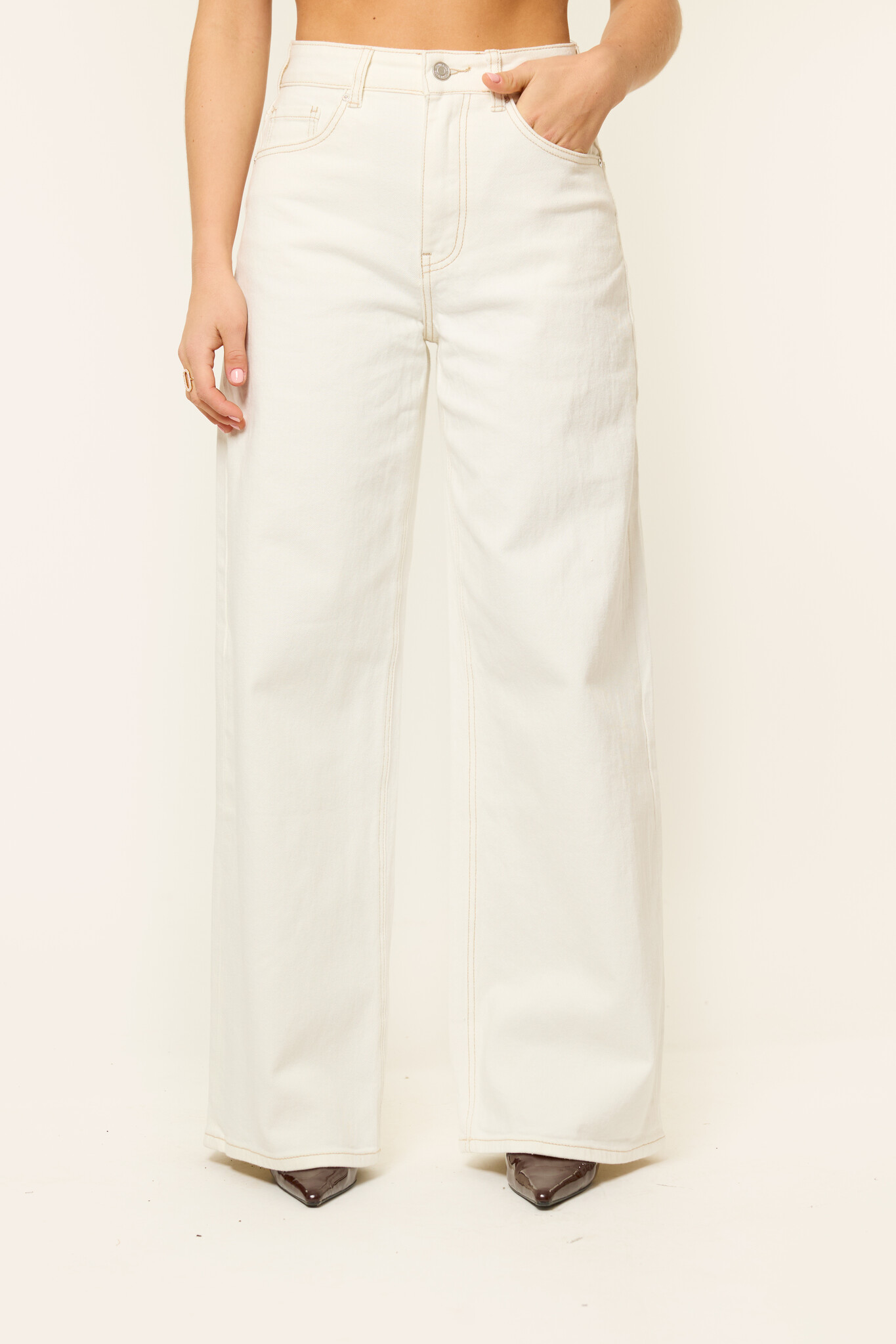 Deze off white wide leg jeans is perfect voor een comfy maar stijlvolle look. De high waist broek zit mooi aangesloten, terwijl de losvallende pijpen zorgen voor die typische wide leg fit. De witte denim wassing maakt de broek makkelijk te combineren met alles in je kast: van een oversized trui tot een leuke longsleeve body. Een echte musthave als je houdt van die effortless, casual stijl.