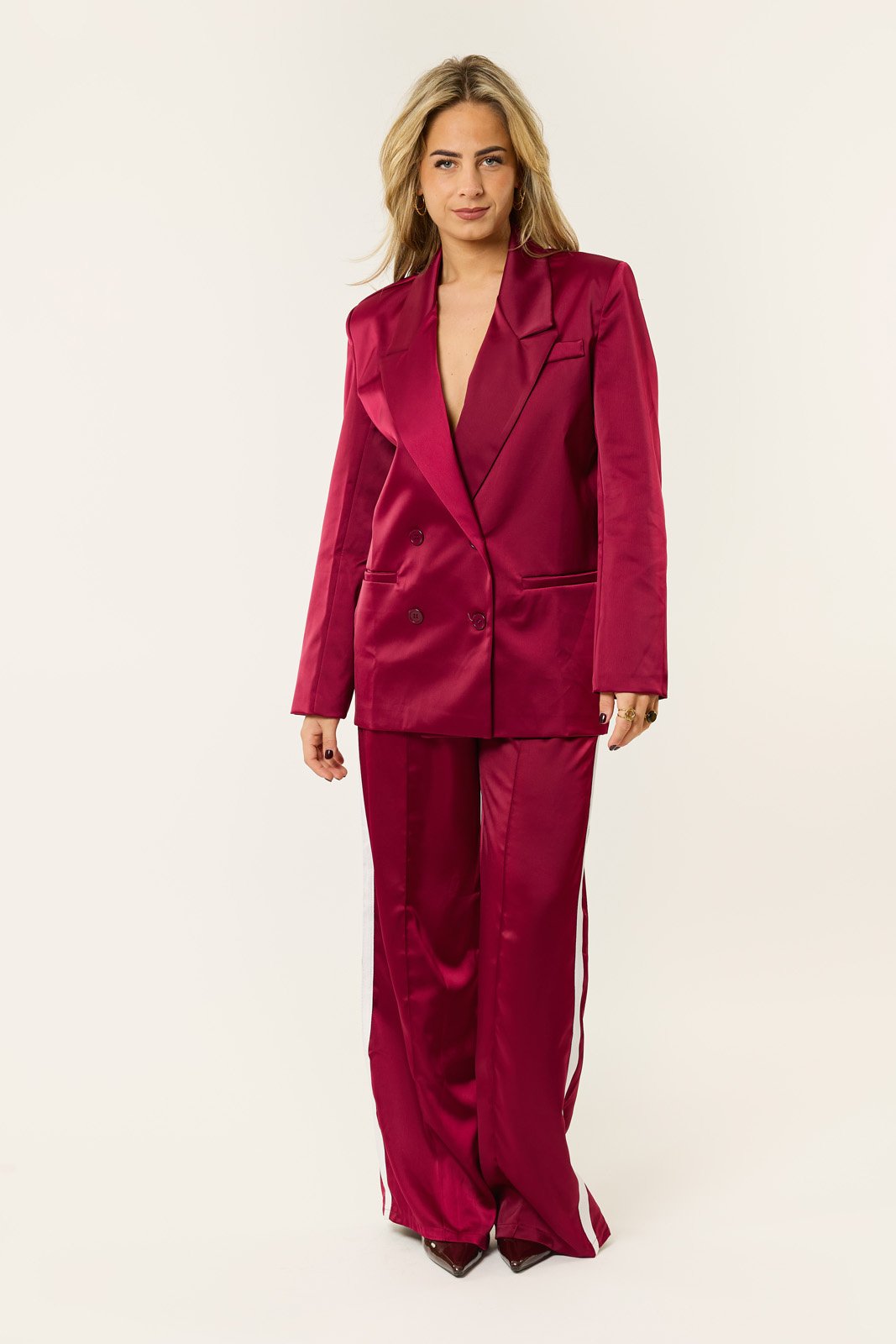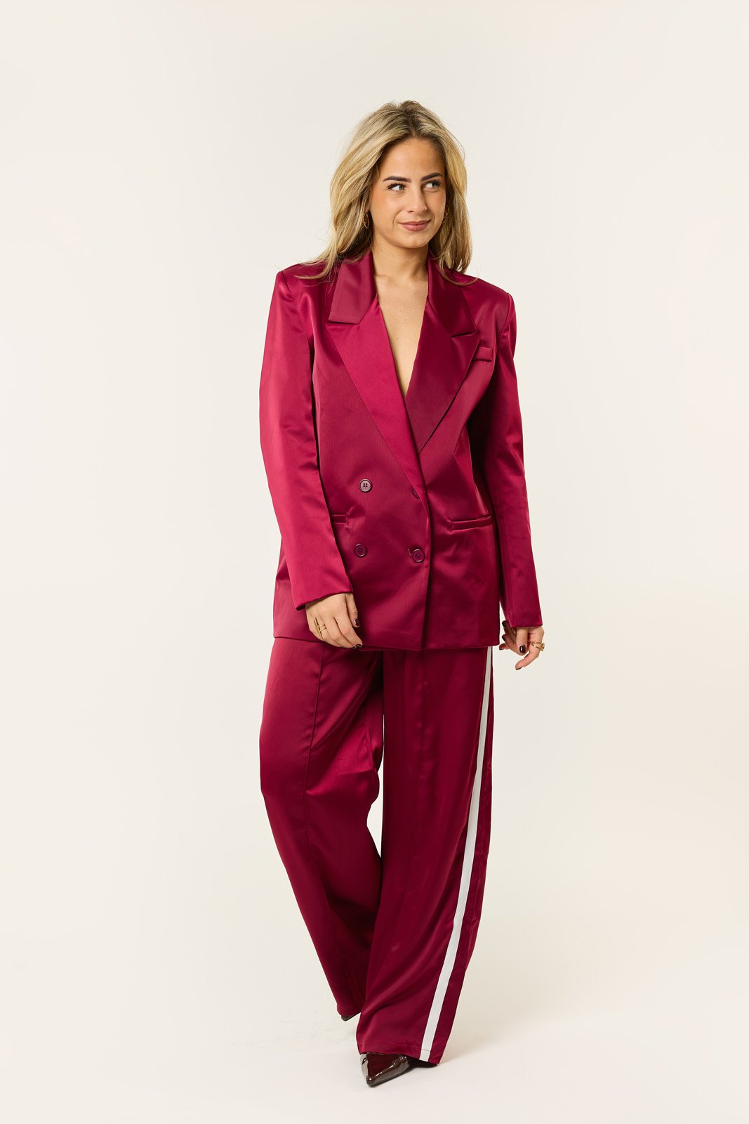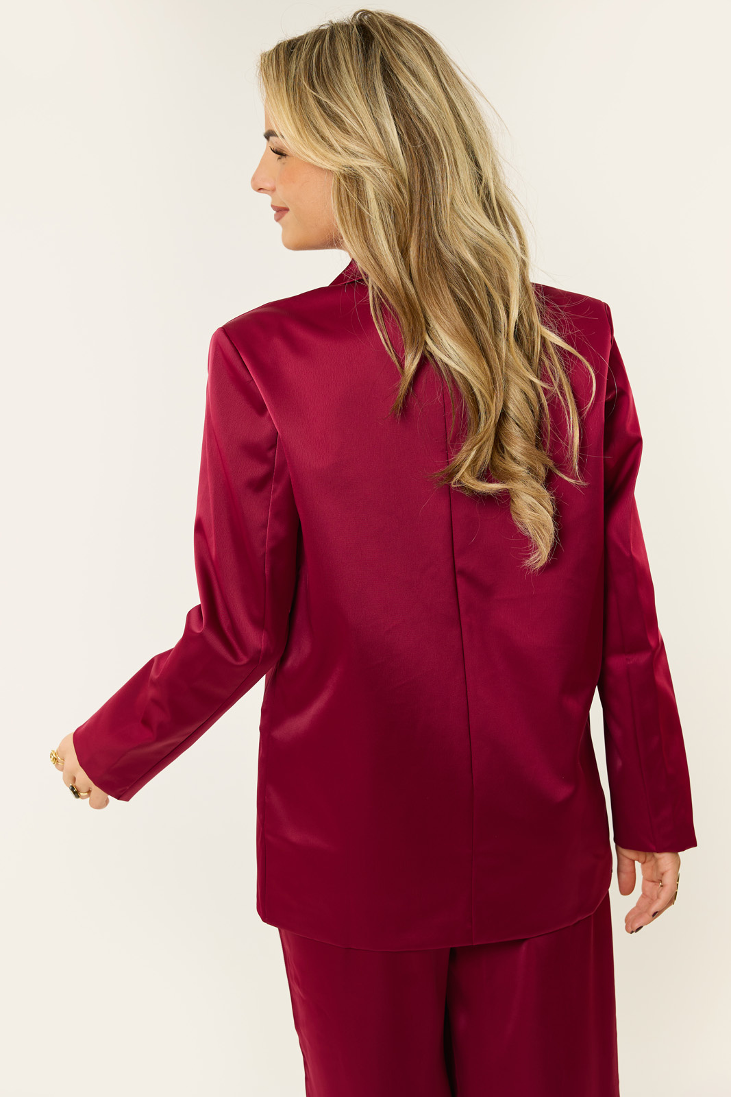 Deze burgundy satijnen blazer is de perfecte combinatie van chic en stoer. De glanzende finish geeft een luxe uitstraling, terwijl de oversized fit zorgt voor een moderne, nonchalante look. Dankzij de double-breasted knoopsluiting kun je hem zowel dicht als open dragen, als blazer over een top, of als jurk met laarzen voor een avondje uit. Een echte musthave voor het najaar.
