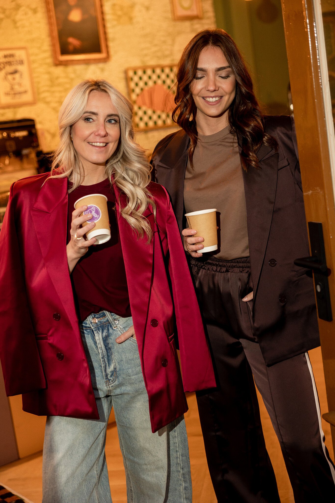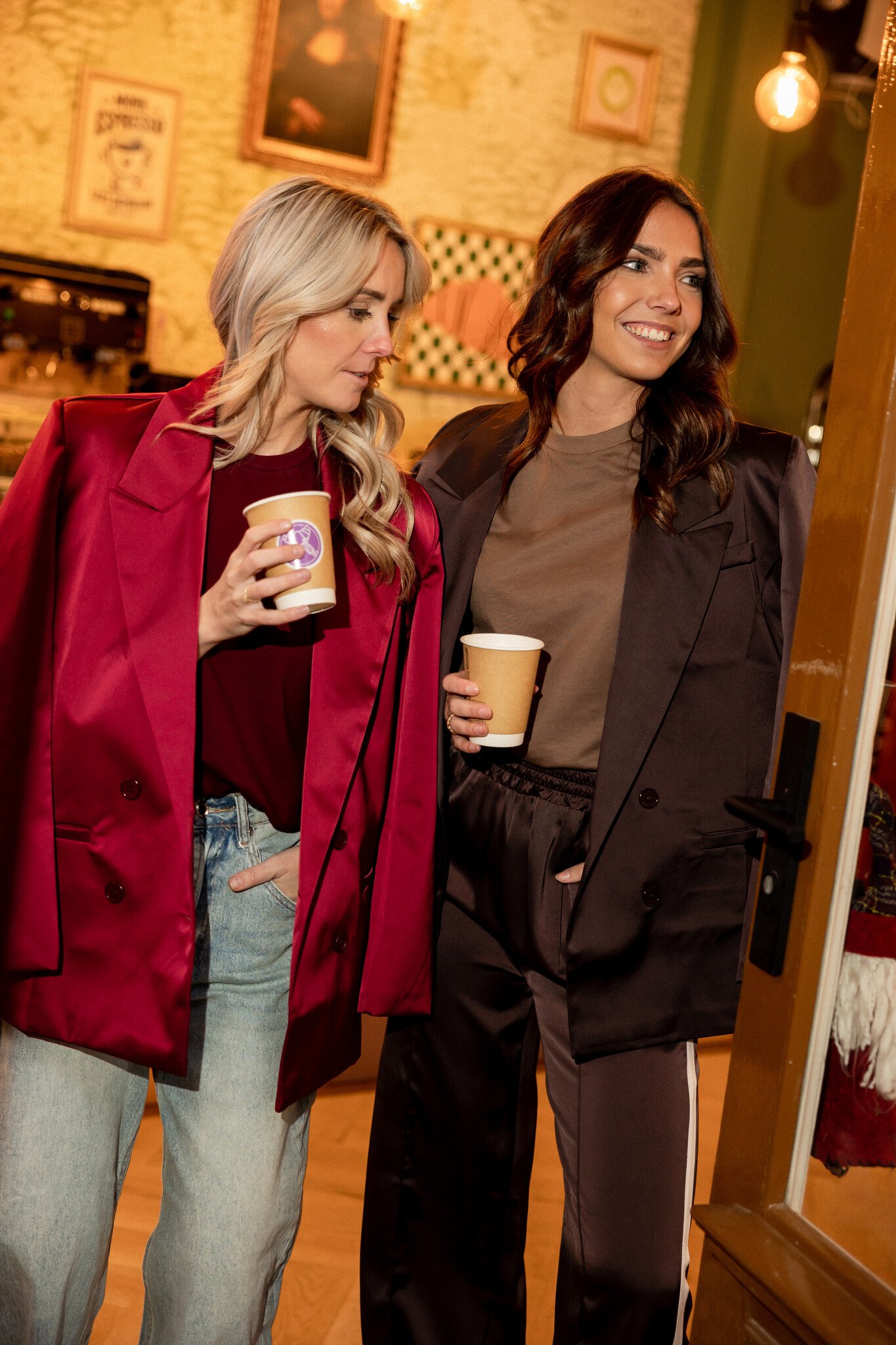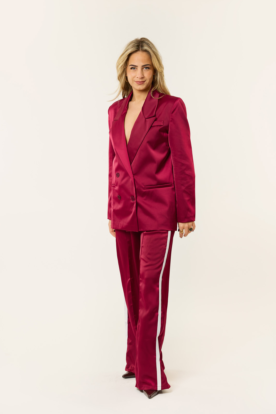 Deze burgundy satijnen blazer is de perfecte combinatie van chic en stoer. De glanzende finish geeft een luxe uitstraling, terwijl de oversized fit zorgt voor een moderne, nonchalante look. Dankzij de double-breasted knoopsluiting kun je hem zowel dicht als open dragen, als blazer over een top, of als jurk met laarzen voor een avondje uit. Een echte musthave voor het najaar.