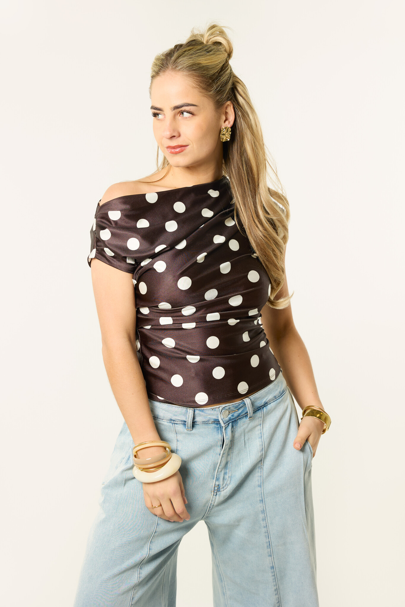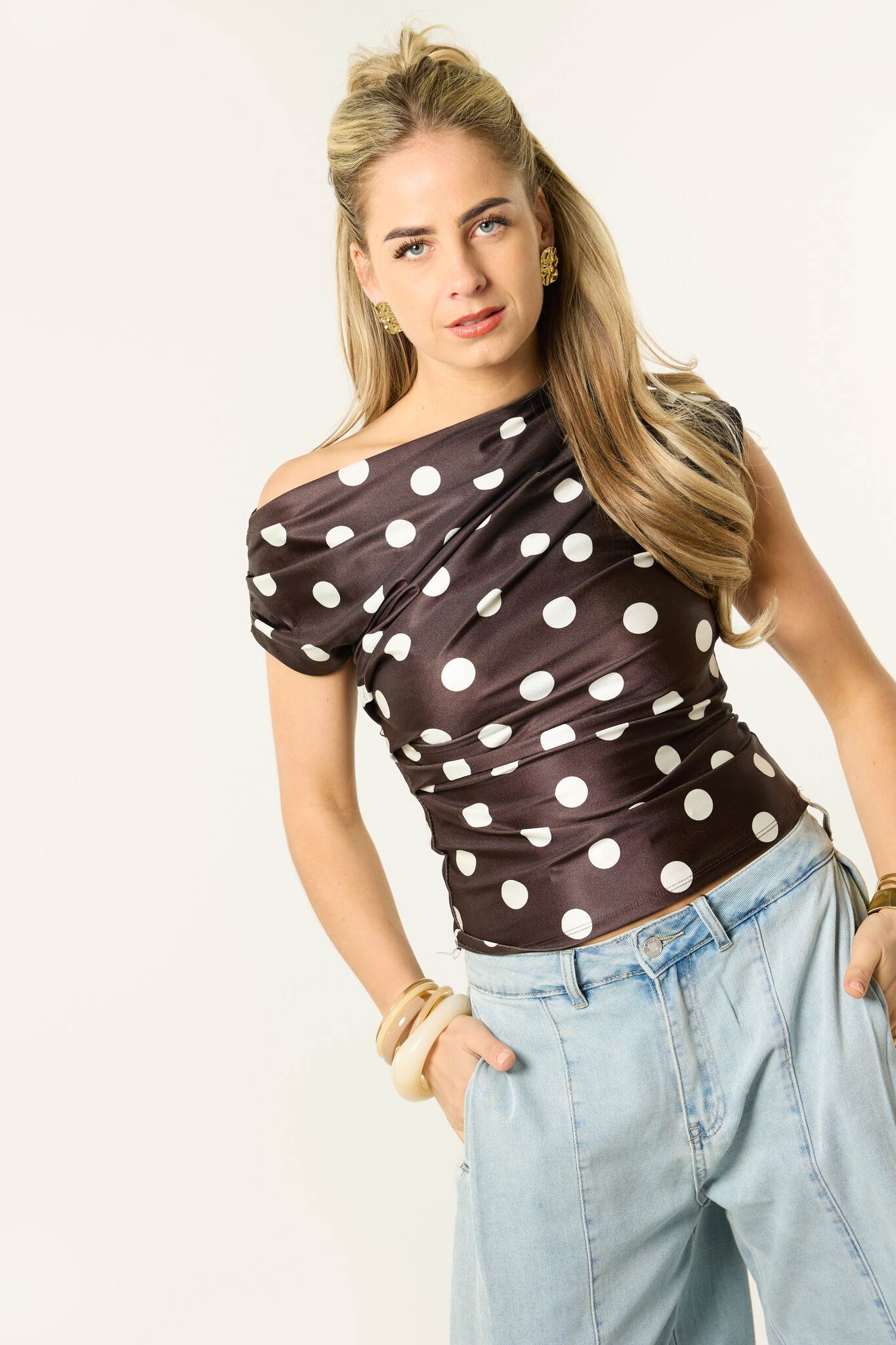 Deze bruine stippen top is een echte eye-catcher. De polka dot top heeft een mooie aansluitende fit en een speelse off shoulder halslijn, wat zorgt voor een vrouwelijke en trendy look. De donkerbruine top met witte stippen geeft je outfit meteen een stijlvolle en fashionable uitstraling.
