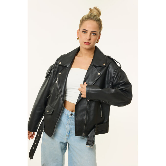 Deze zwarte faux-leather biker jacket is een absolute musthave voor een stoere, stijlvolle look. De oversized fit en zilverkleurige details geven dat echte bikergevoel, terwijl de zachte binnenkant lekker comfortabel zit. Dankzij de tijdloze uitstraling kun je de jacket eindeloos combineren, van een basic tee en jeans tot een jurkje met laarzen. Een krachtig statement piece dat elke outfit nét even cooler maakt.