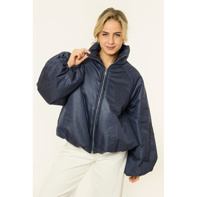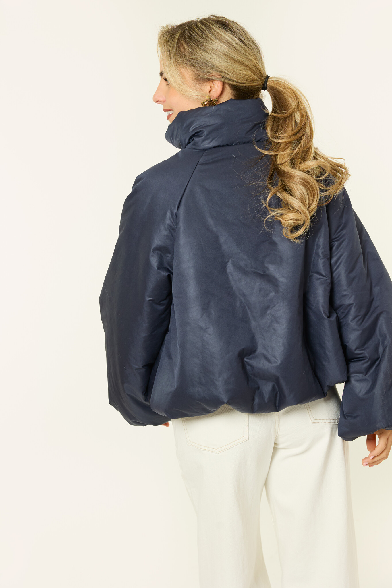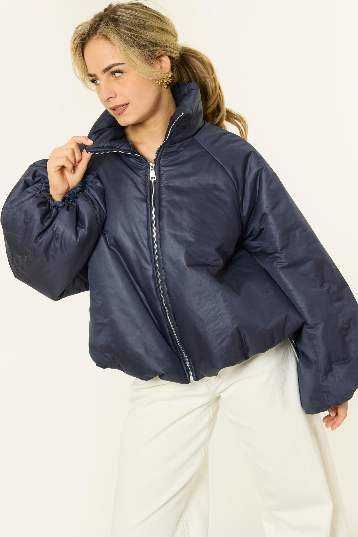 Deze korte dames puffer jas in het donkerblauw is perfect voor frisse dagen waarop comfort en stijl samenkomen. De puffy fit en het oversized model zorgen voor een moderne look die makkelijk te combineren is met elke outfit. Deze navy dames bomberjas is ideaal als tussenjas of lichte winterjas en geschikt voor dagelijks gebruik. Een fijne, comfortabele jas voor wie houdt van een trendy dames jas die zowel praktisch als modieus is.
