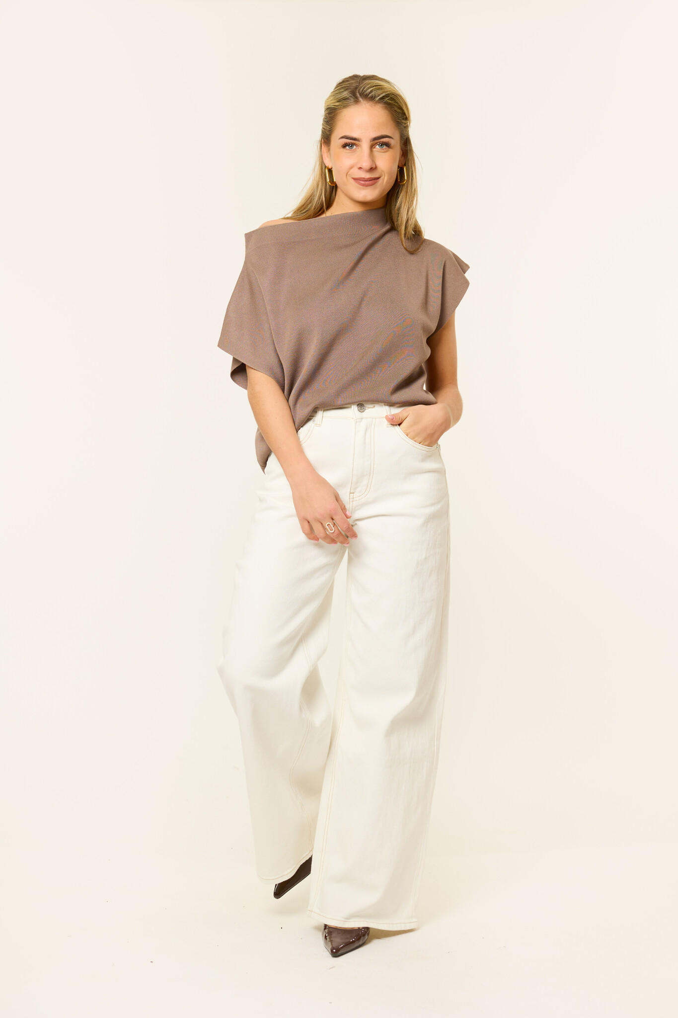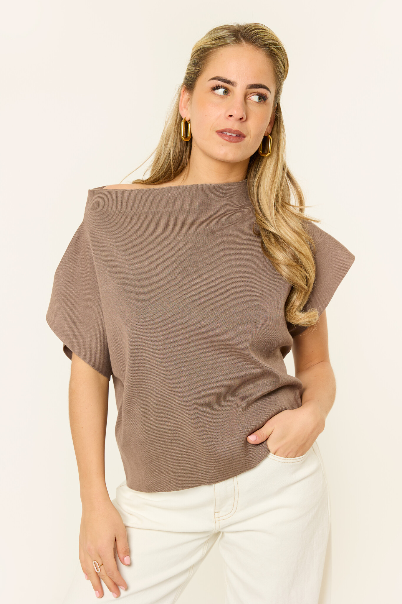 Deze one shoulder top in een warme taupe/bruin is zo’n item dat je overal bij pakt. De fijne ribstof voelt zacht en comfortabel aan en valt mooi los om het lichaam, terwijl de one shoulder halslijn meteen zorgt voor een vrouwelijke en stijlvolle touch. De korte mouwen maken de top perfect voor elk seizoen en makkelijk te combineren. Draag het shirt casual op een jeans voor een effortless look, of combineer met een pantalon of rok voor een nette outfit. Een tijdloze basic met nét dat beetje extra.