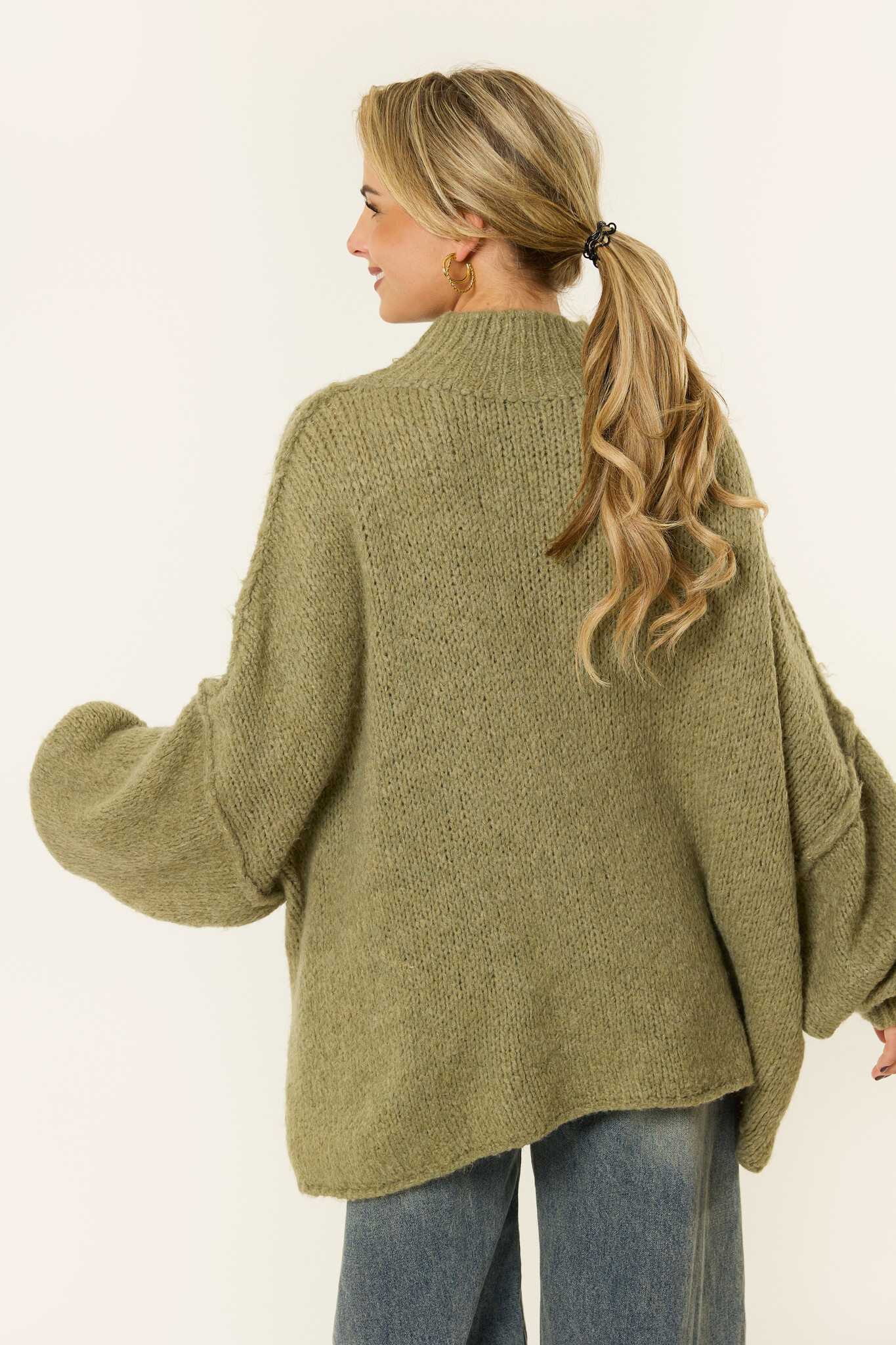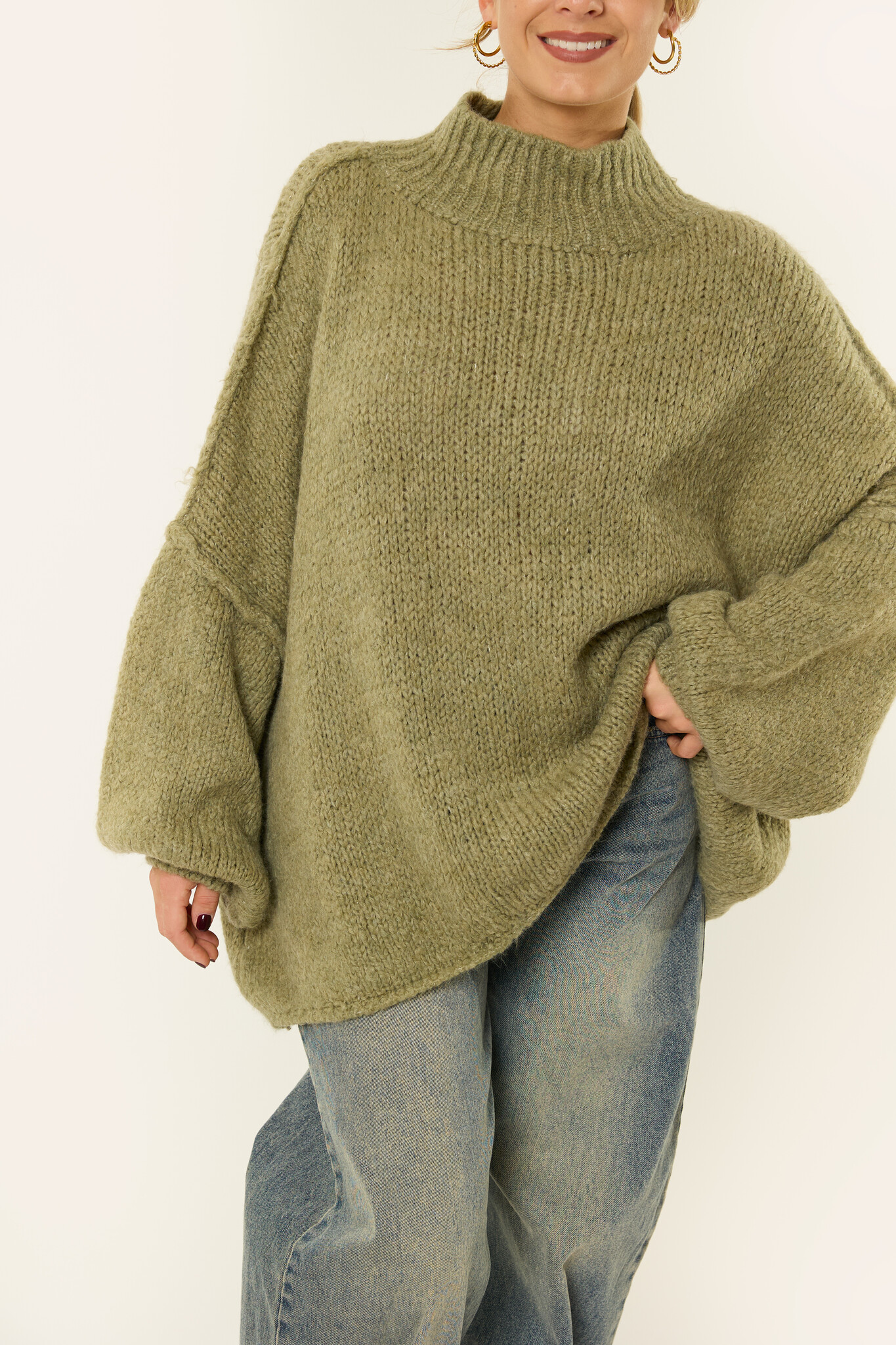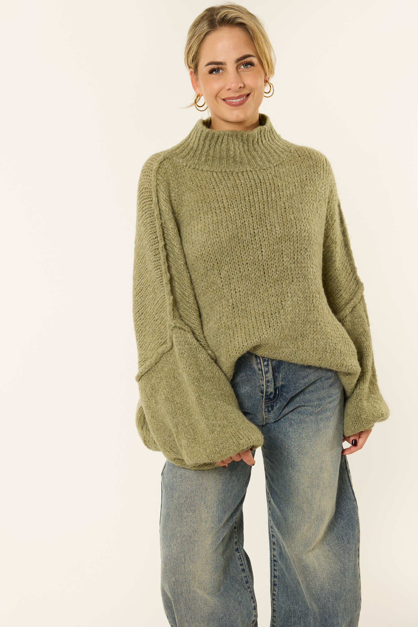Deze olijfgroene trui is zo’n zachte, cozy musthave voor het najaar. De trui heeft een hoge kraag, extra wijde mouwen en een relaxed, iets oversized model dat heerlijk comfy zit. De knit voelt warm aan zonder te zwaar te zijn, waardoor je de sweater makkelijk styled met een jeans of pantalon. Ideaal voor koude dagen waarop je er én leuk uit wilt zien én lekker wilt zitten.