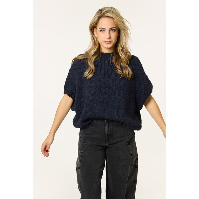 Deze donkerblauwe gehaakte trui met korte mouwen is een echte must-have voor het najaar. Het luchtige gehaakte design geeft een casual maar toch stijlvolle uitstraling en is super makkelijk te combineren met jeans, shorts of een rokje. Perfect voor je nieuwe autumn wardrobe.