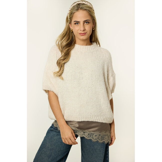 Deze off white gehaakte trui met korte mouwen is een echte must-have voor het najaar. Het luchtige gehaakte design geeft een casual maar toch stijlvolle uitstraling en is super makkelijk te combineren met jeans, shorts of een rokje. Perfect voor je nieuwe autumn wardrobe.