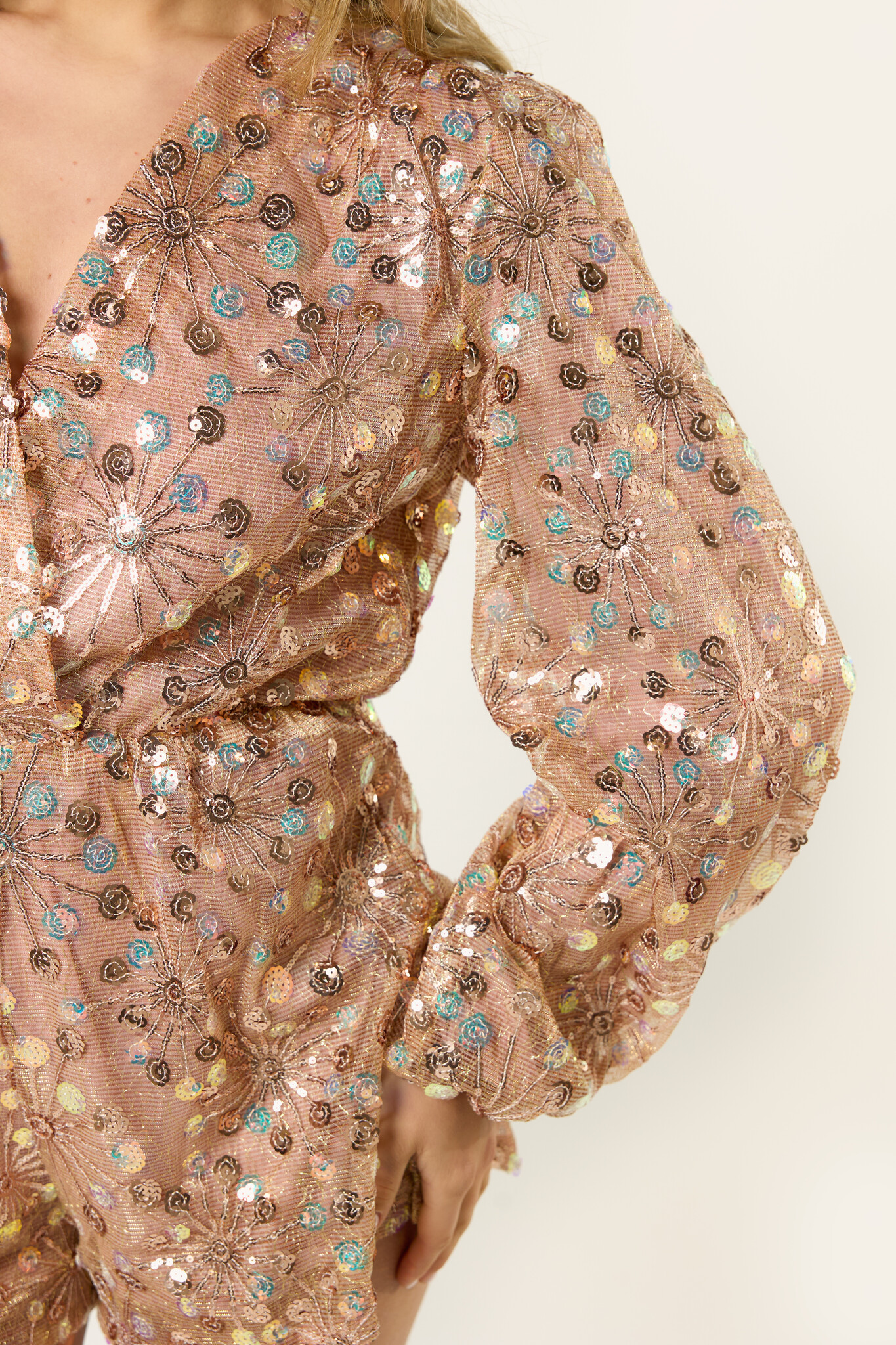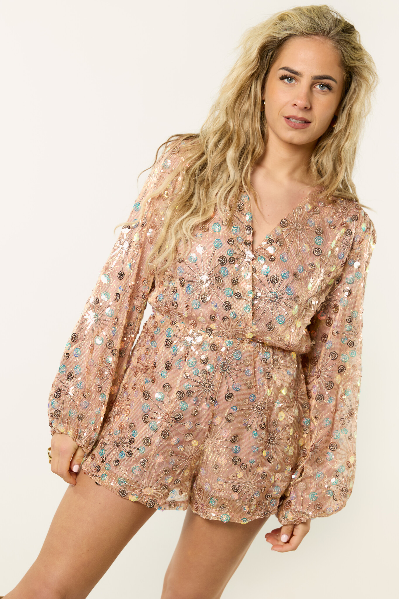 Deze rosé gouden glitter playsuit is zo’n outfit die meteen alle aandacht trekt. De playsuit heeft een mooie glans en een opvallend patroon, waardoor hij perfect is voor een feestje, diner of speciale gelegenheid. De vrouwelijke pasvorm en de subtiele glitter details geven deze rosé gold playsuit een elegante en feestelijke uitstraling. Combineer de glitter playsuit met hakken en sieraden voor een complete party look.