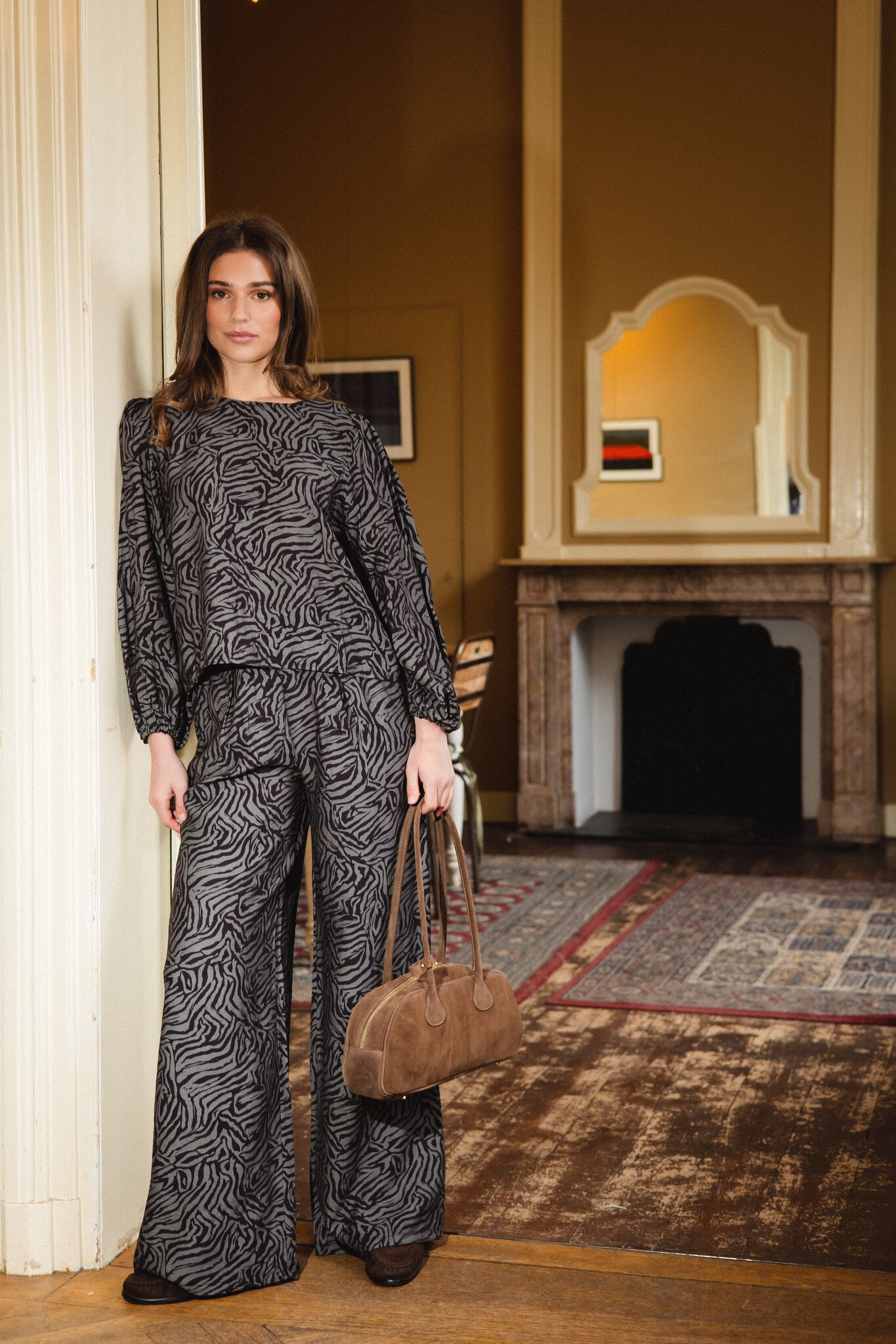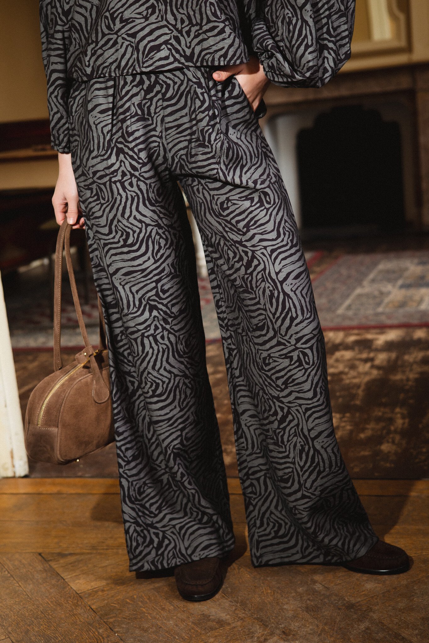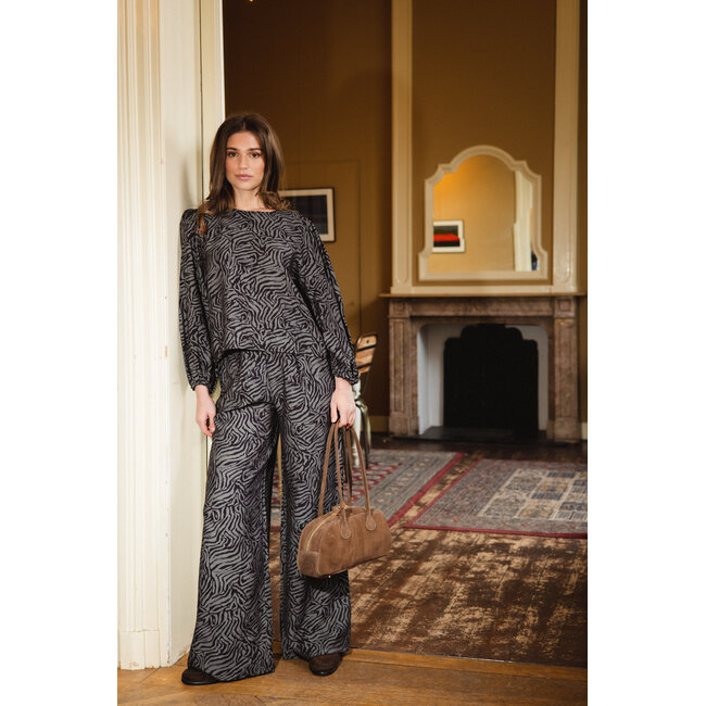 Deze zebra print broek is zo’n item die je outfit meteen af maakt. De zwart-grijze animal print geeft een mooie, opvallende maar toch rustige look. De wide leg pasvorm en de soepelvallende stof zorgen ervoor dat hij comfortabel zit en mooi valt. Draag ’m los met een basic top of combineer met de bijpassende zebra print top voor een complete set. Een fijne broek die net even anders is, maar toch makkelijk te stylen is.