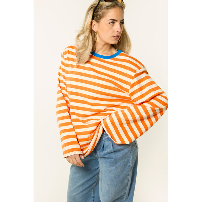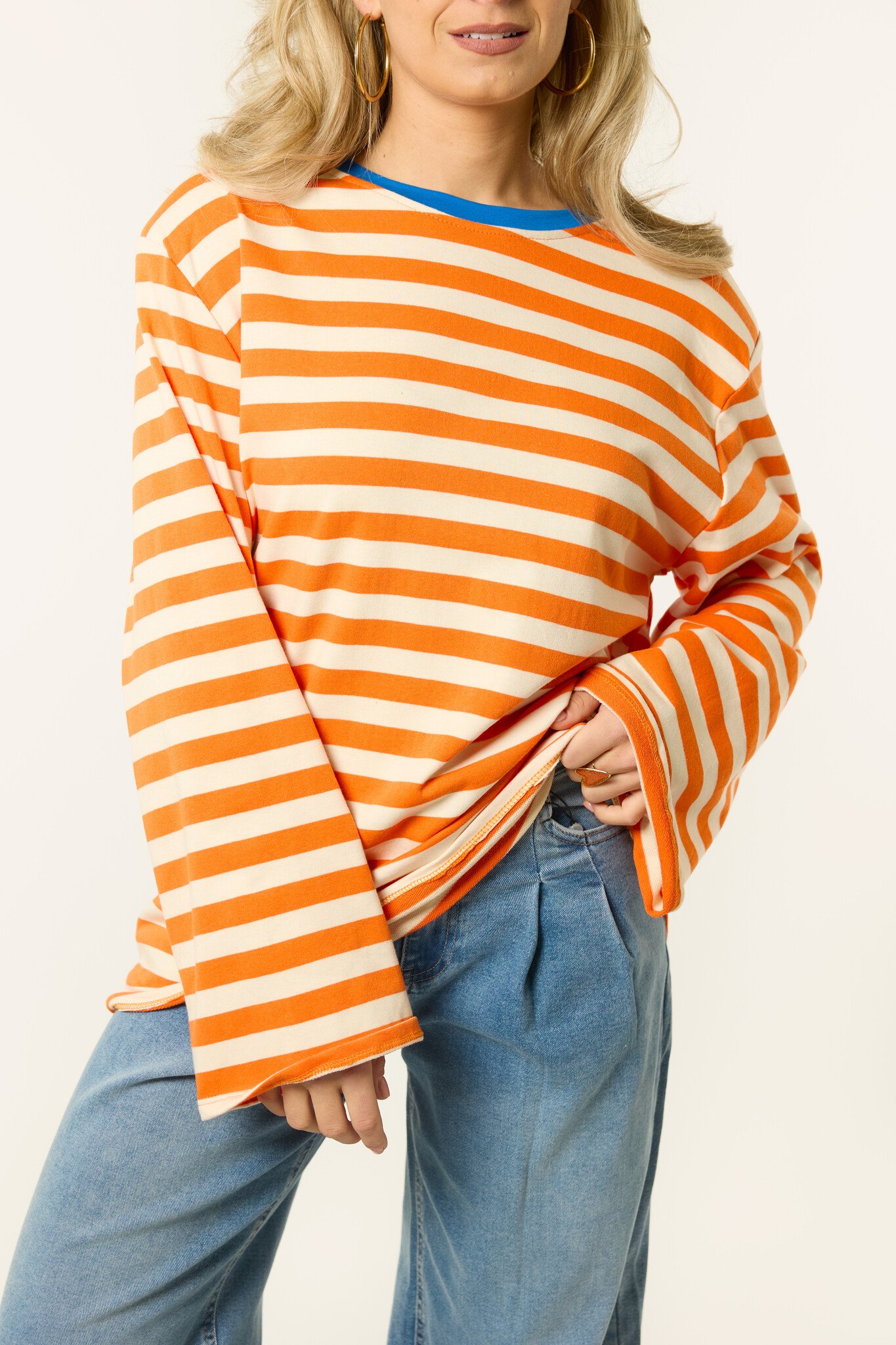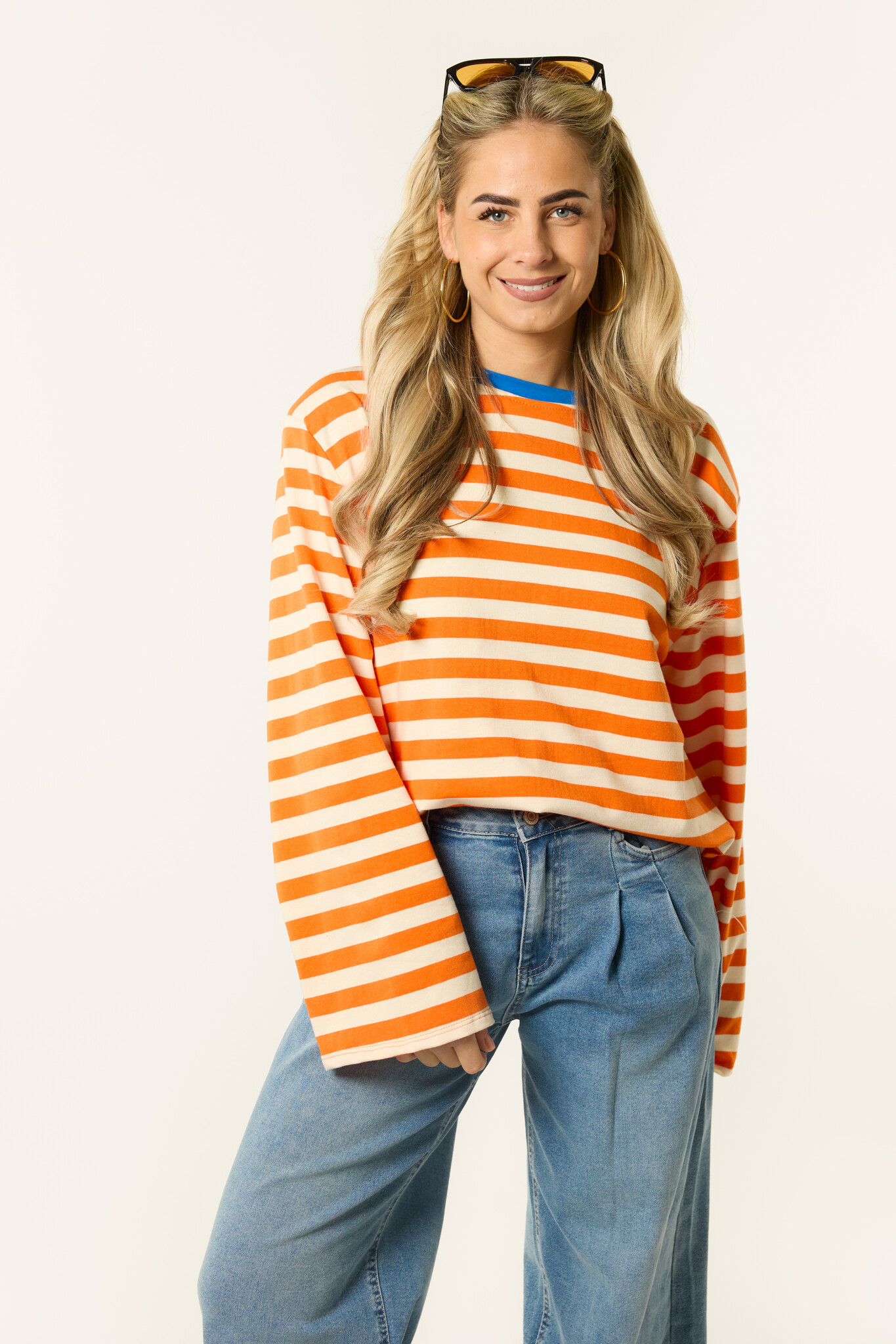 Op zoek naar een leuke Koningsdag outfit? Deze oranje/off white gestreepte longsleeve is daar perfect voor. De gestreepte longsleeve met oranje strepen en blauwe halsrand geeft een vrolijke en trendy look. Combineer deze oranje gestreepte top met een jeans, rok of short voor een leuke Koningsdag look. Ook daarna nog leuk te dragen als casual gestreepte top.