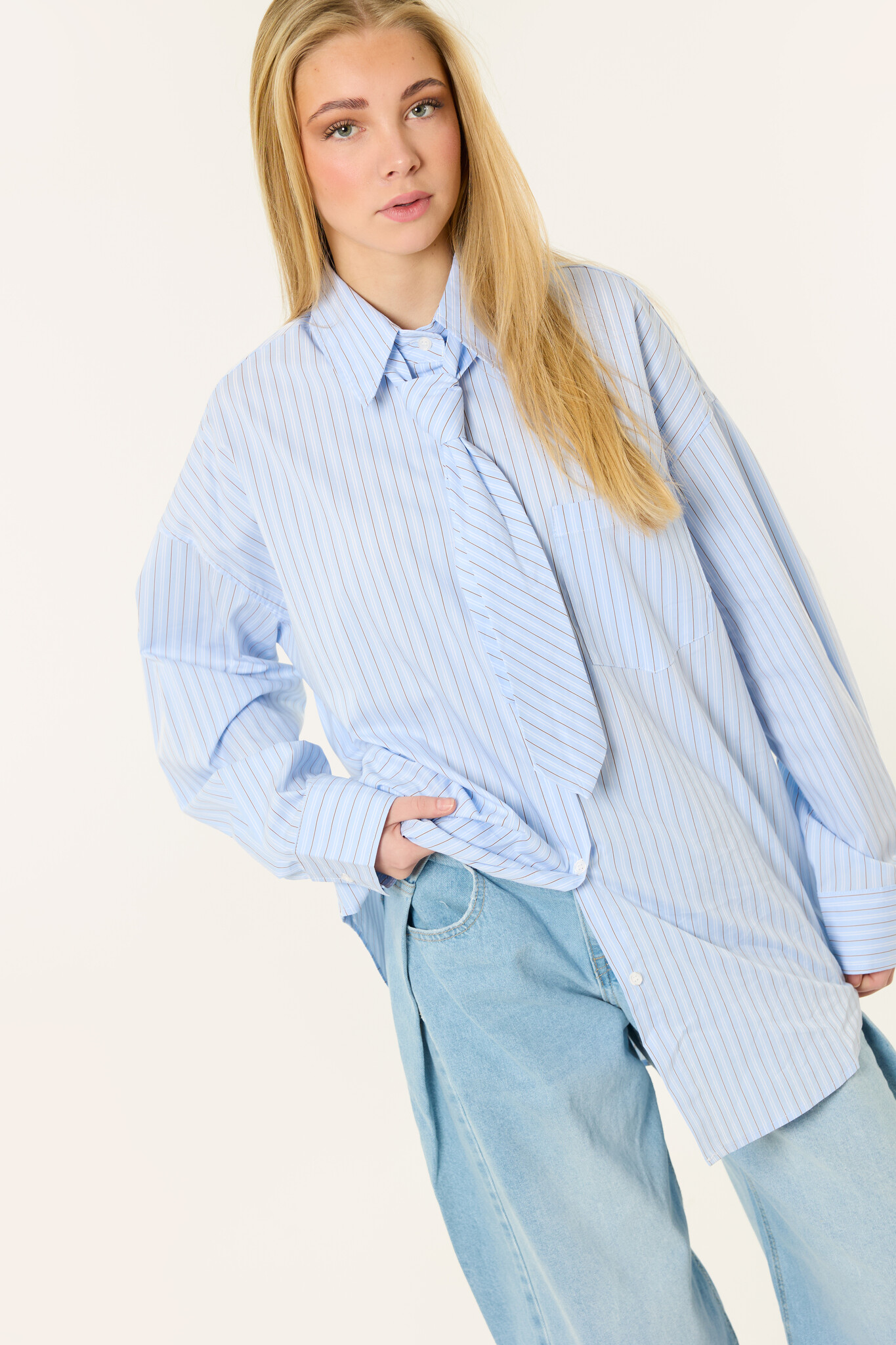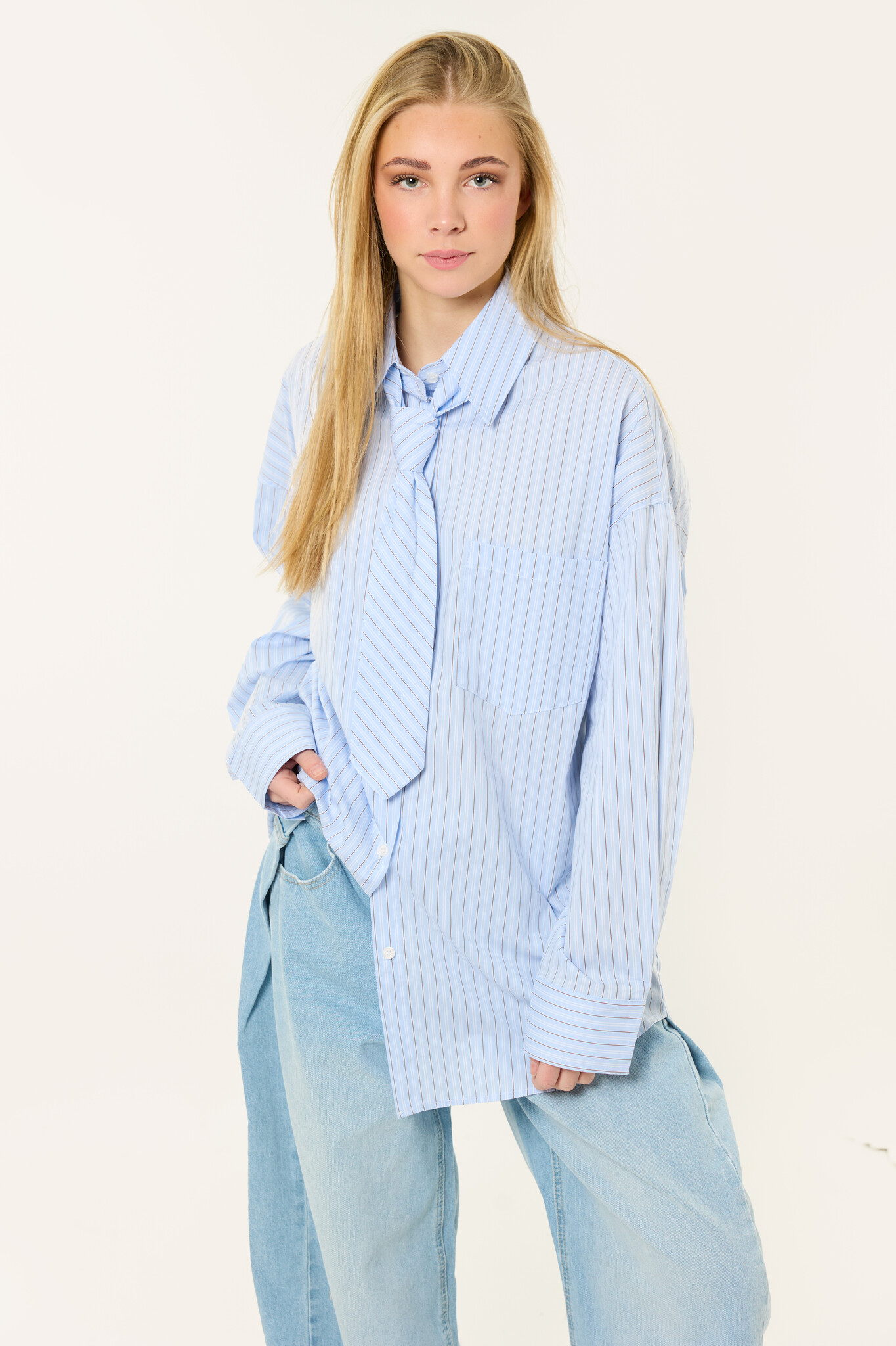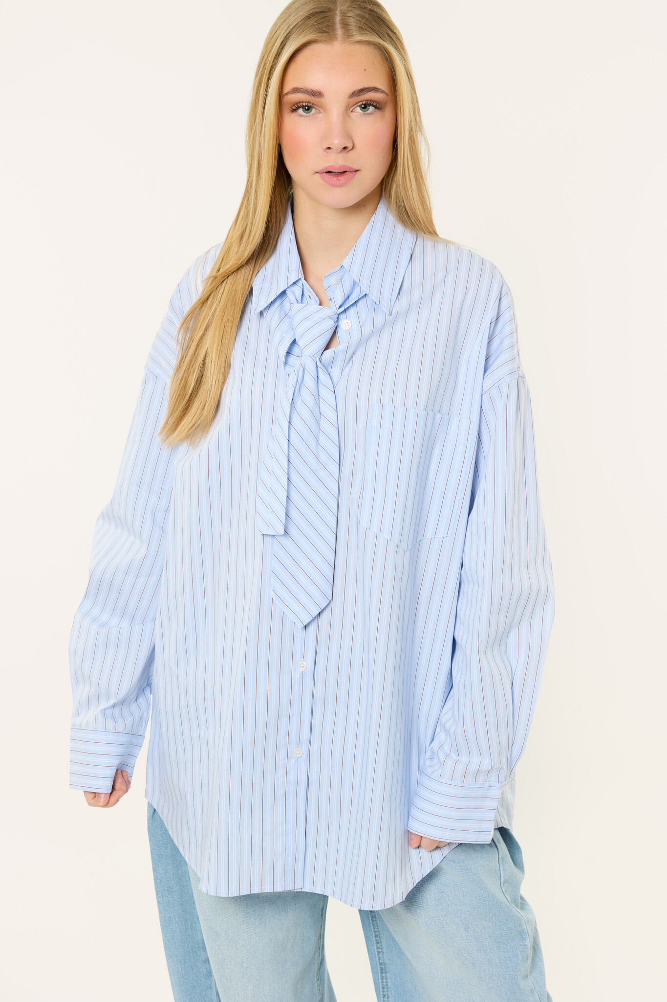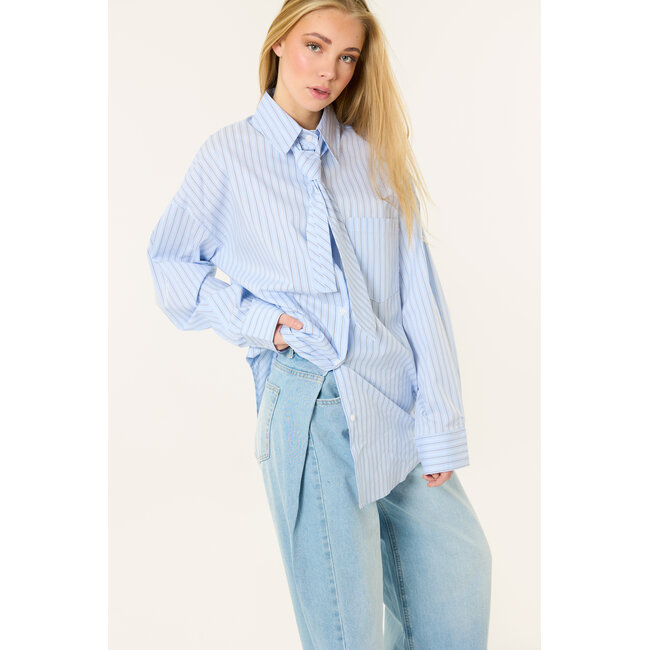 Deze blauwe streepjes blouse met stropdas is een echte eyecatcher en perfect voor een trendy look. De blouse heeft een oversized pasvorm, lange mouwen en een kraag, wat zorgt voor een stijlvolle en comfortabele fit. Het stropdas detail geeft de blouse een unieke en trendy look.