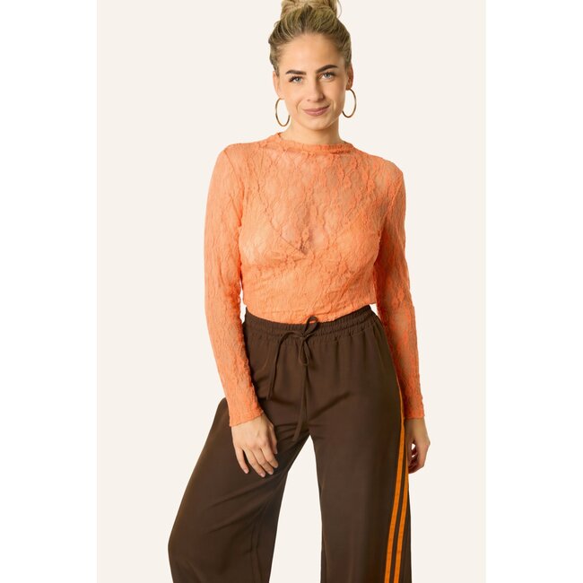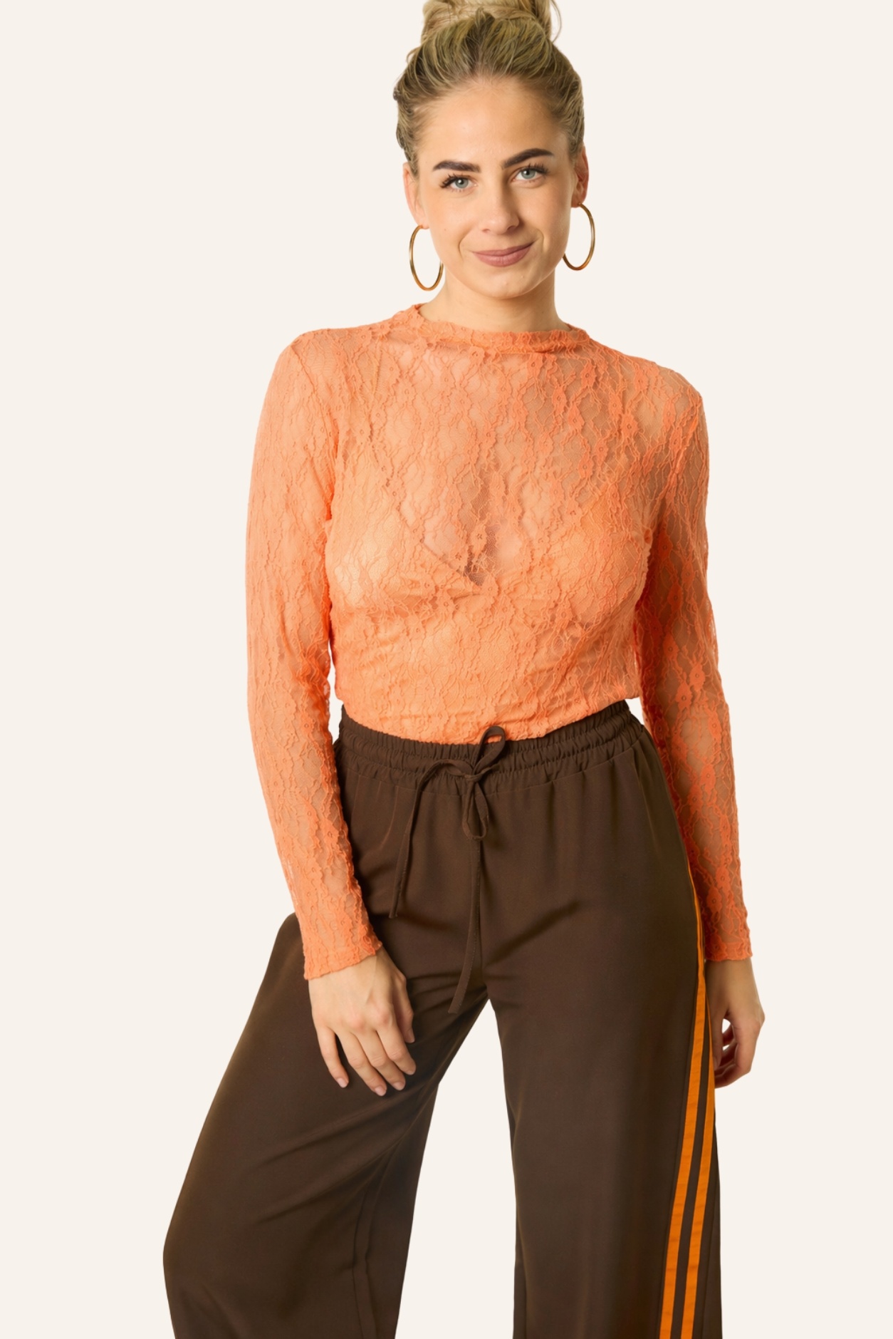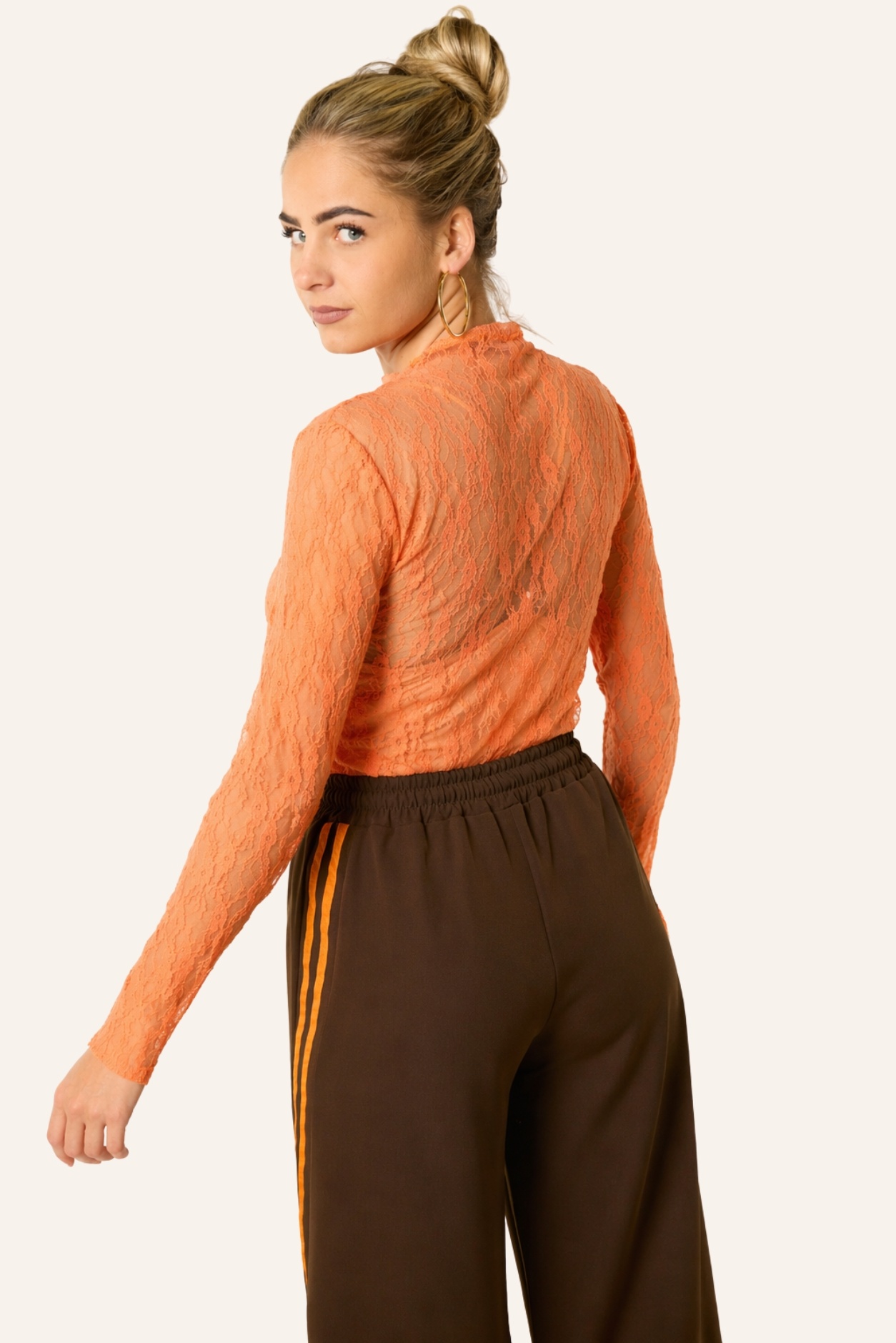 Deze oranje kanten body is een echte eyecatcher. De transparante lace stof en de lange mouwen geven de body een vrouwelijke en trendy uitstraling. De oranje kanten top is perfect voor Koningsdag, maar ook daarna nog leuk te dragen. Combineer de top met een jeans, pantalon of rok voor een stijlvolle outfit. Een trendy kanten top die je look meteen net wat specialer maakt.