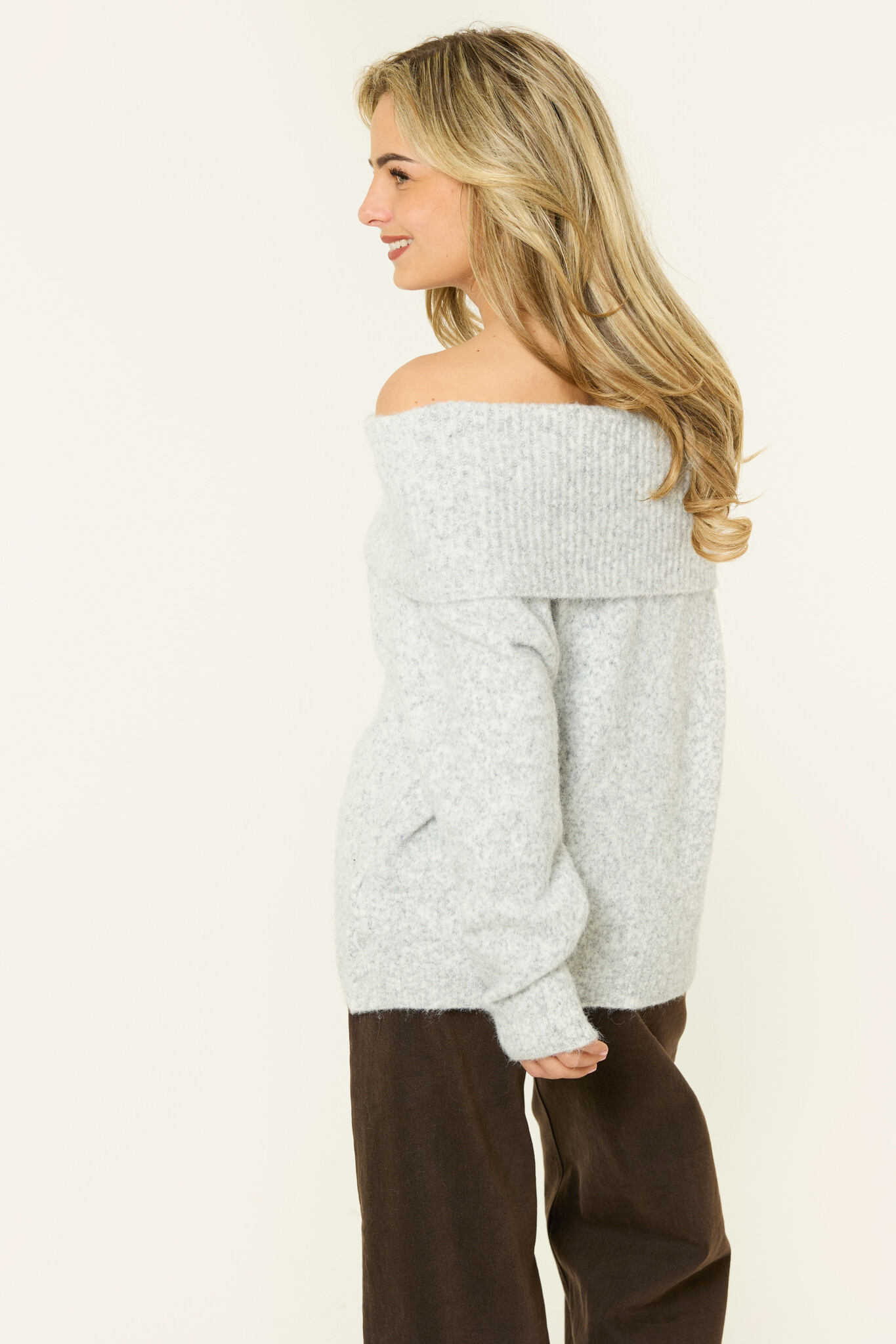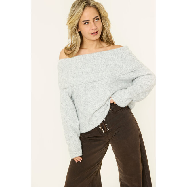 Deze grijze off-shoulder trui is echt zo’n trui die je meteen uit de kast pakt als je iets comfy maar toch leuks aan wilt. Door de brede omslaghals draag je de gebreide trui off shoulder, wat zorgt voor een zachte, vrouwelijke look zonder dat het té is. Gewoon relaxed, maar wel stijlvol. De stof is lekker zacht en warm en de fit valt losjes, waardoor de knit super comfortabel zit. Perfect voor een casual dag met een jeans, maar ook heel leuk met een rokje of nette broek als je de trui wat meer wilt stylen. Zo’n easy go-to die altijd goed is.