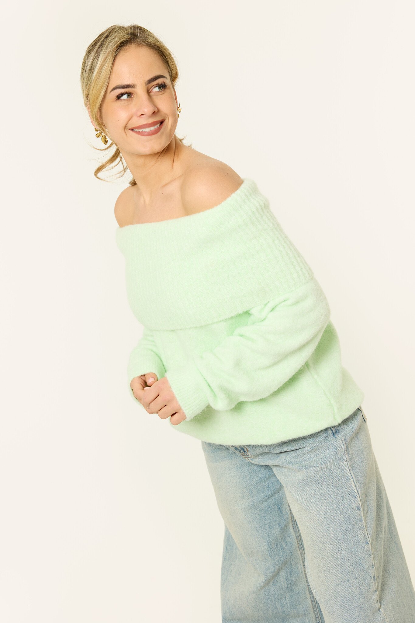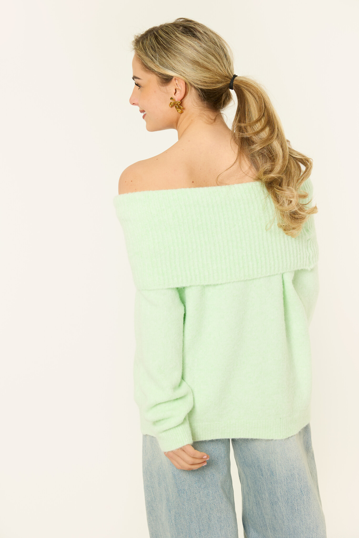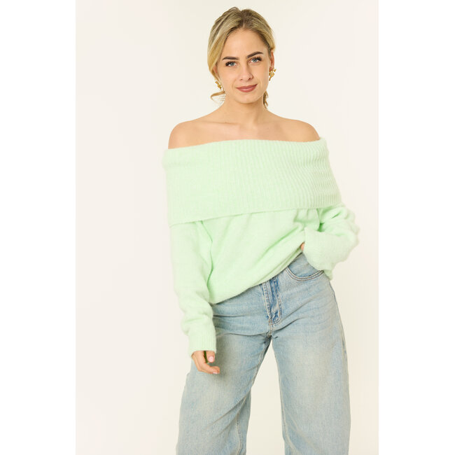 Deze lichtgroene off-shoulder trui is echt zo’n trui die je meteen uit de kast pakt als je iets comfy maar toch leuks aan wilt. Door de brede omslaghals draag je de gebreide trui off shoulder, wat zorgt voor een zachte, vrouwelijke look zonder dat het té is. Gewoon relaxed, maar wel stijlvol. De stof is lekker zacht en warm en de fit valt losjes, waardoor de knit super comfortabel zit. Perfect voor een casual dag met een jeans, maar ook heel leuk met een rokje of nette broek als je de trui wat meer wilt stylen. Zo’n easy go-to die altijd goed is.