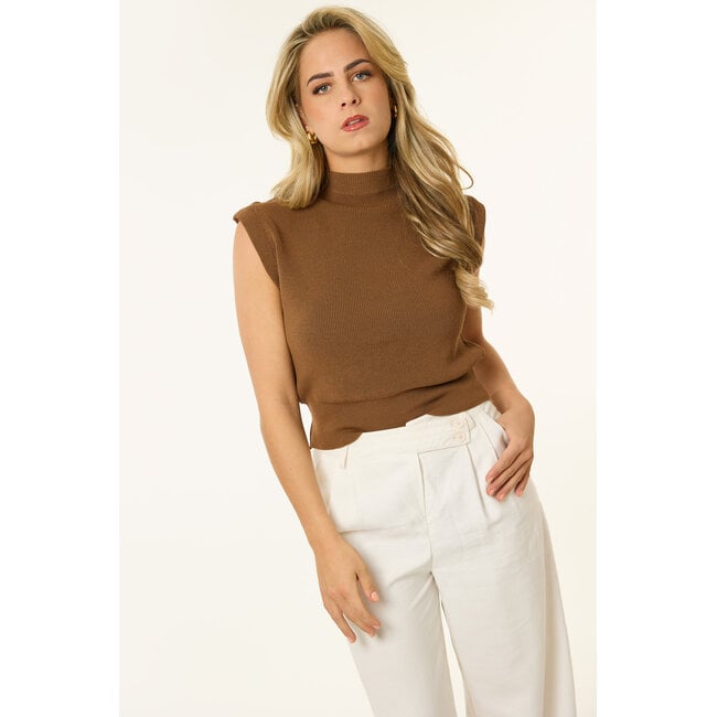 Deze camel knit top is een echte basic met een stijlvolle twist. De hoge hals en aangesloten fit zorgen voor een elegante look, terwijl het mouwloze model hem perfect maakt om te dragen onder een blazer of vest. De zachte, fijngebreide stof voelt comfortabel aan en geeft elke outfit een classy touch. Combineer met een pantalon of jeans voor een moderne, effortless look.