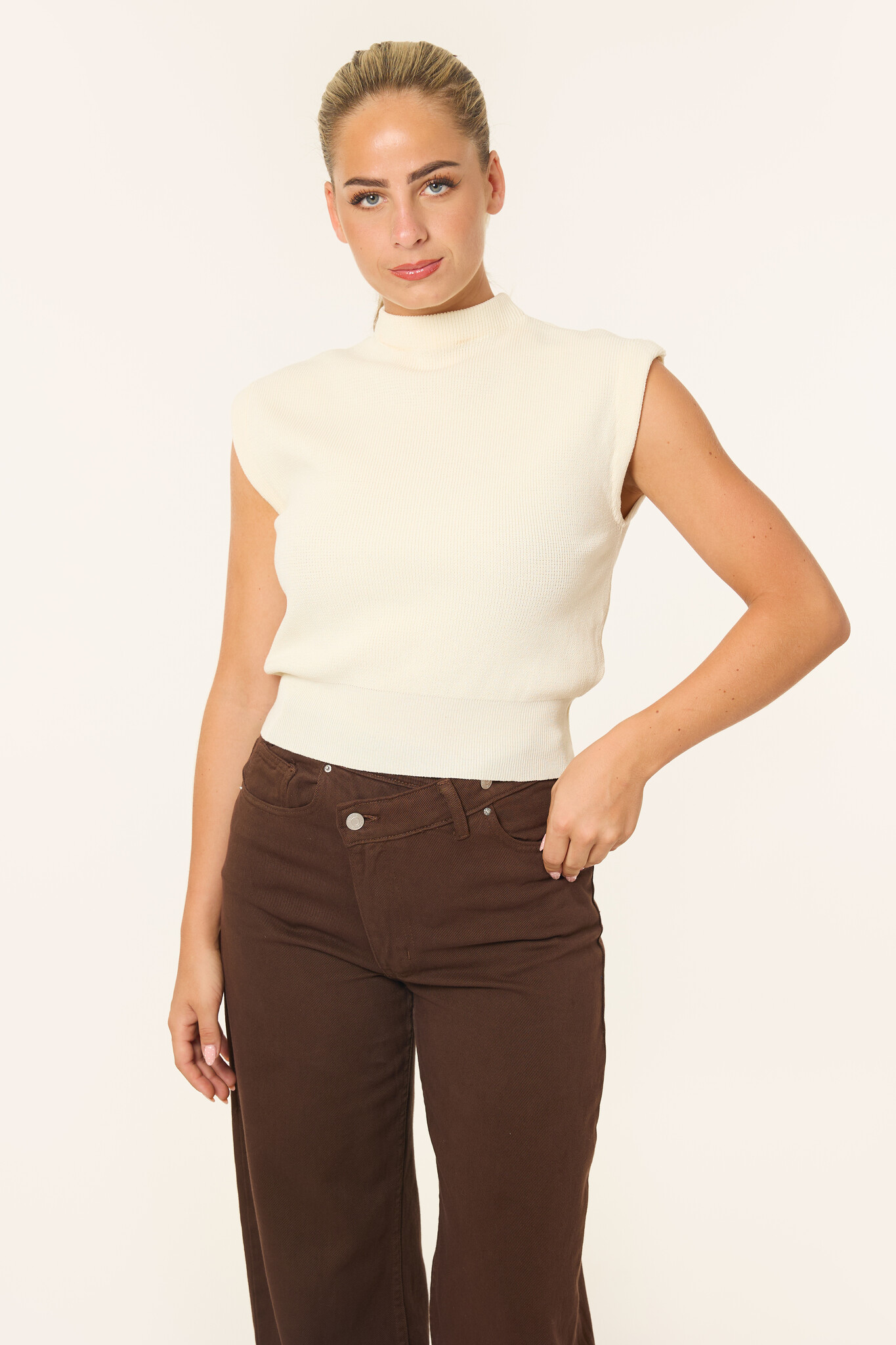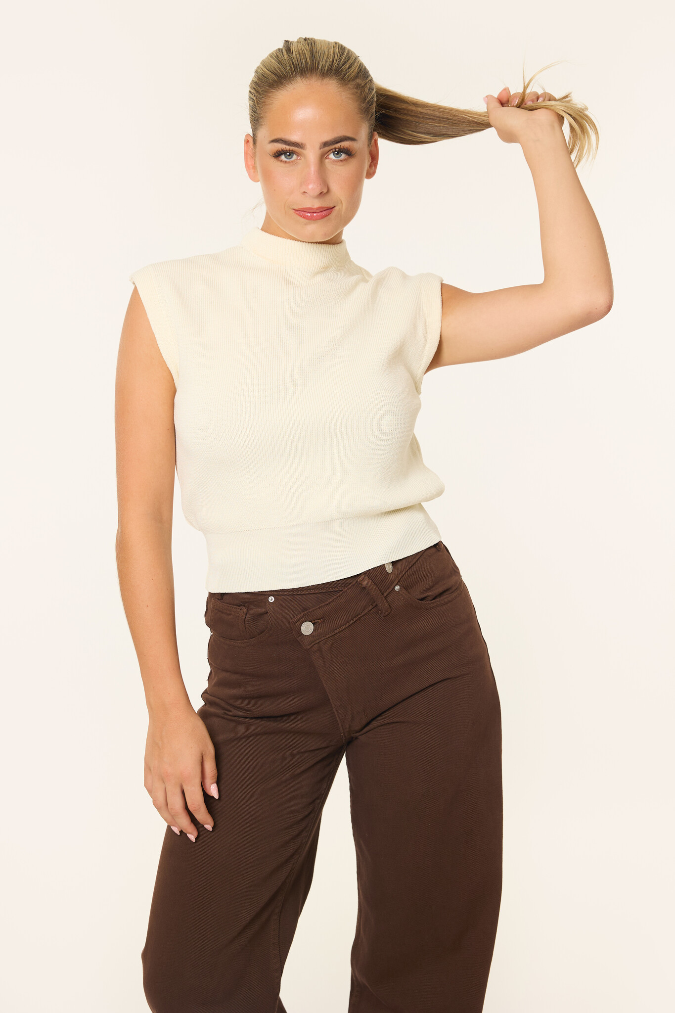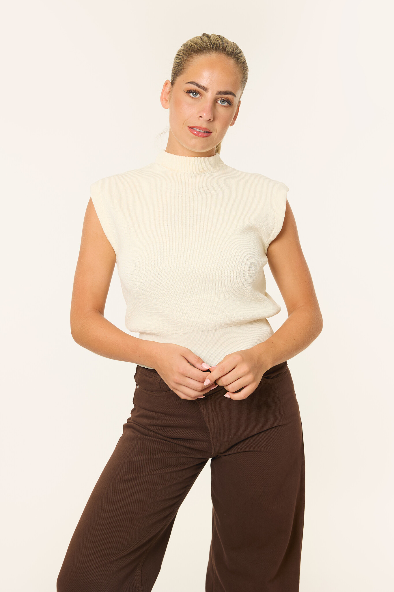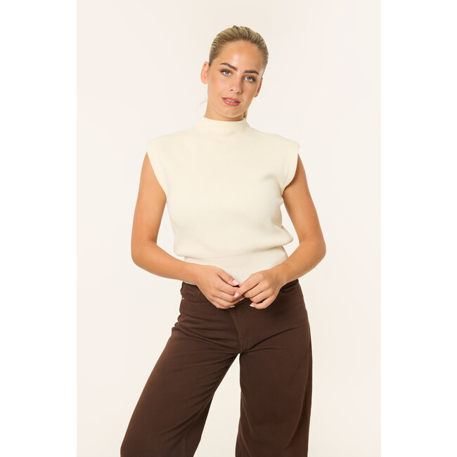 Een fijne basic top in een off white kleur. De top heeft een opstaande hals en korte kapmouwtjes, wat zorgt voor een nette, maar toch casual look. De stof is soepel en zit lekker, ideaal om zo te dragen of onder een jasje of blazer.