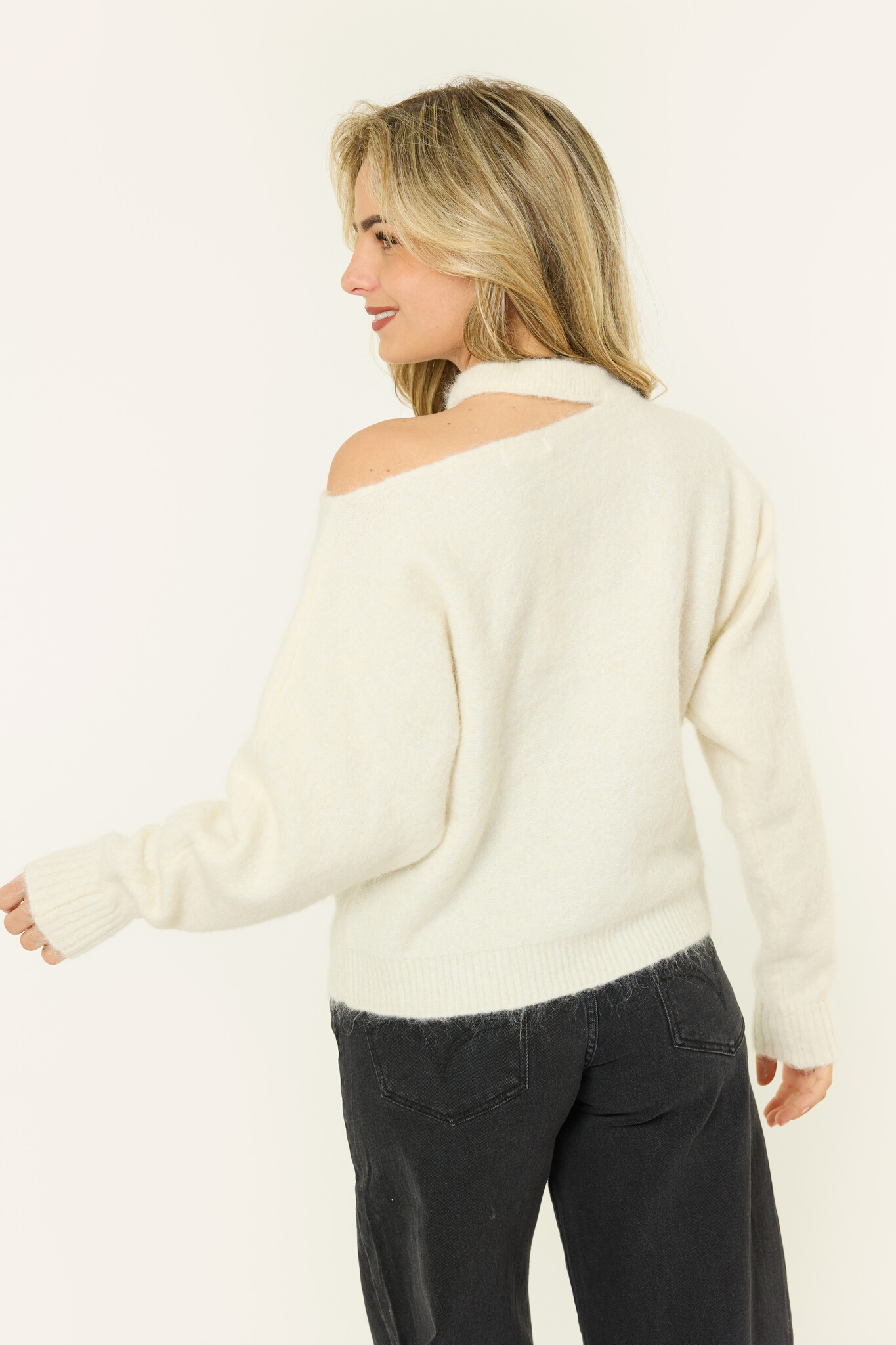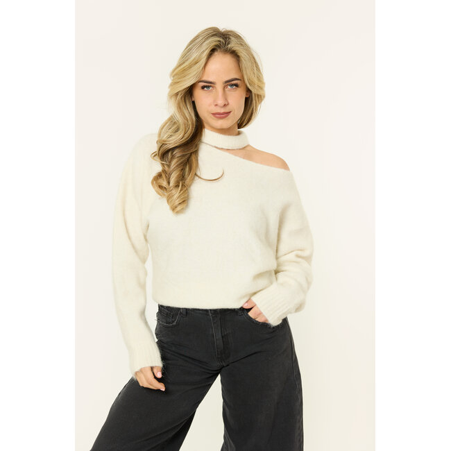Deze off white trui is echt zo’n fijne basic met net iets extra’s. De zachte, soepele stof zit super comfortabel en de losvallende fit geeft de knitted sweater een relaxte look. De one shoulder hals met cut-out detail maakt de trui juist weer vrouwelijk en een beetje speels, waardoor hij net wat specialer is dan een gewone knit. Perfect op een jeans voor een casual outfit, maar ook heel leuk met een pantalon of rokje als je de trui wat chiquer wilt stylen. Echt zo’n trui die je zonder nadenken aantrekt en waarmee je er meteen leuk uitziet.