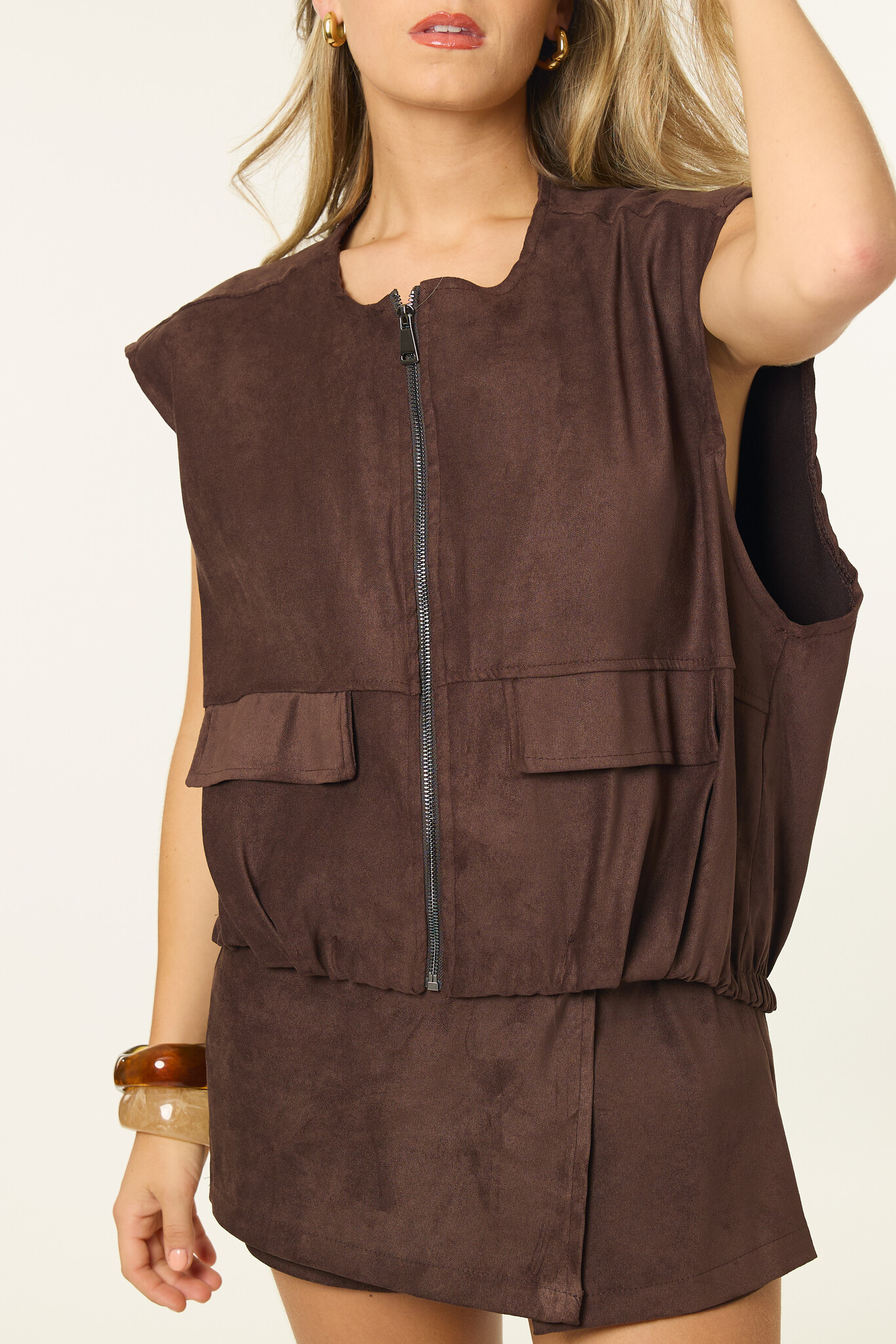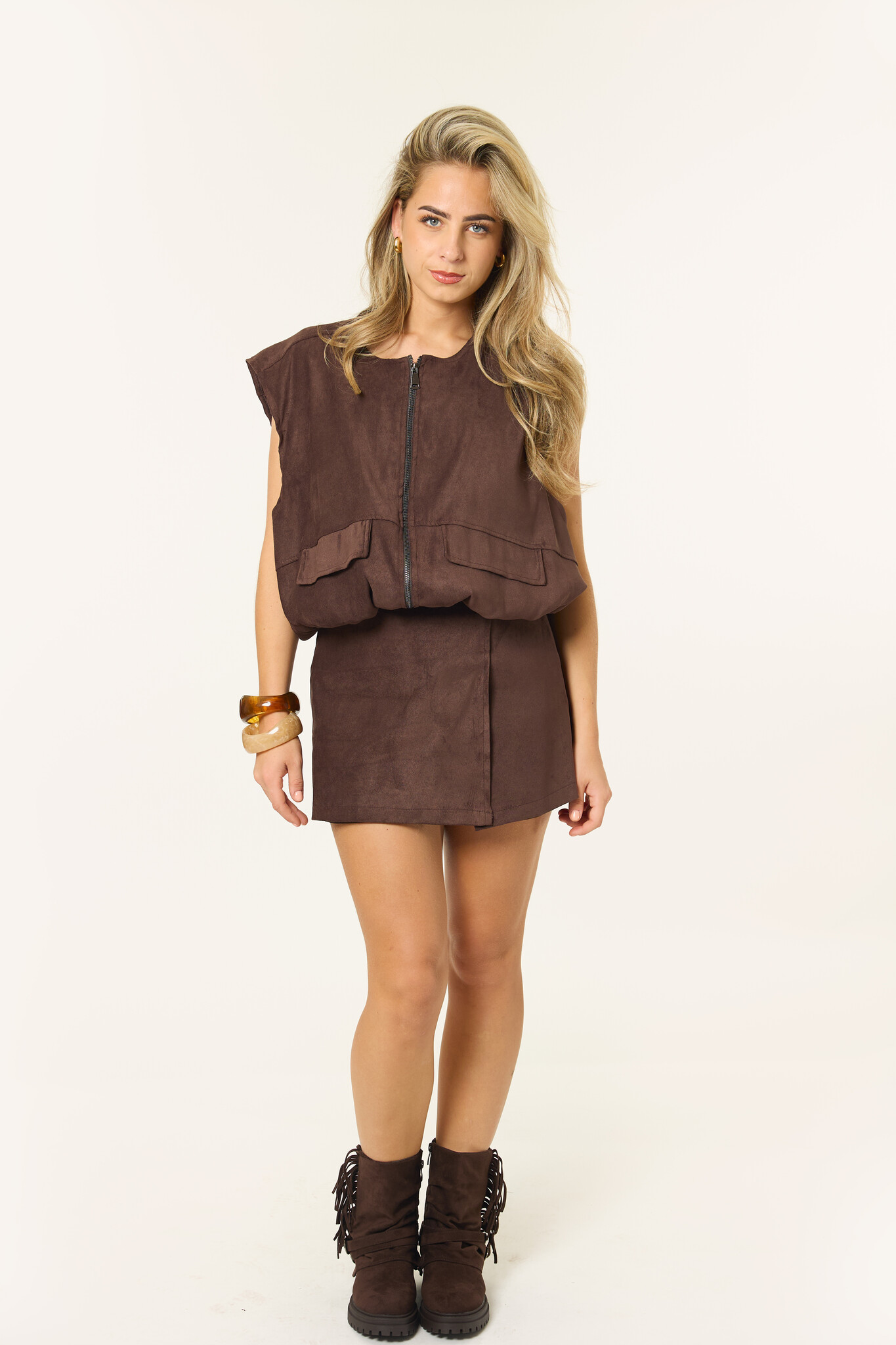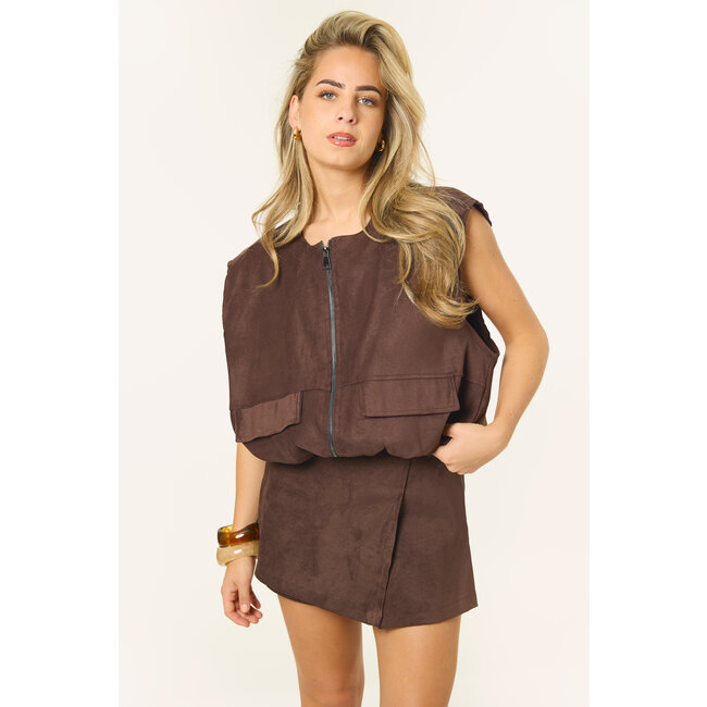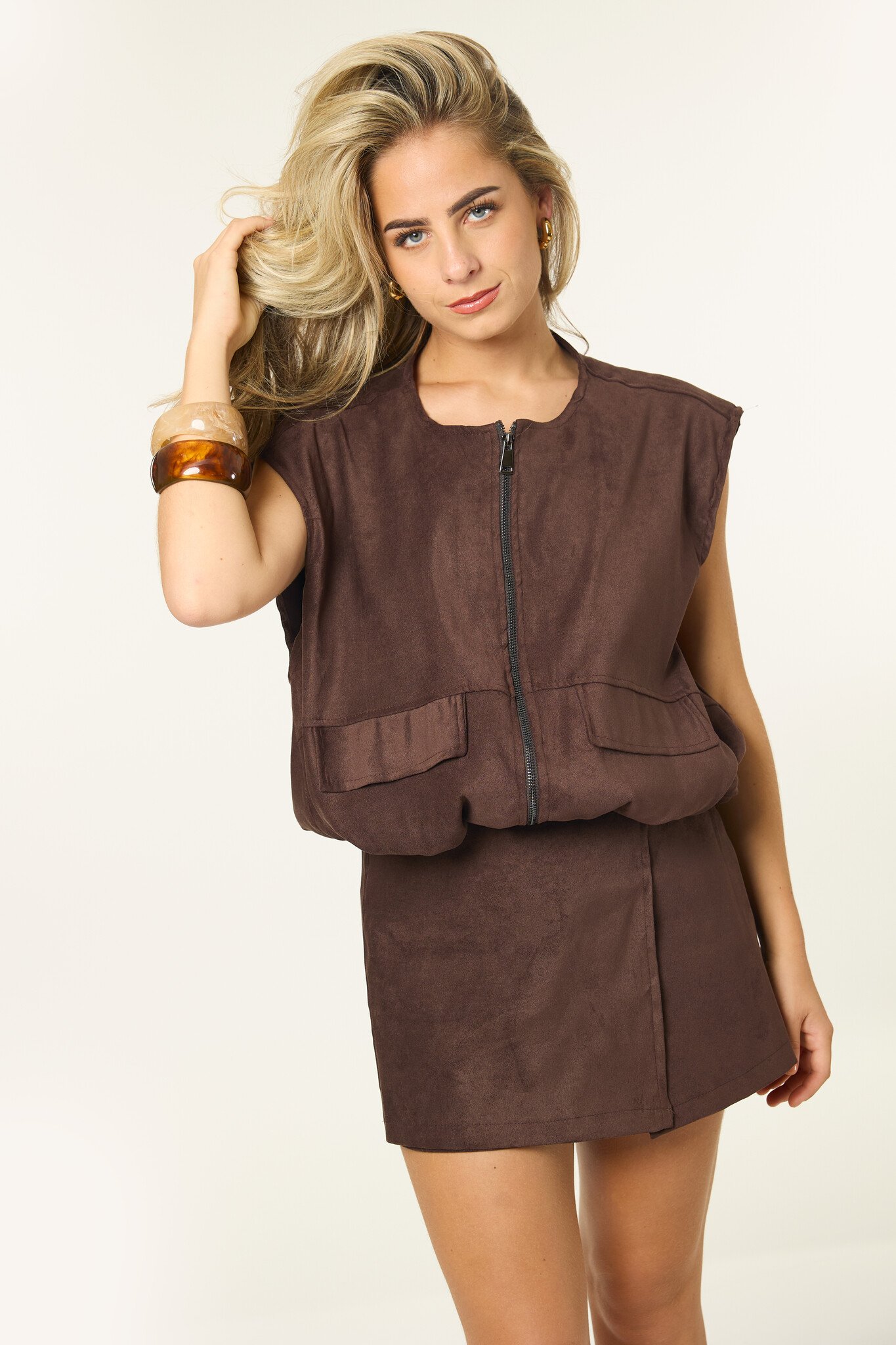 Deze donkerbruine suède look spencer is een item dat meteen een statement maakt. Dankzij de oversized fit en elastische taille is het item makkelijk te stylen. Perfect om te dragen als top op een rokje of short, of layered over een jeans voor een gelaagde autumn look.