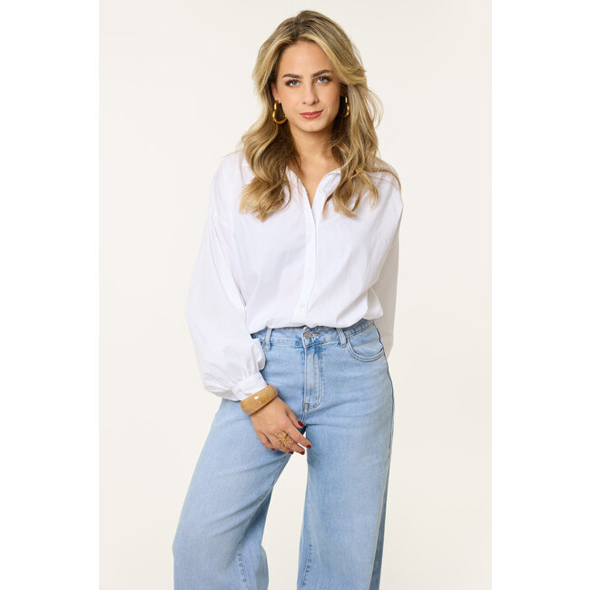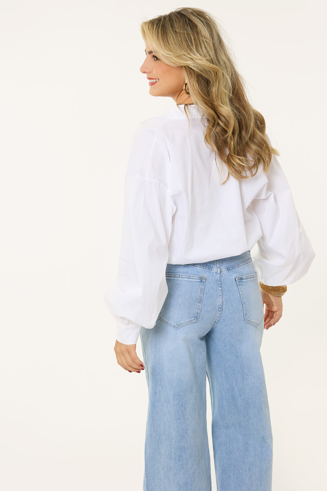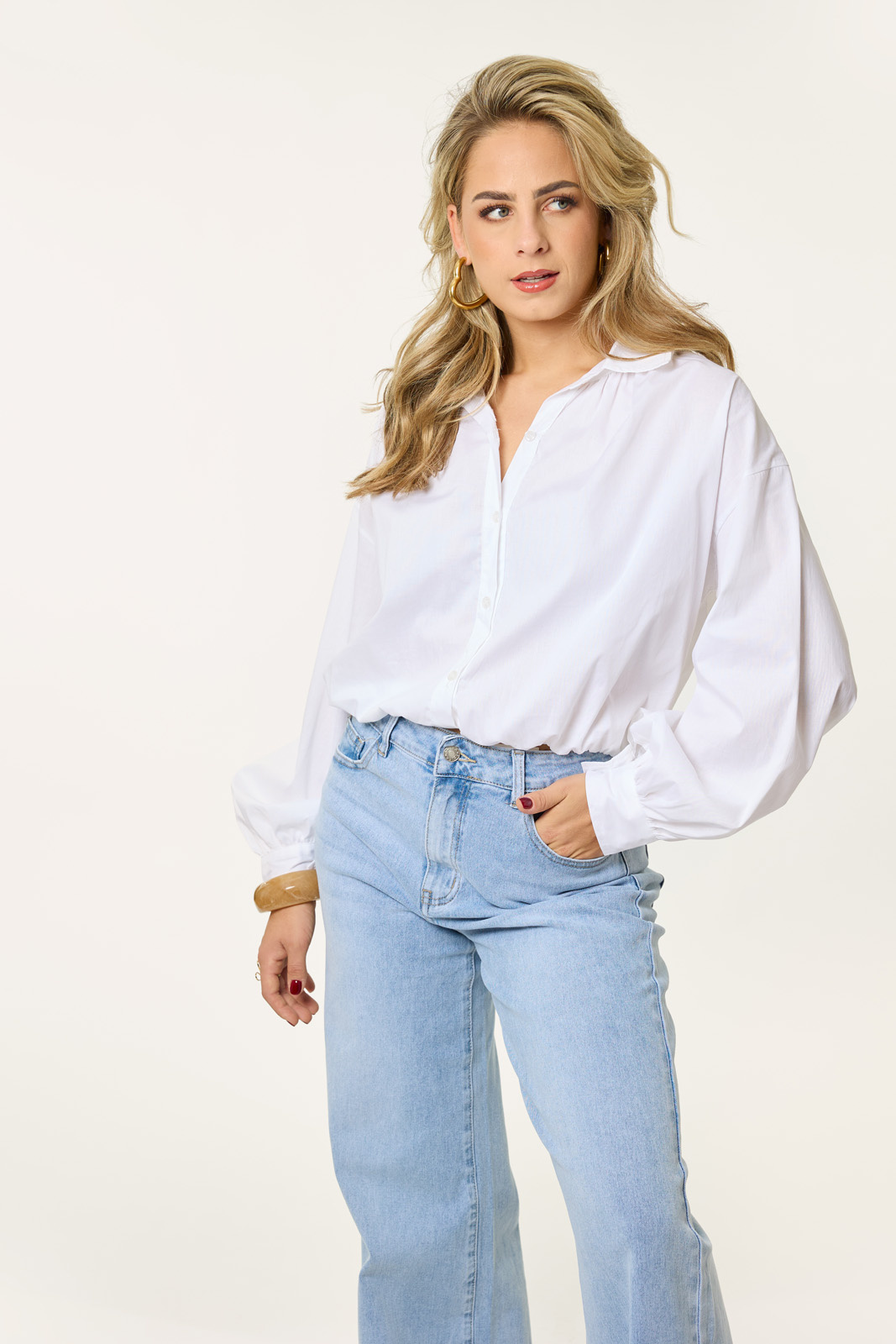 Deze witte blouse met elastische manchetten is een tijdloze essential voor je garderobe. De losvallende fit en luchtige stof maken de blouse heerlijk om te dragen, terwijl de ballonmouwen en subtiele plooien zorgen voor een stijlvolle touch. Dankzij de elastieke band sluit de mouw mooi aan voor een vrouwelijke look. Perfect te combineren met een jeans, pantalon of rok, van casual tot chic!