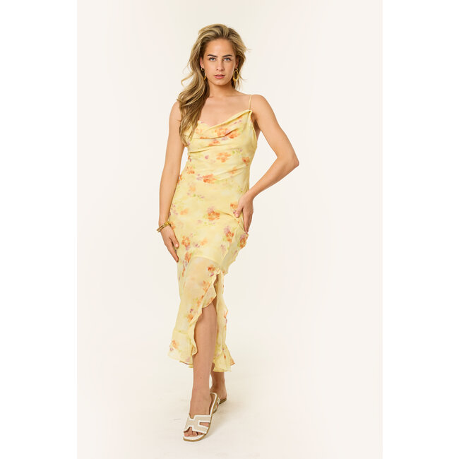 Deze lange jurk in het butter yellow is de perfecte toevoeging aan je garderobe. De bloemenprint geeft de jurk net dat beetje extra. Door de luchtige, soepelvallende stof is dit item ideaal voor warme dagen of een zomers event. De lengte in combinatie met de pasvorm zorgt voor comfort en stijl. Stijl de bloemenjurk af met sneakers of sandalen voor overdag, of combineer met hakken en een schoudertas voor een diner occcasion of een feest.