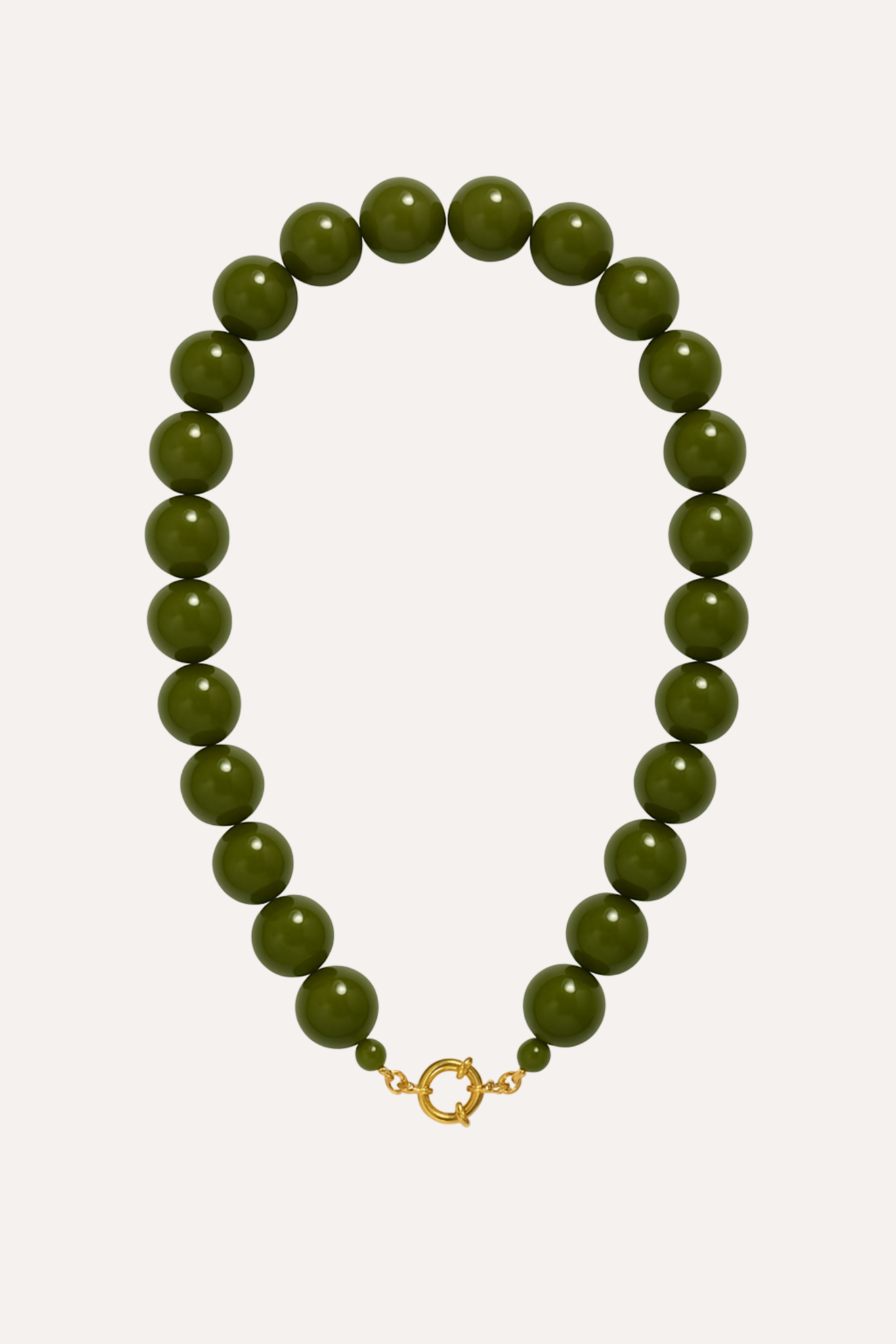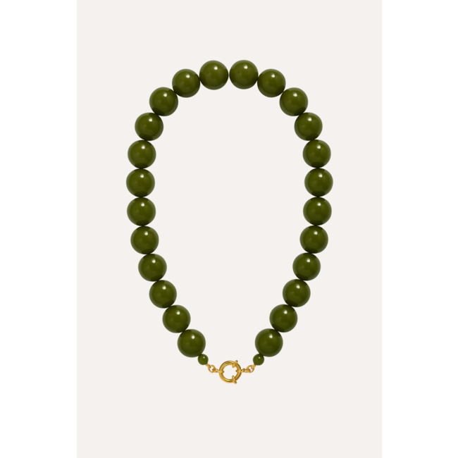 Statement alert! Deze olijfgroene kralenketting geeft elke look meteen een stijlvolle upgrade. De grove kralen in diepe groentint en de subtiele gouden sluiting zorgen voor een luxe en trendy uitstraling. Draag de ketting solo als eyecatcher of mix hem met andere kettingen voor een trendy layered look. Perfect bij een basic top, oversized blouse of blazer, deze ketting maakt je outfit helemaal af.