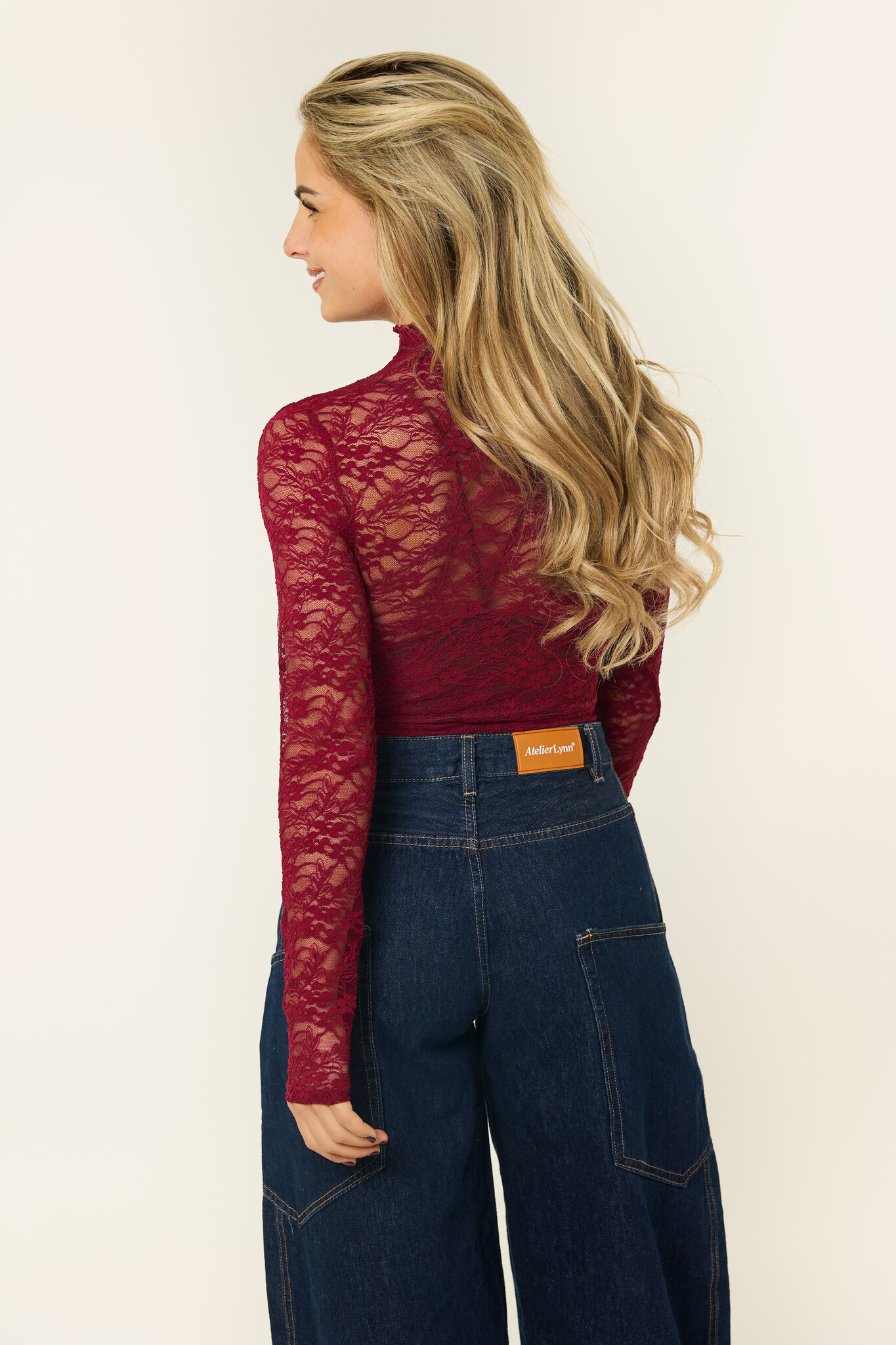 Deze burgundy kanten longsleeve top is perfect wanneer je een vrouwelijke, elegante touch aan je outfit wilt geven. De top is volledig gemaakt van fijn kant, waardoor de longsleeve een luxe uitstraling heeft zonder dat het te feestelijk wordt. Dankzij de hoge hals en aansluitende pasvorm kun je de kanten top zowel stijlvol als subtiel dragen, bijvoorbeeld met een blazer of juist casual op een mooie jeans. De lange mouwen geven het geheel een chique en verfijnde look, ideaal voor avonden uit of speciale momenten. Een prachtige burgundy kantentop die je garderobe net dat beetje extra geeft.