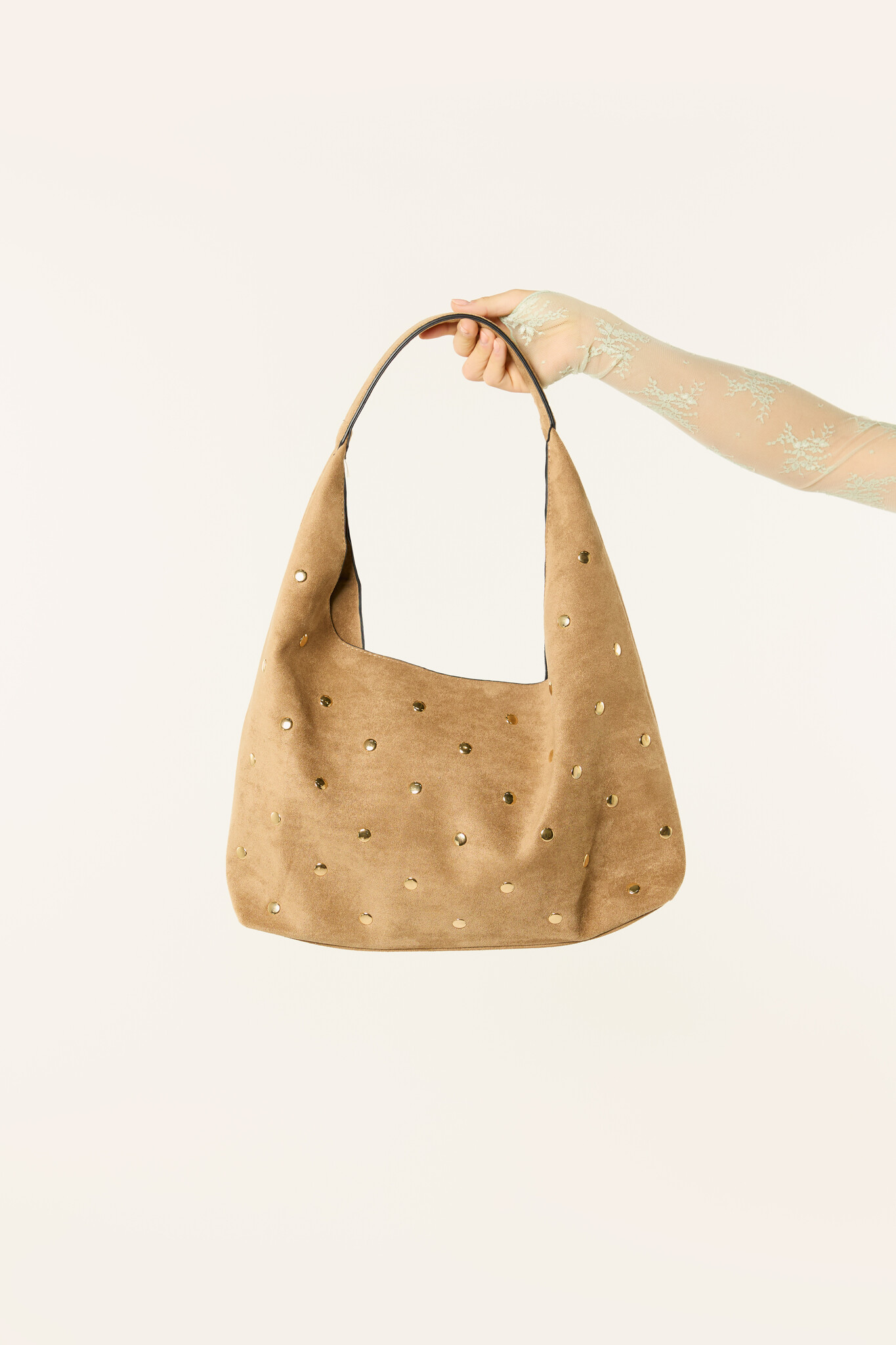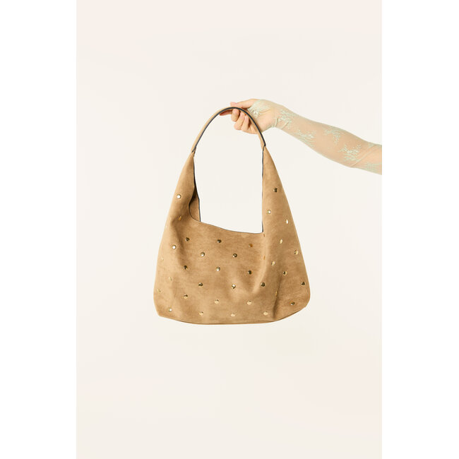 Deze taupe schoudertas met goudkleurige studs is een echte eyecatcher voor je outfit. De zachte suède look en het ruime model maken de tas zowel stijlvol als praktisch. De goudkleurige studs geven de taupe tas een trendy uitstraling. Perfect om je outfit net dat beetje extra te geven en makkelijk te combineren met verschillende looks.