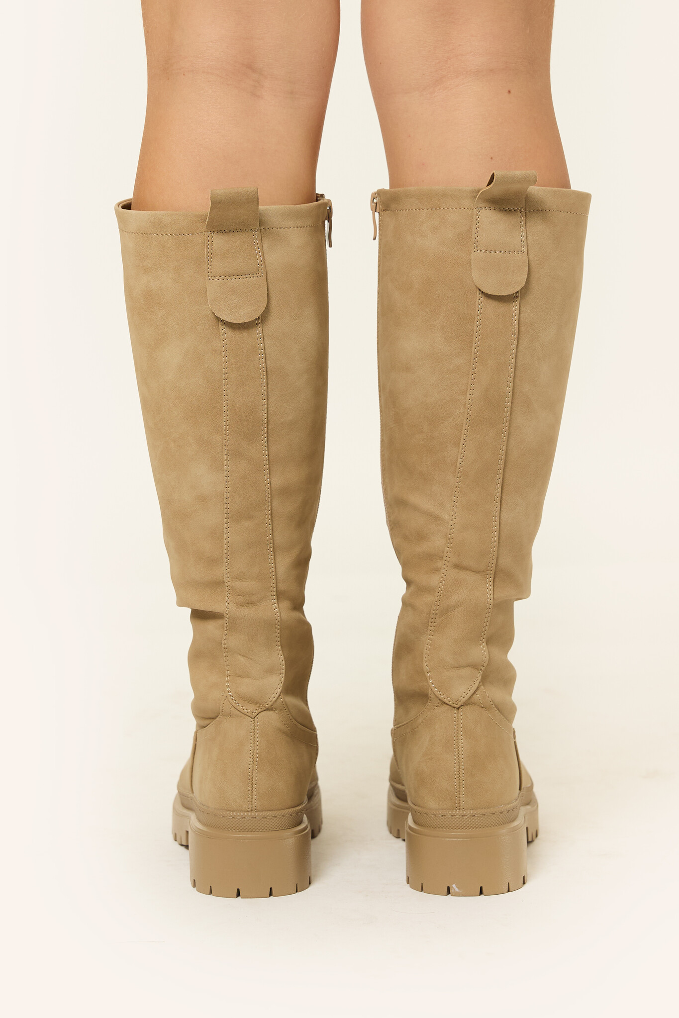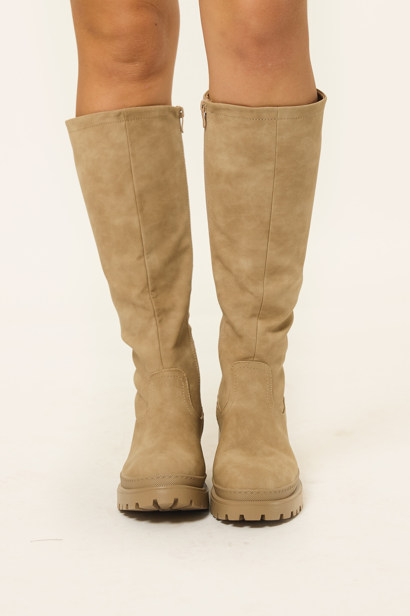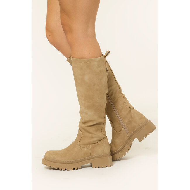 Deze hoge beige knielaarzen met plateauzool zijn het ultieme item voor je garderobe. De lichte kleur maakt ze mega veelzijdig, terwijl de chunky plateauzool je outfit meteen die bold en edgy touch geeft. Perfect onder een jurkje, over een skinny of met een oversized blazer, deze boots maken elke look helemaal af.