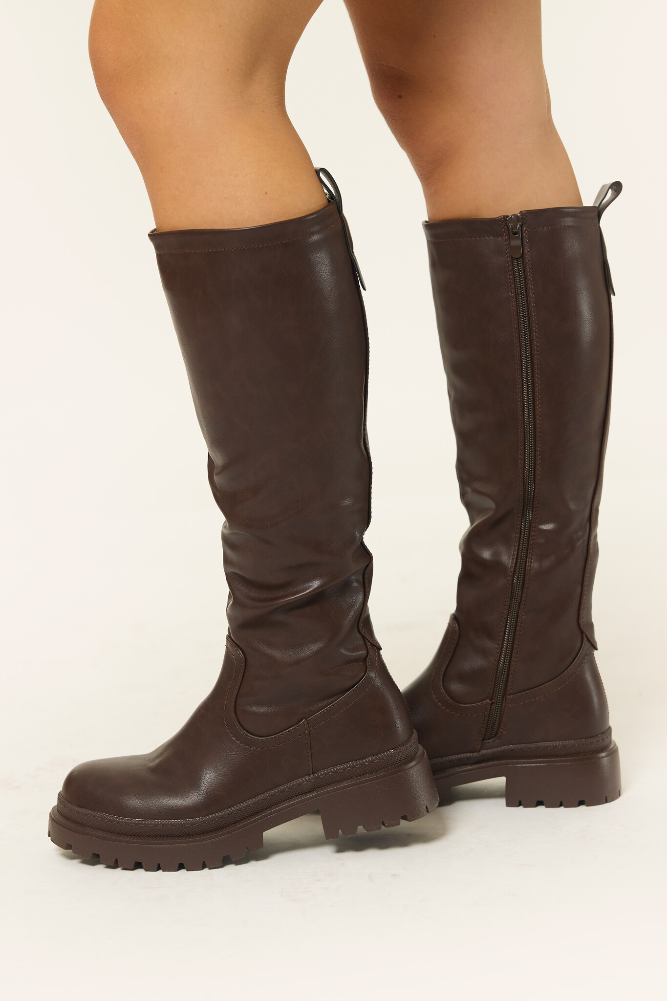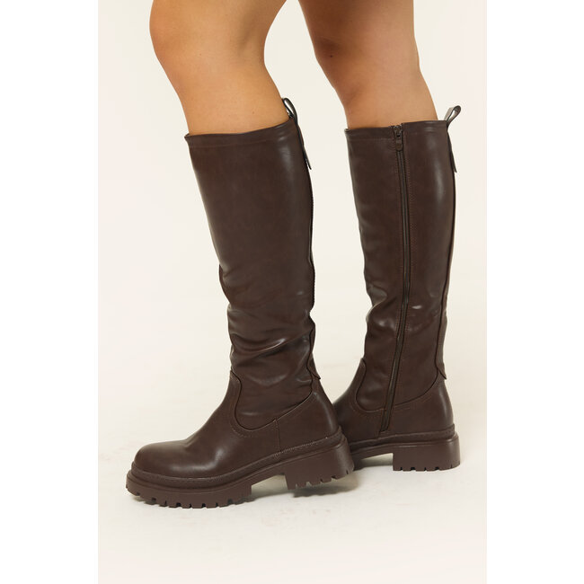 Deze hoge donkerbruine knielaarzen met plateauzool zijn het ultieme item voor je garderobe. De donkere kleur maakt ze mega veelzijdig, terwijl de chunky plateauzool je outfit meteen die bold en edgy touch geeft. Perfect onder een jurkje, over een skinny of met een oversized blazer, deze boots maken elke look helemaal af