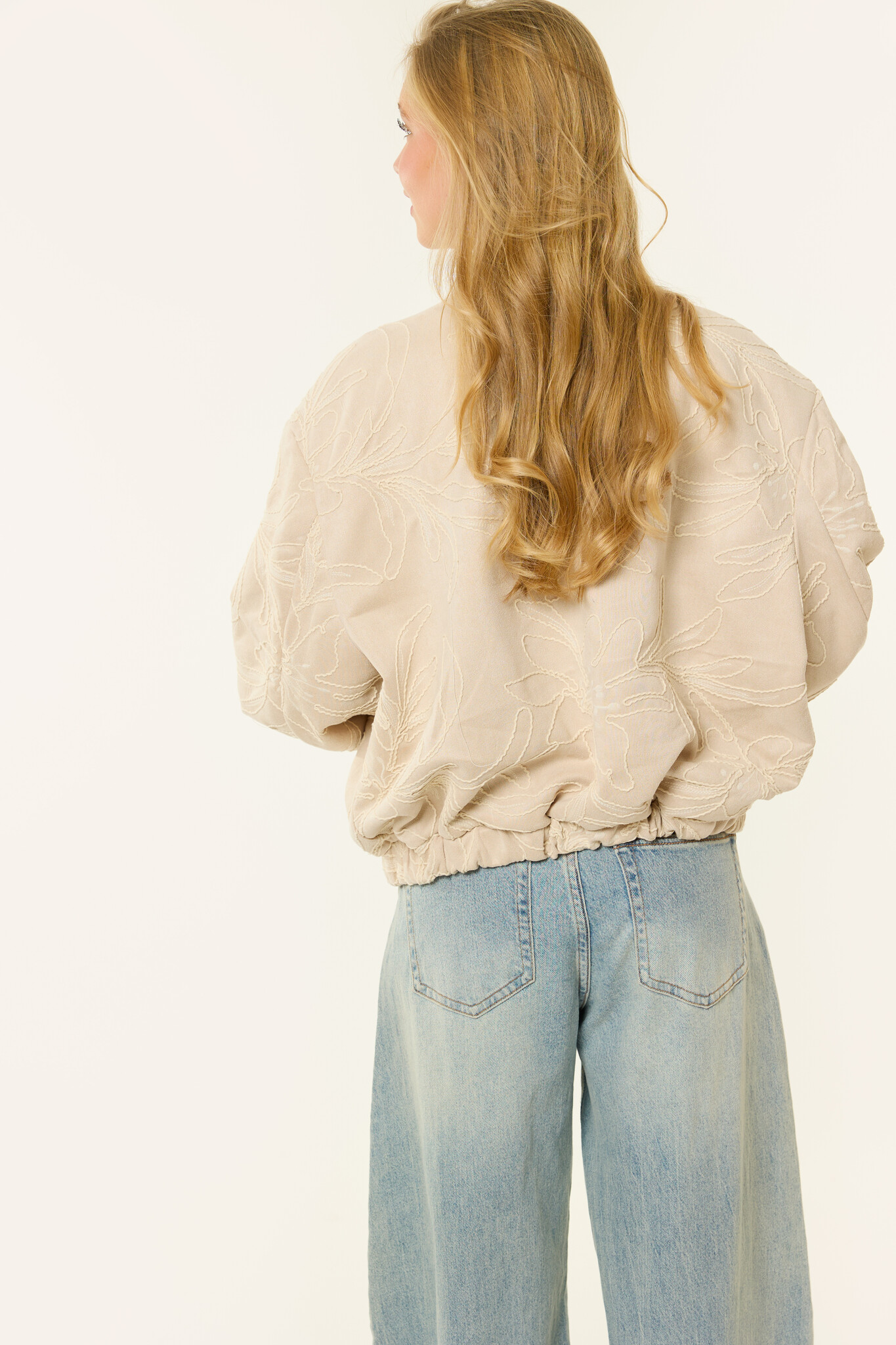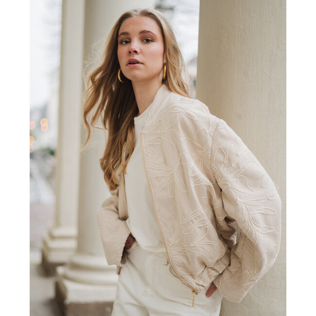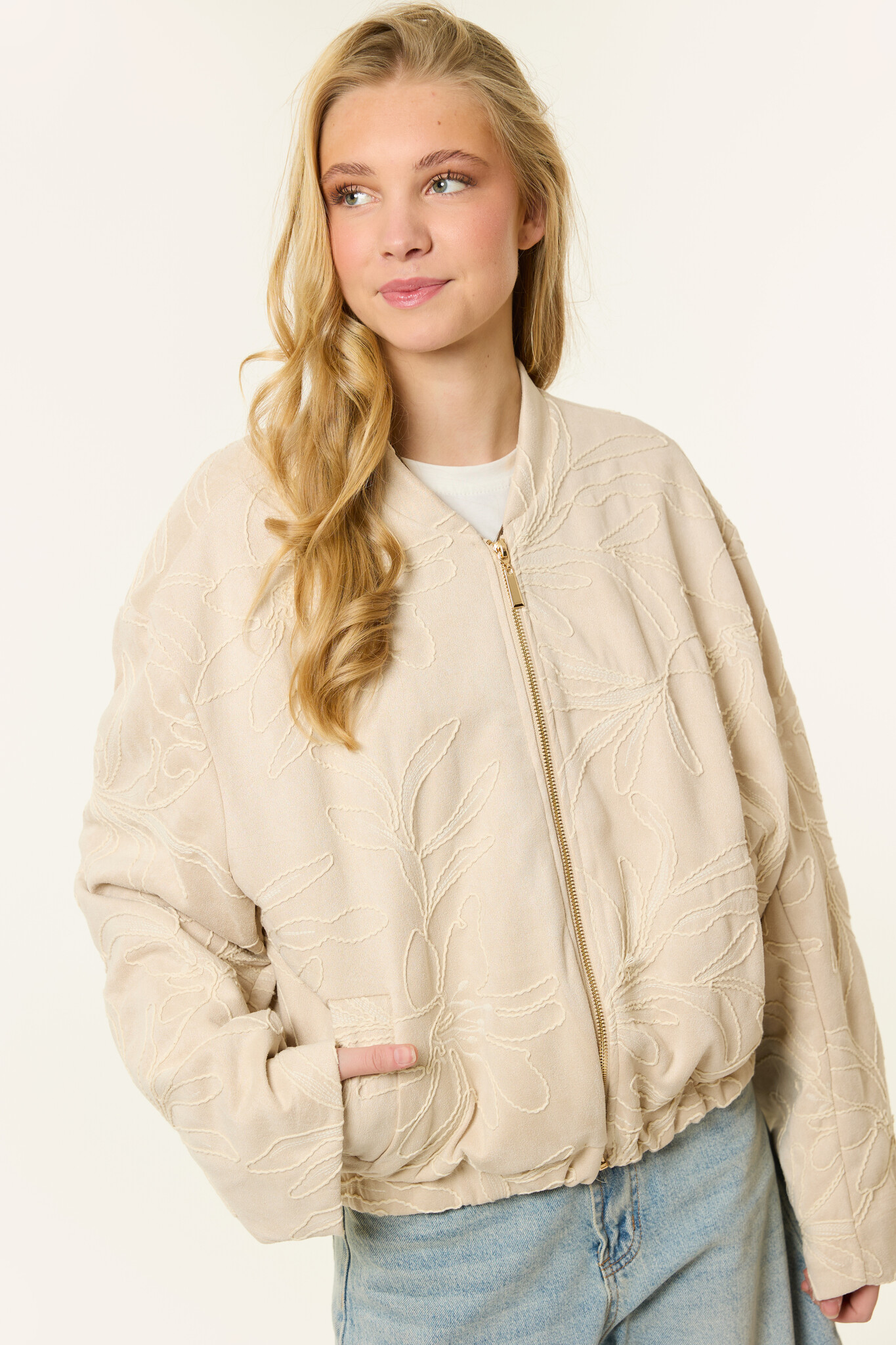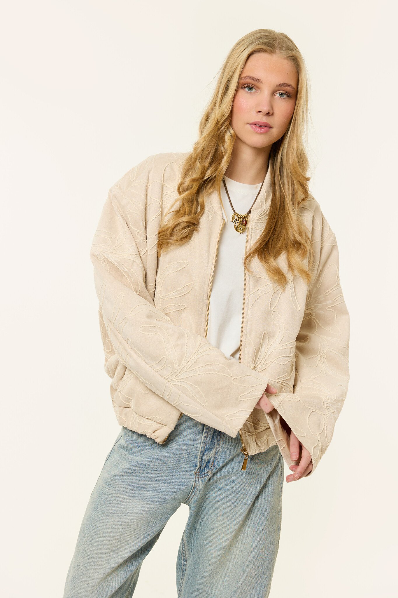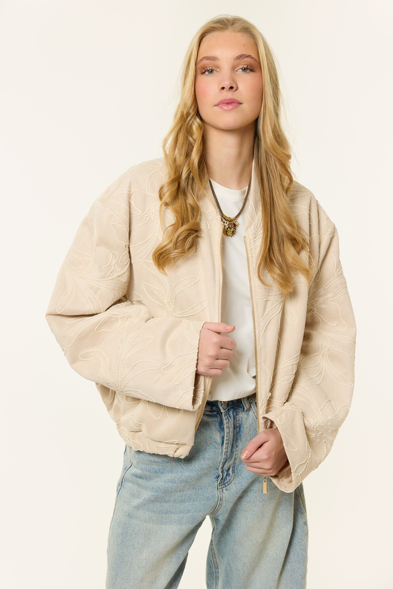 Dit beige jasje is een echte musthave voor elk seizoen. Het jasje heeft een subtiele structuurstof met bloemen en een ritsluiting. De licht oversized fit zorgt voor een moderne uitstraling en maakt de jas perfect om zowel casual als chic te dragen. Combineer het met een jeans voor een effortless look of met een skort voor een vrouwelijke touch.