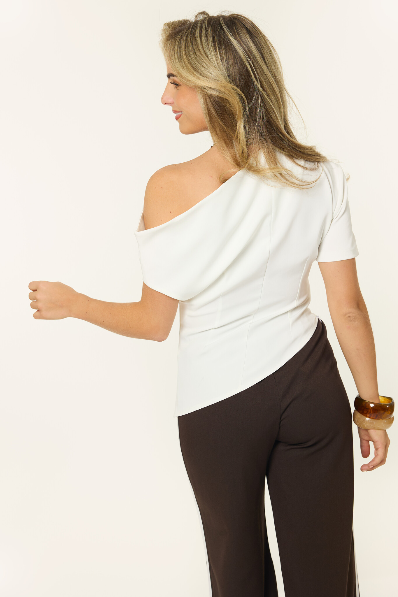 Deze witte one shoulder top heeft een moderne en chique uitstraling door de asymmetrische bovenkant. Dankzij de getailleerde pasvorm sluit hij mooi aan, waardoor je de top zowel classy met een pantalon als casual met een jeans kunt stylen. Een tijdloos item dat je outfit moeiteloos een stijlvolle upgrade geeft.