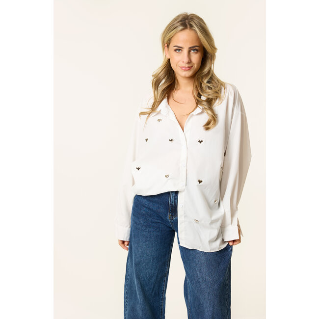 Op zoek naar een witte blouse dames die net even anders is? Deze oversized blouse met metallic hartjes is een echte musthave. Dankzij de relaxte fit zit de blouse super comfortabel, terwijl de glanzende details je outfit een fun en trendy touch geven. Ideaal om te combineren met een jeans voor een casual look of met een pantalon voor een chique twist.