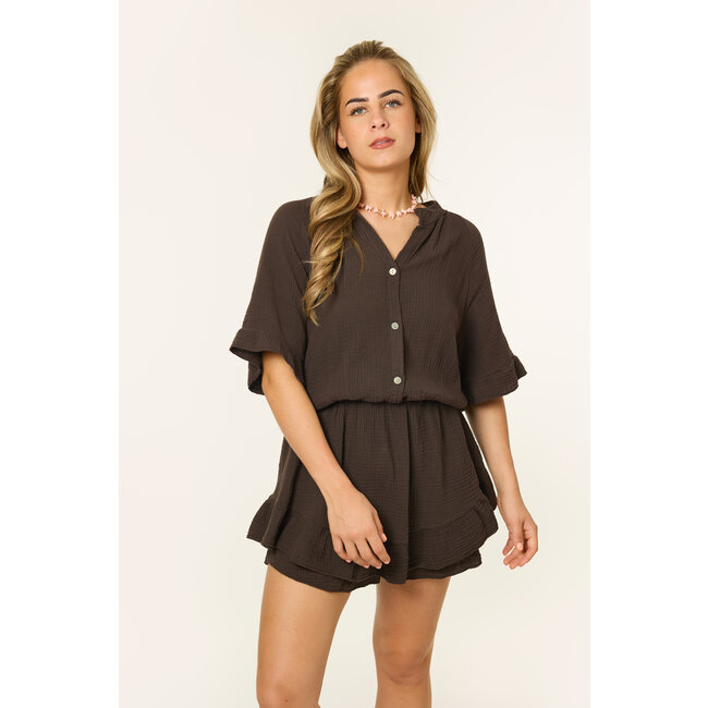 Deze donkerbruine playsuit is een veelzijdig item dat je super makkelijk kunt stylen. De subtiele ruffle details langs de mouwen en broekspijpen geven net dat beetje extra. De bruine kleur is tijdloos en makkelijk te combineren met zowel neutrale als opvallende accessoires. Gemaakt van een lichte, soepelvallende stof die ook perfect te dragen is op hot summer days!