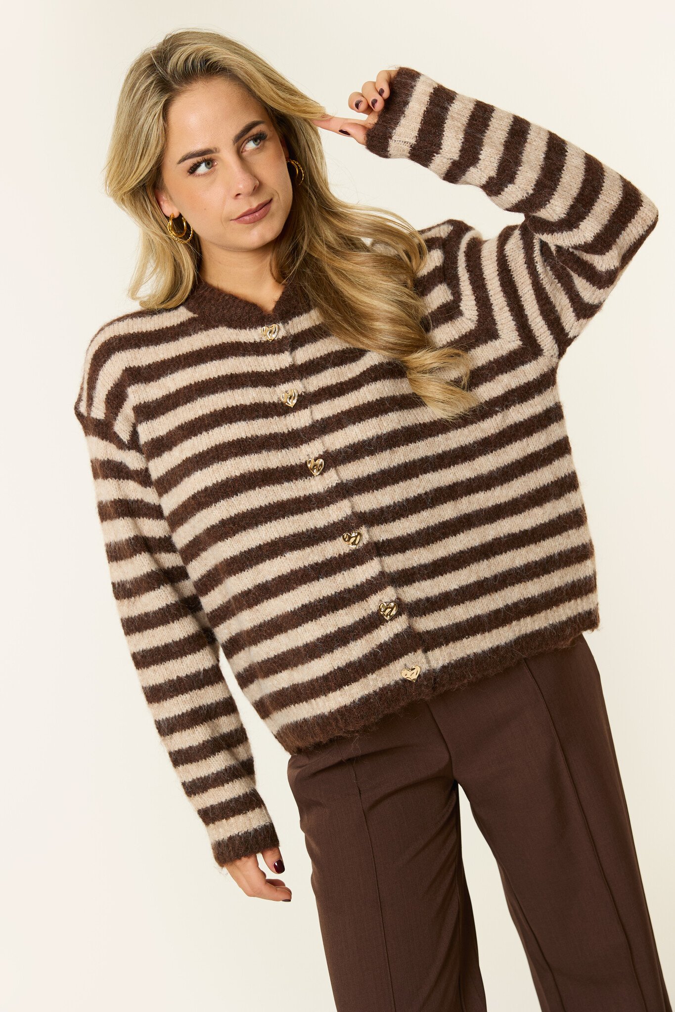 Dit gestreepte knit vest is zo’n item dat je meteen graag aantrekt: zacht, warm en supergezellig. De bruine en beige strepen zorgen voor een warme uitstraling, terwijl de gouden hartjesknopen een lieve, fun touch geven. De losse, comfortabele fit maakt het zachte vest ideaal om over elke outfit te dragen, van casual op een jeans tot iets netter op een pantalon.