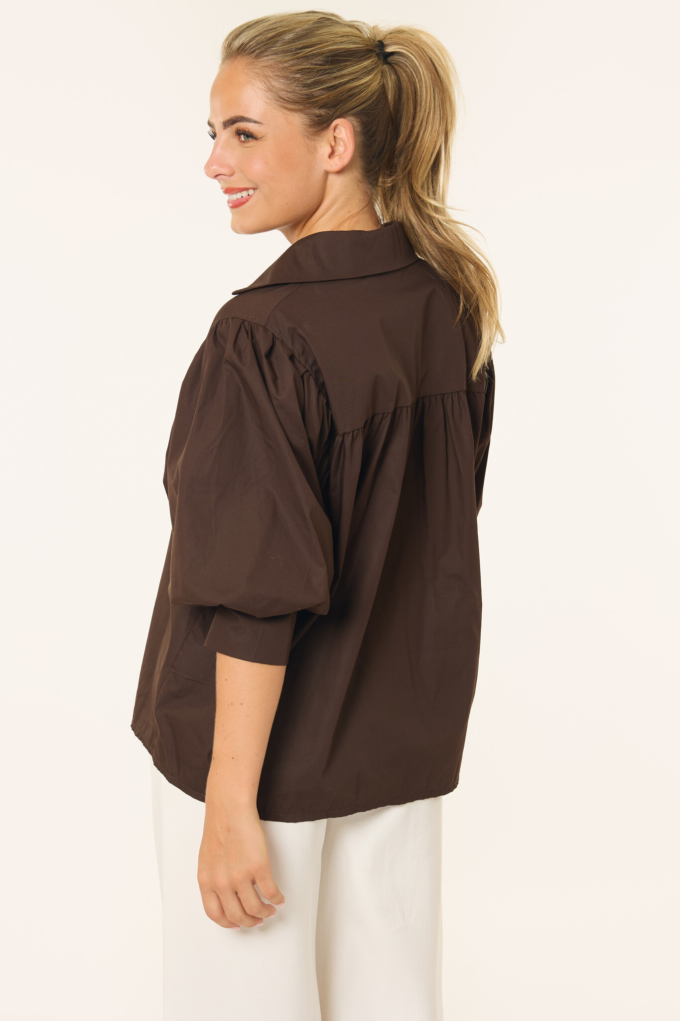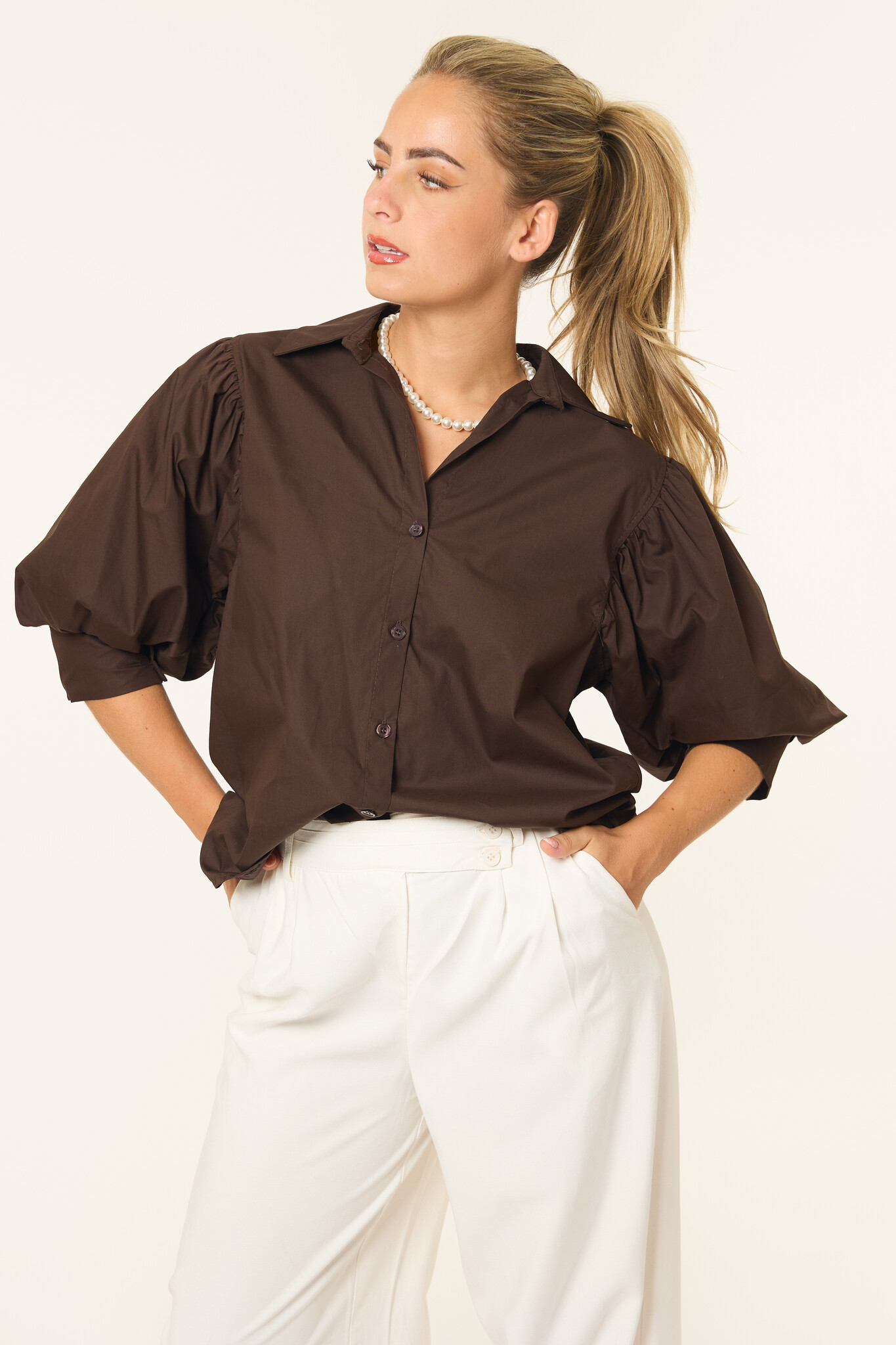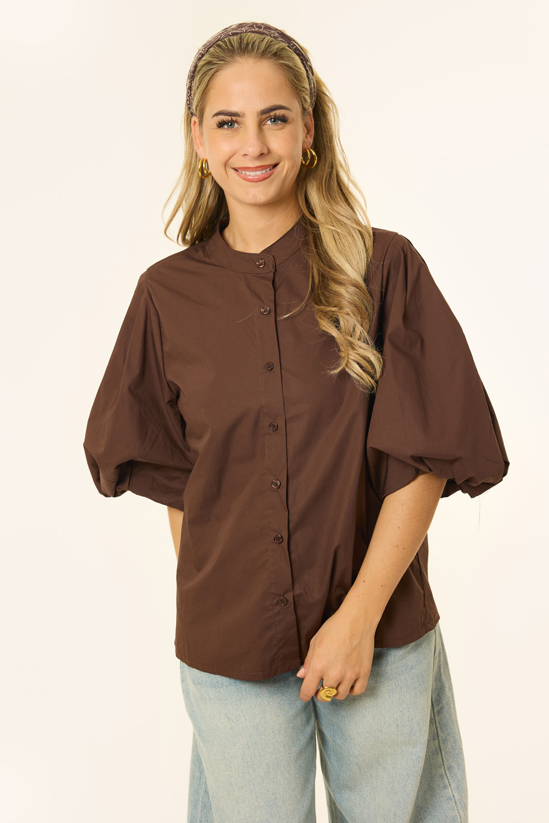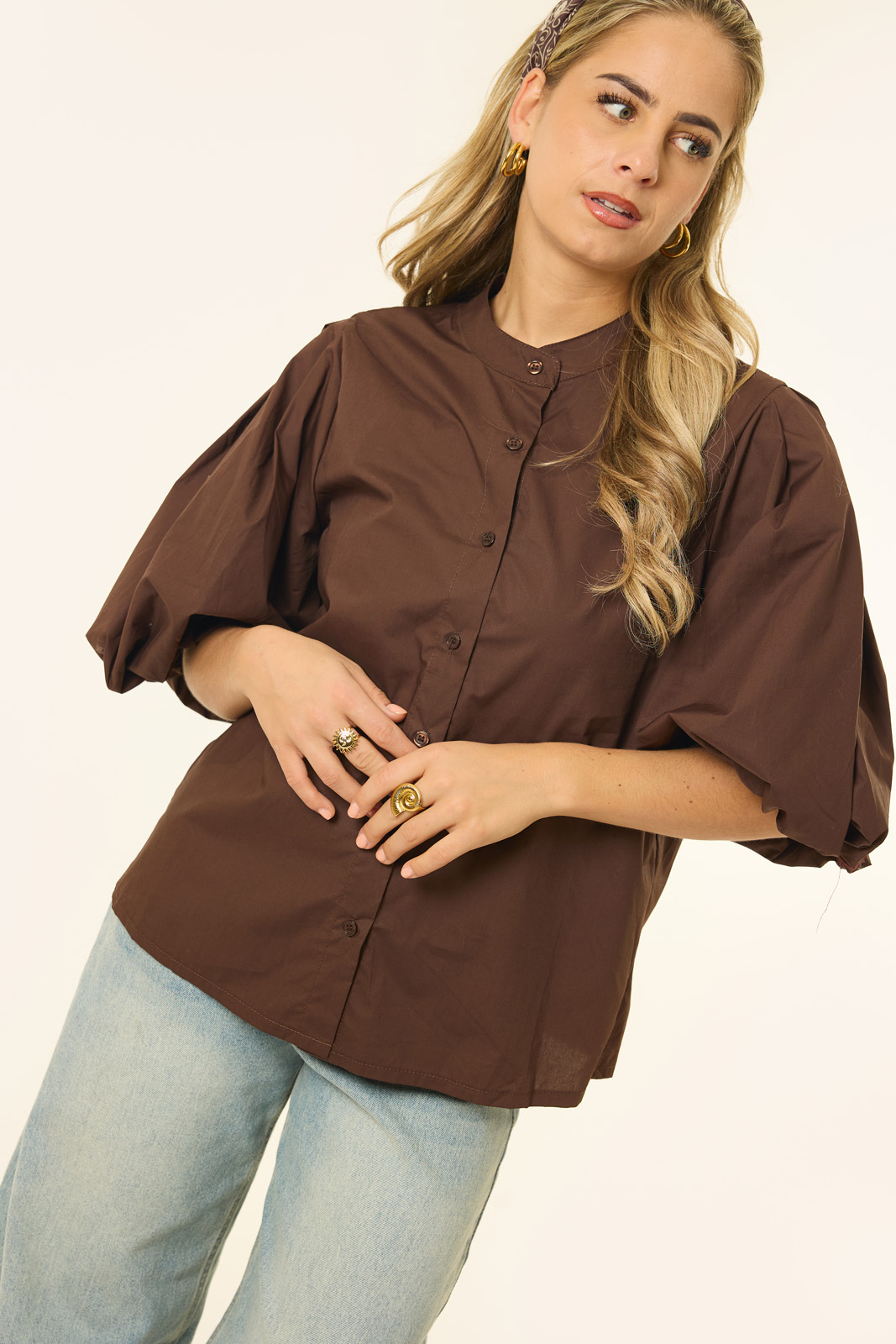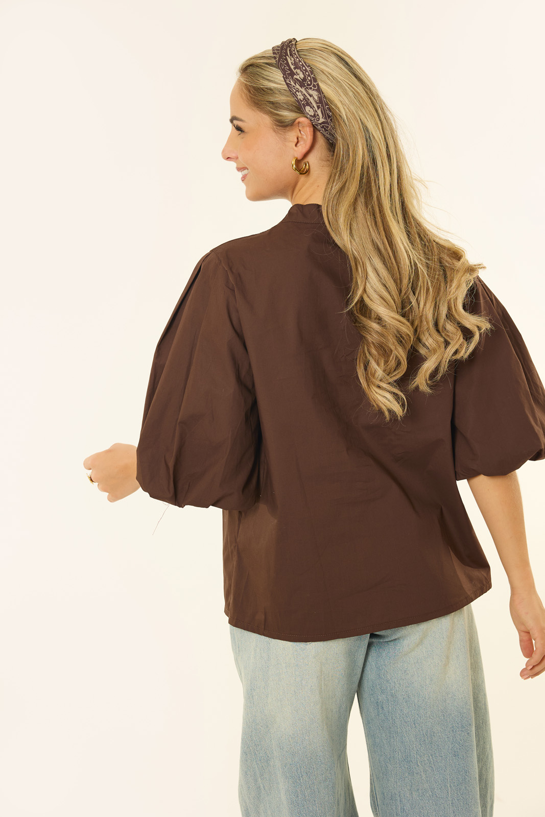 Deze bruine blouse is de perfecte nette basic. De korte pofmouwen geven de top net dat beetje extra, terwijl de neutrale donkerbruine kleur ervoor zorgt dat je de blouse eindeloos kunt combineren. Gemaakt van een luchtige stof, ideaal voor zowel een casual look als een nette outfit.