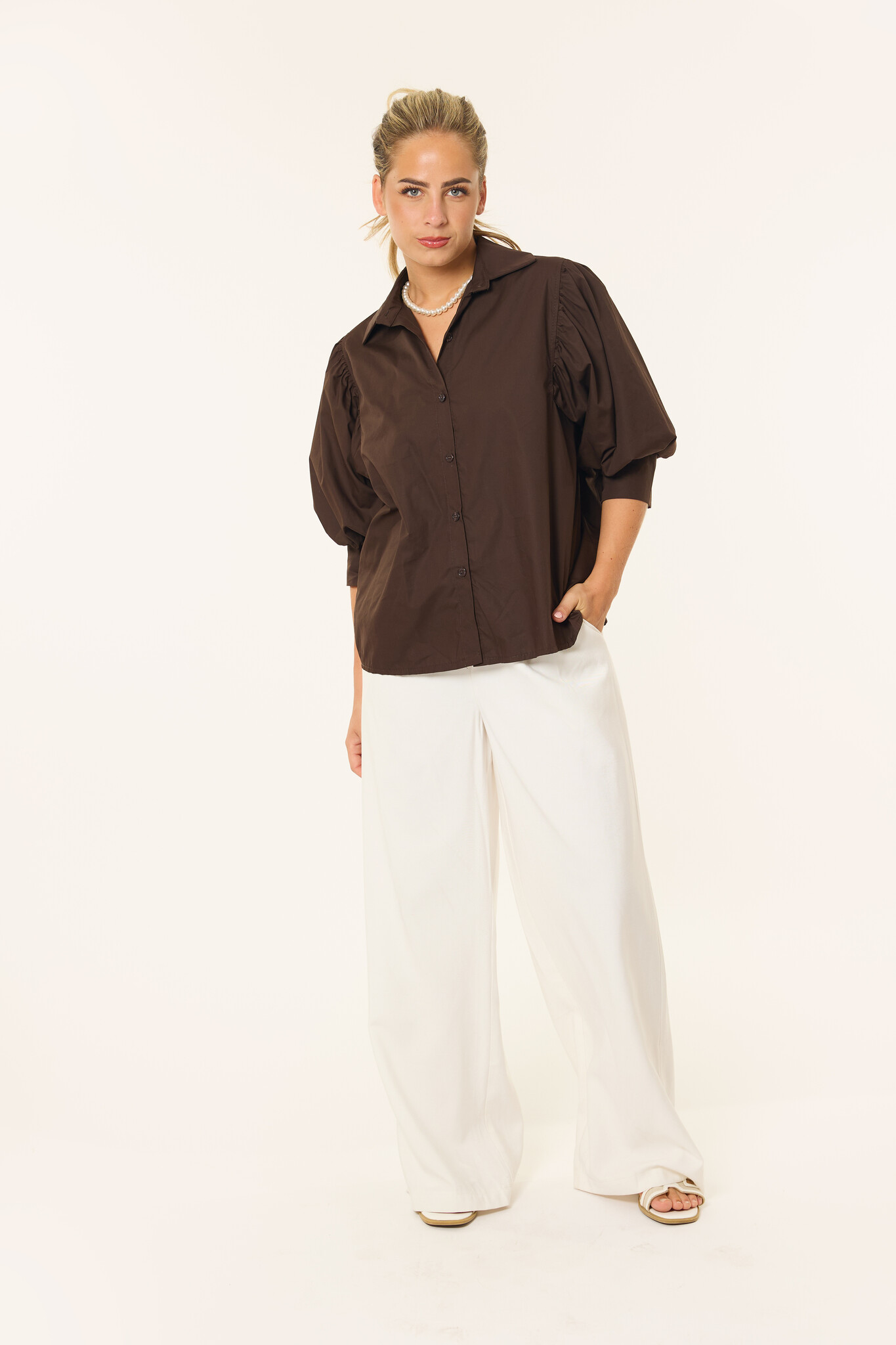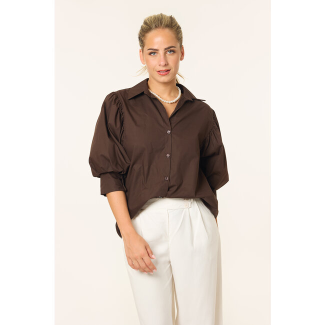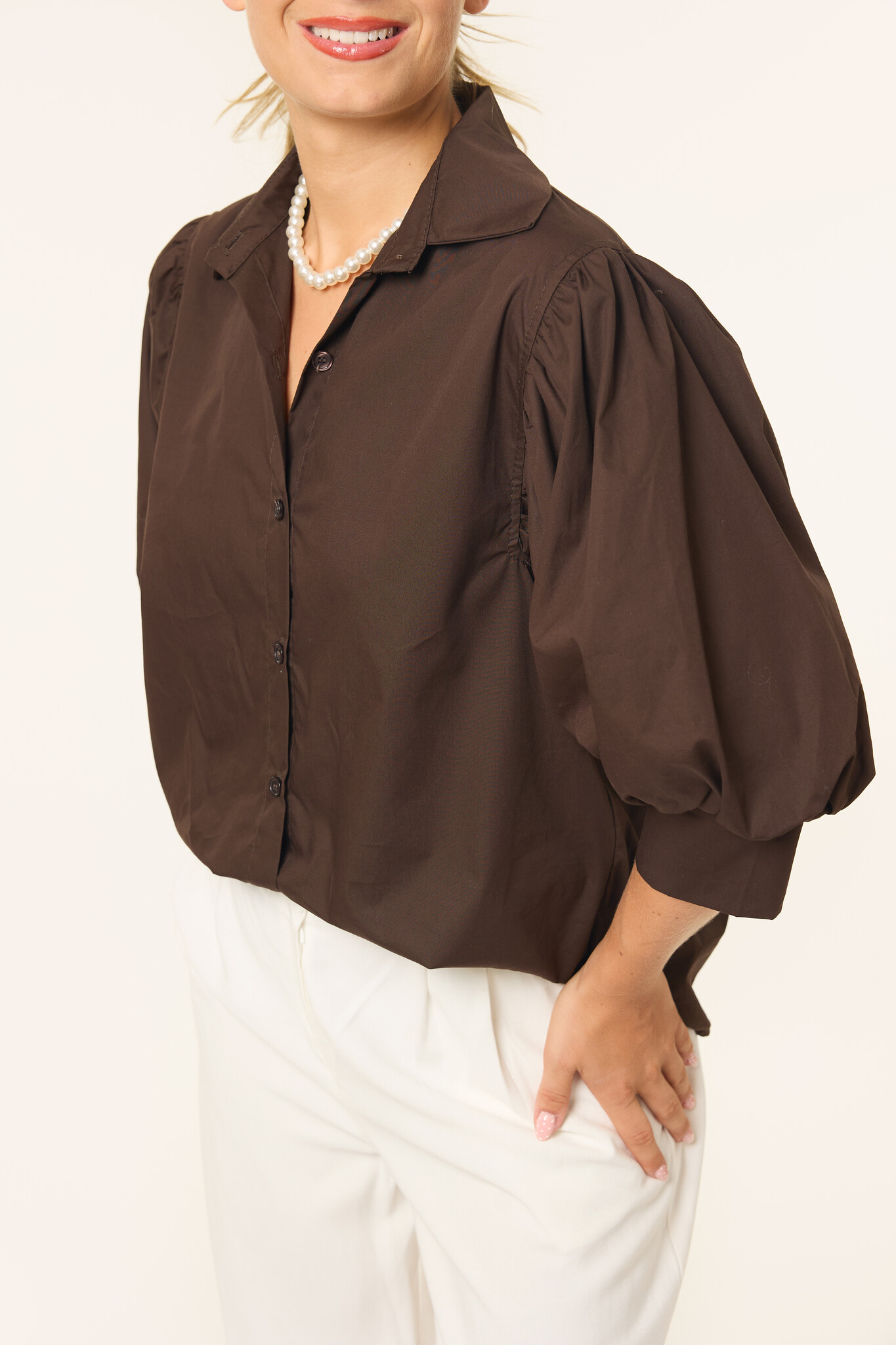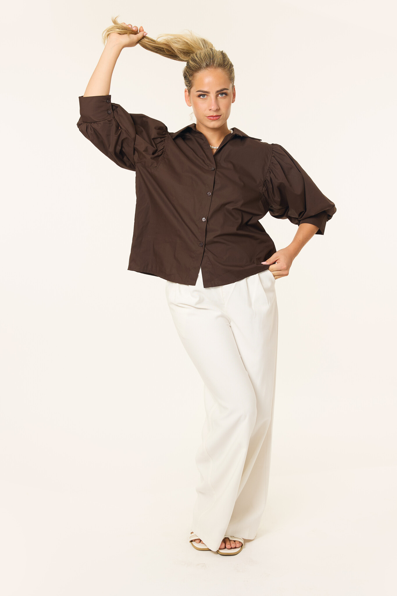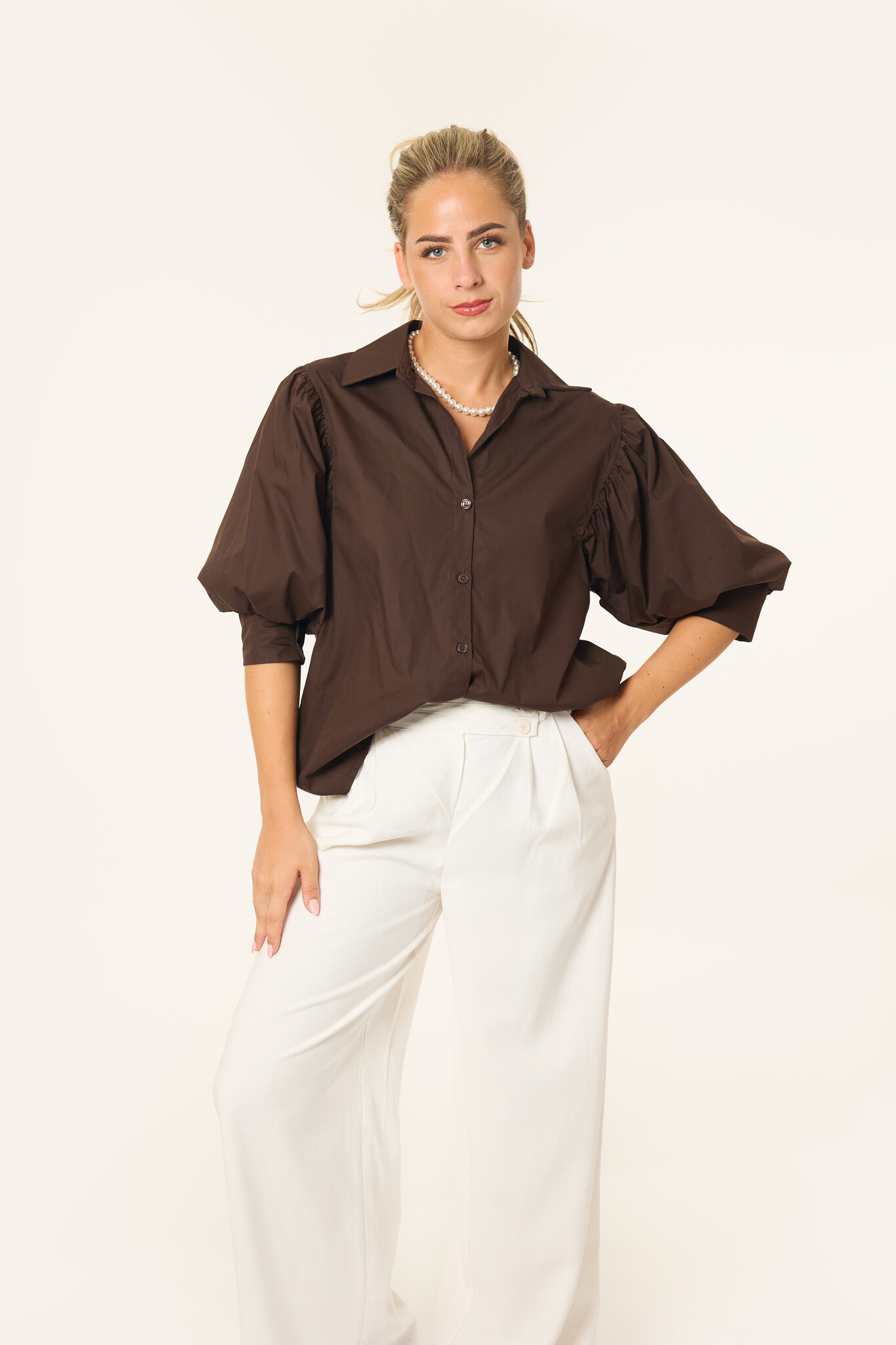 Deze bruine blouse is de perfecte nette basic. De korte pofmouwen geven de top net dat beetje extra, terwijl de neutrale donkerbruine kleur ervoor zorgt dat je de blouse eindeloos kunt combineren. Gemaakt van een luchtige stof, ideaal voor zowel een casual look als een nette outfit.