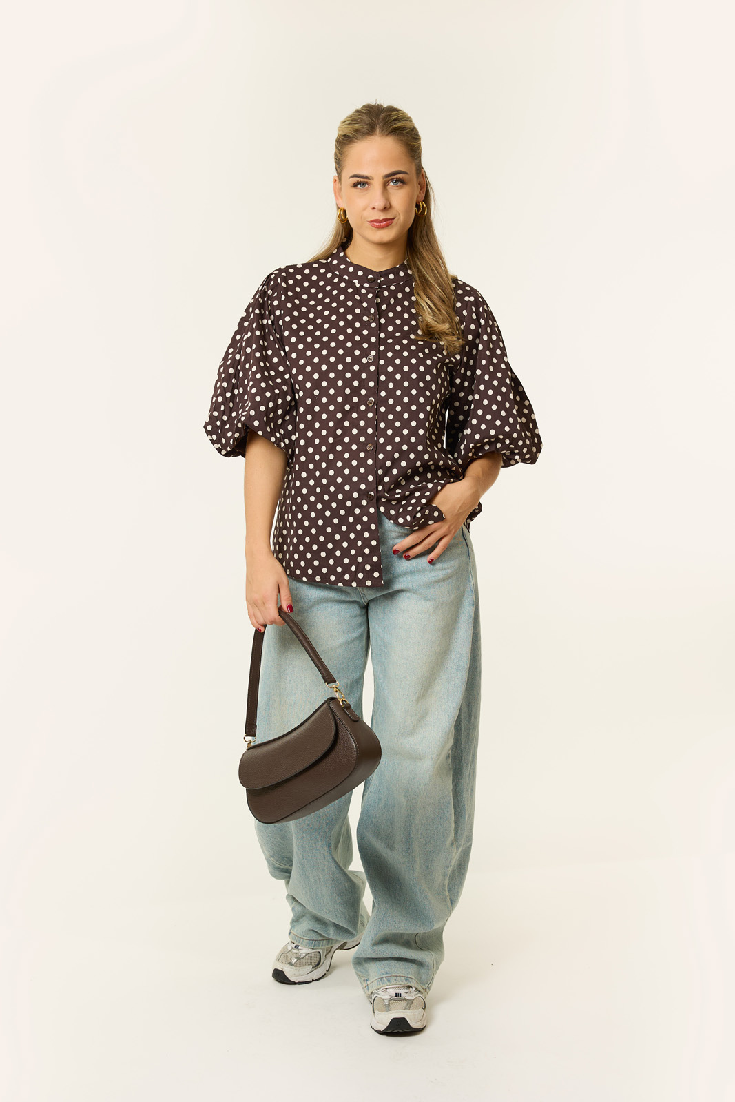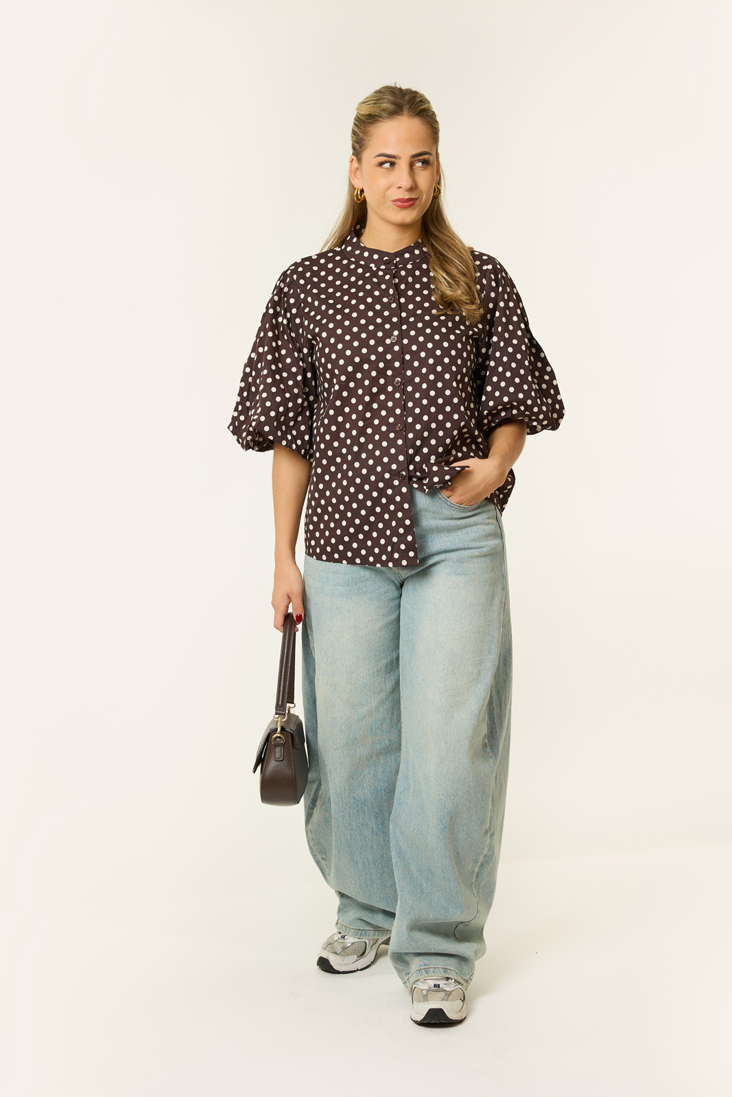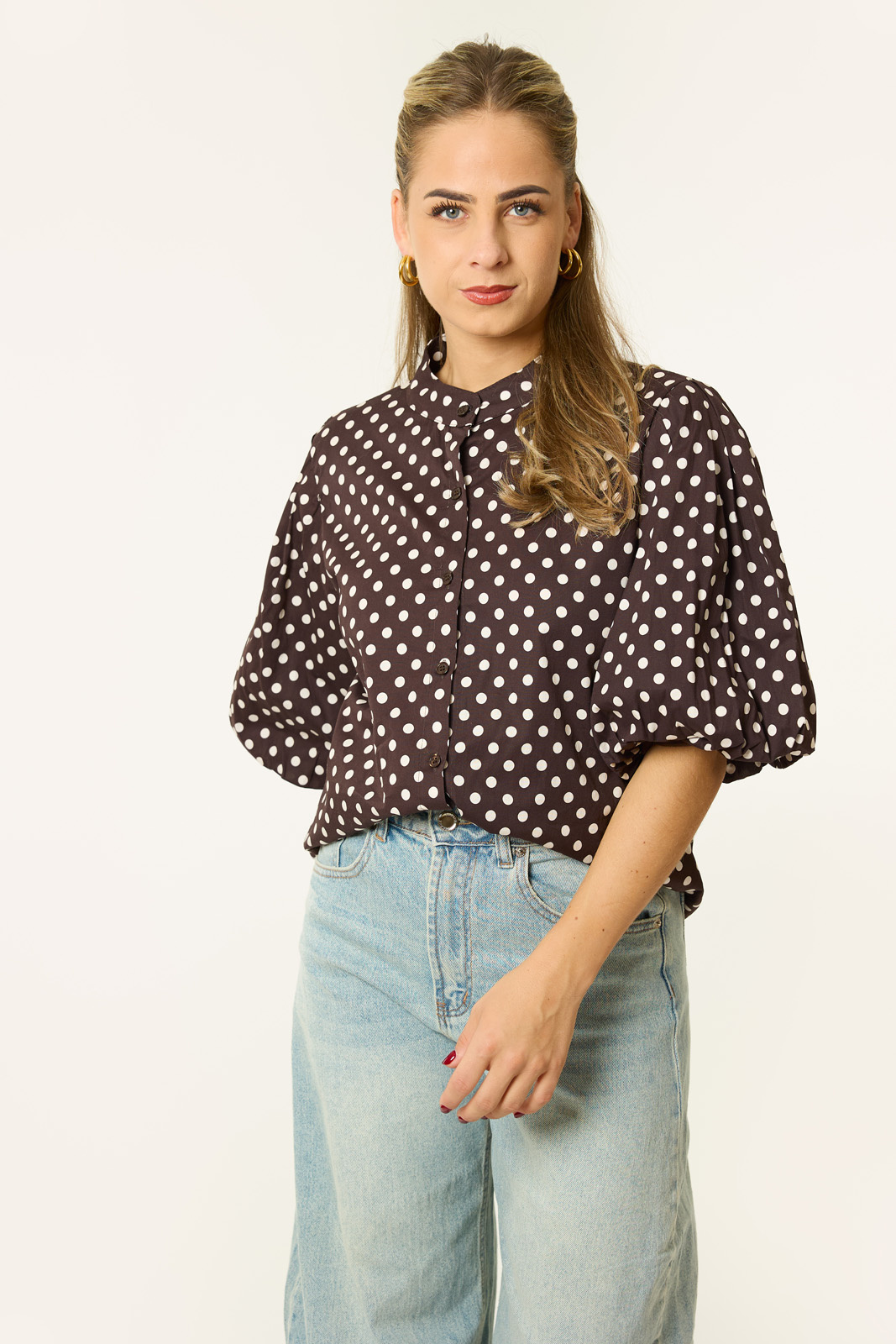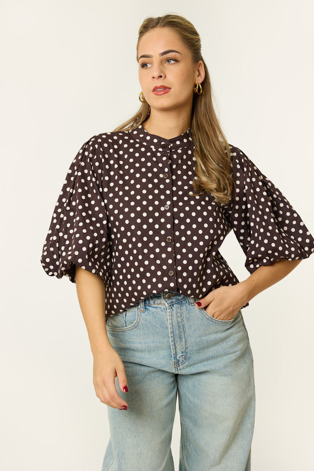 Deze donkerbruine blouse met witte stippen is een echte eyecatcher voor het najaar. De ballonmouwen zorgen voor een fun touch, terwijl de rechte fit lekker comfy zit. Draag de blouse casual met een jeans of combineer met een pantalon voor een vrouwelijke look. De zachte stof en tijdloze polkadot print maken deze blouse zo’n item dat je er steeds weer bij pakt!