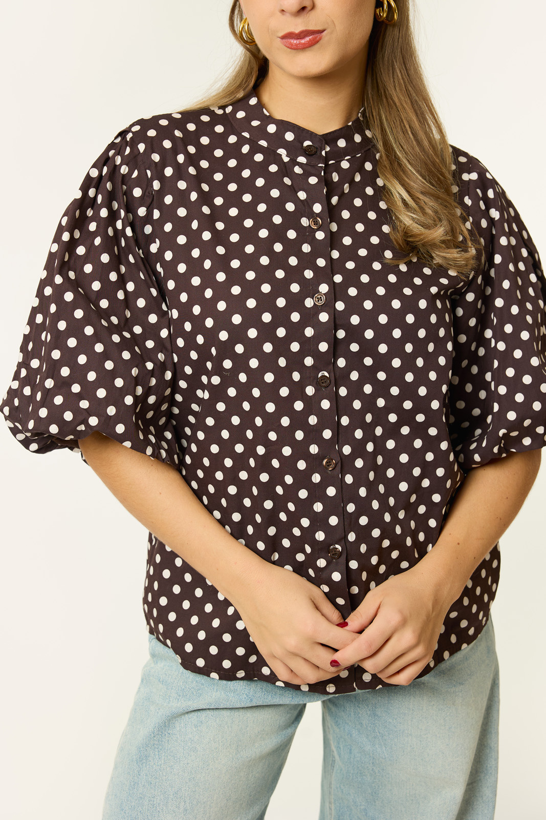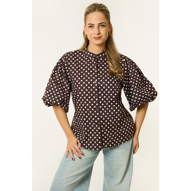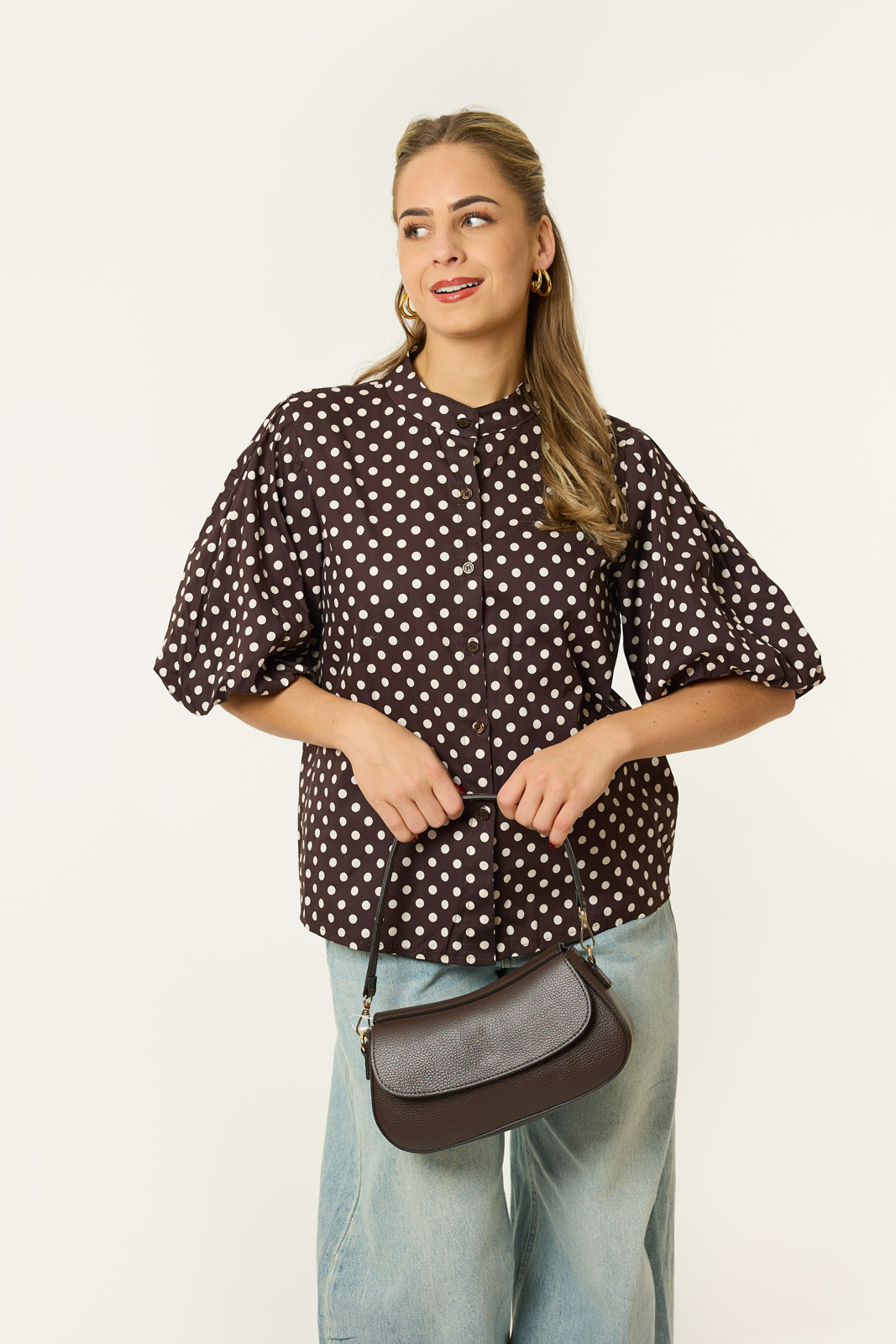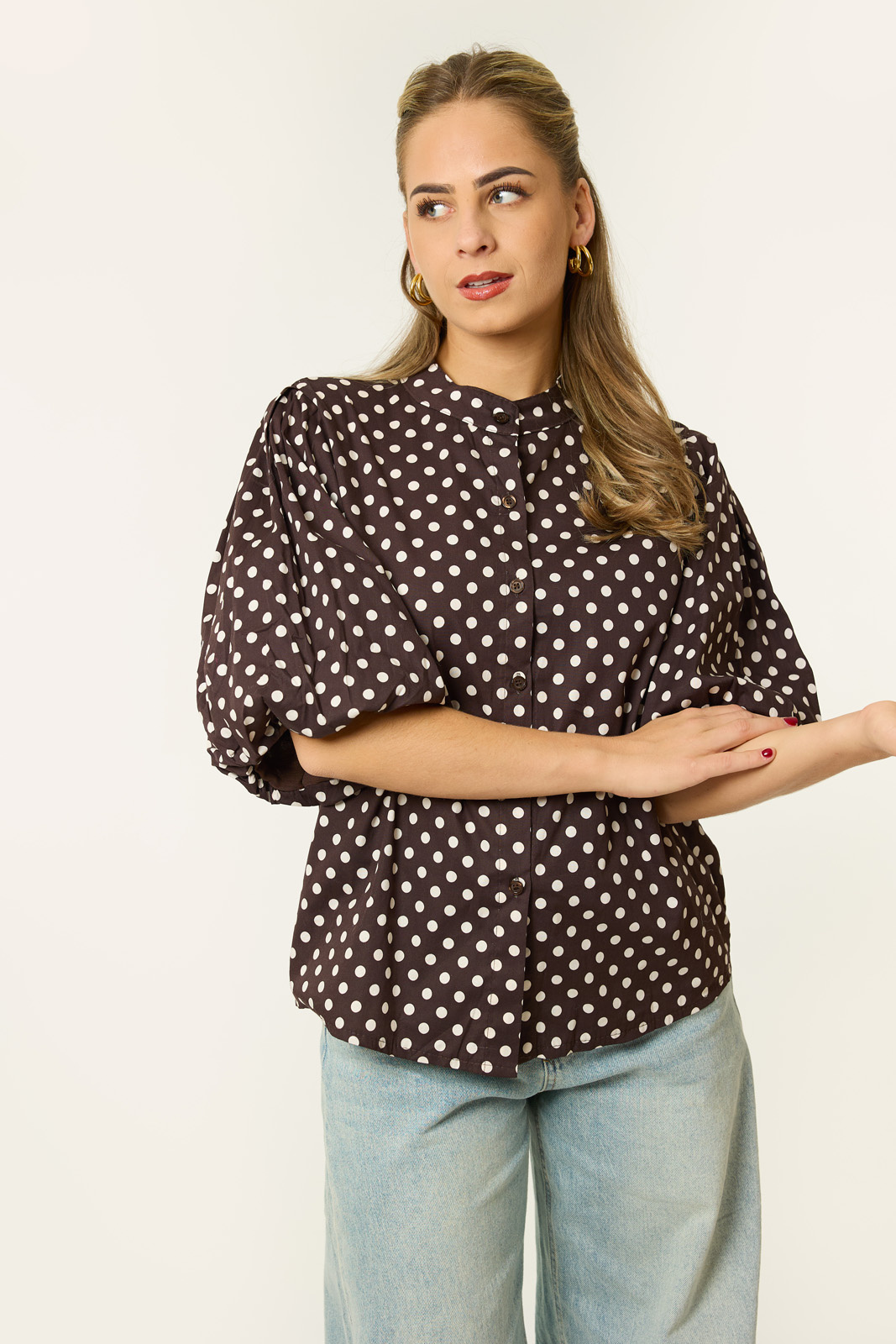 Deze donkerbruine blouse met witte stippen is een echte eyecatcher voor het najaar. De ballonmouwen zorgen voor een fun touch, terwijl de rechte fit lekker comfy zit. Draag de blouse casual met een jeans of combineer met een pantalon voor een vrouwelijke look. De zachte stof en tijdloze polkadot print maken deze blouse zo’n item dat je er steeds weer bij pakt!