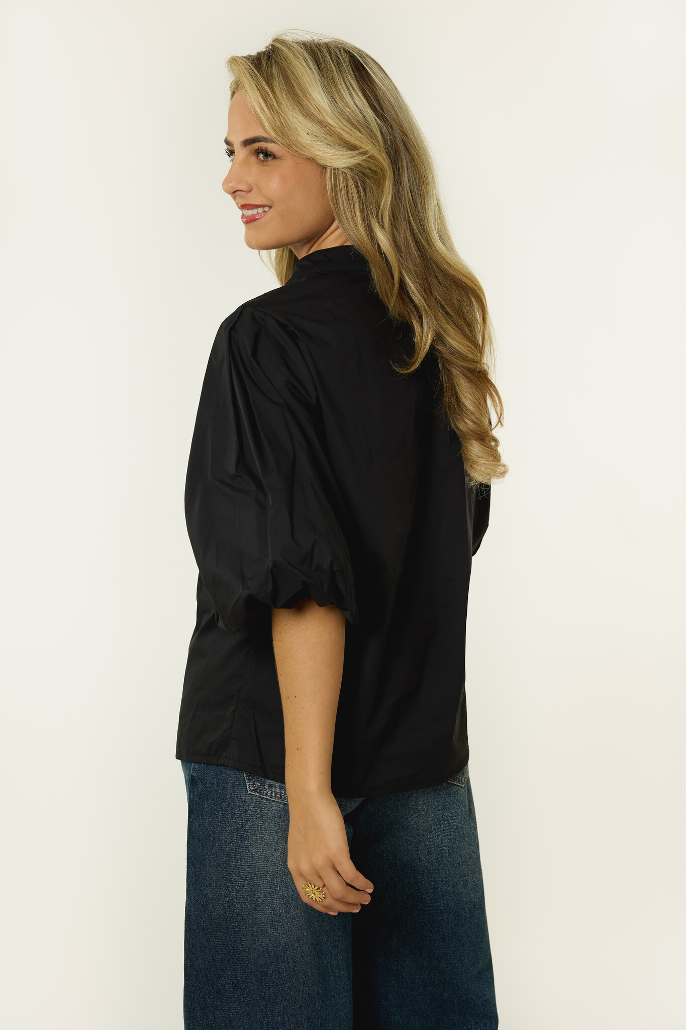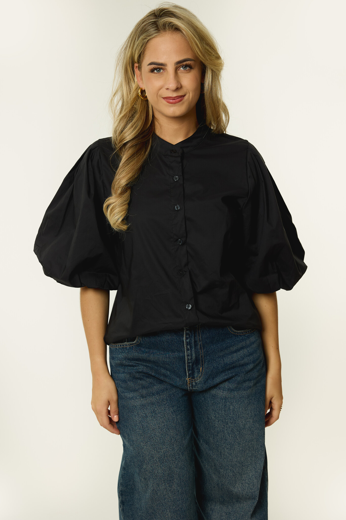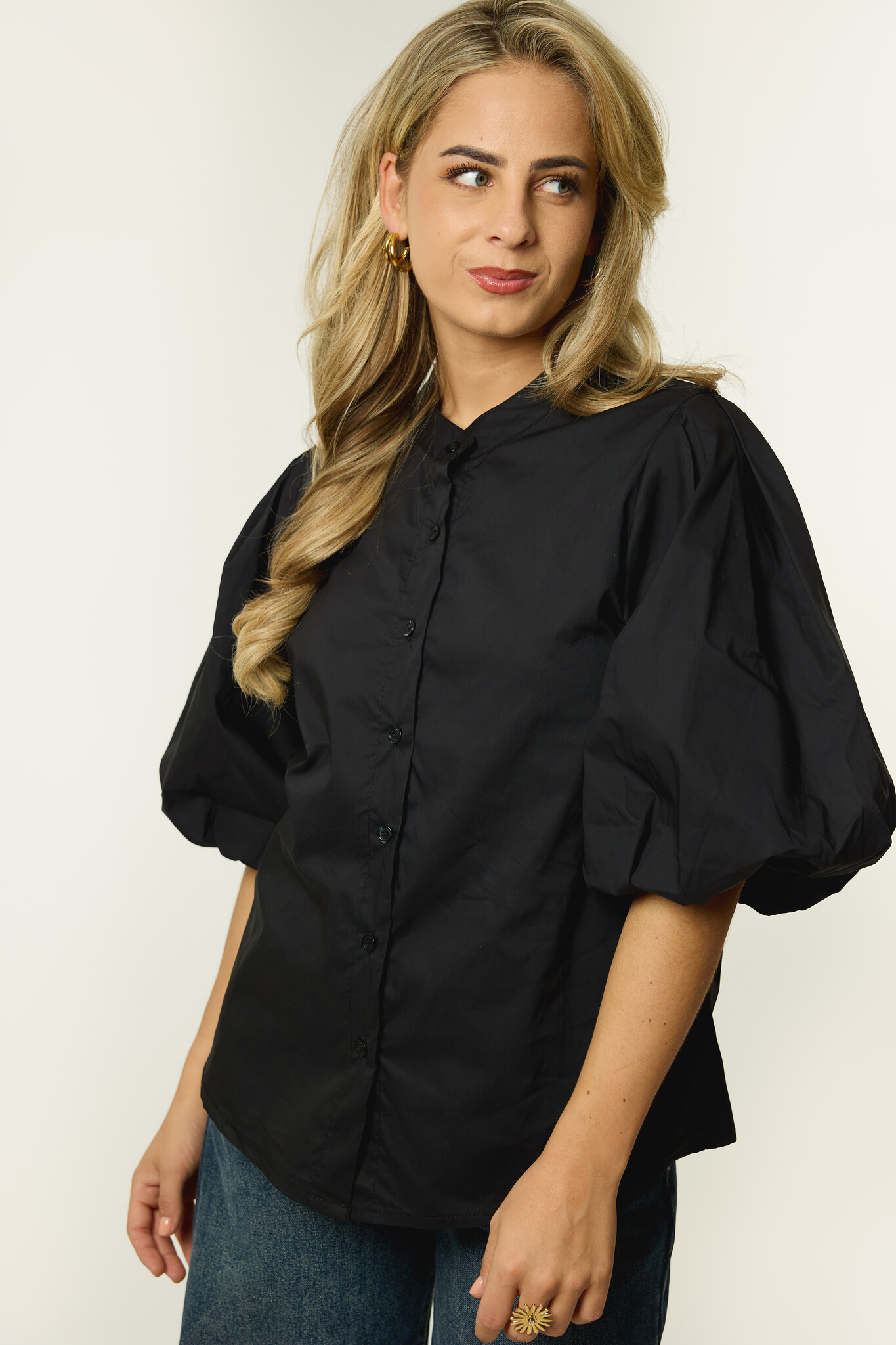 Deze zwarte blouse is de perfecte nette basic. De korte pofmouwen geven de top net dat beetje extra, terwijl de neutrale kleur ervoor zorgt dat je de blouse eindeloos kunt combineren. Gemaakt van een luchtige stof, ideaal voor zowel een casual look als een nette outfit.