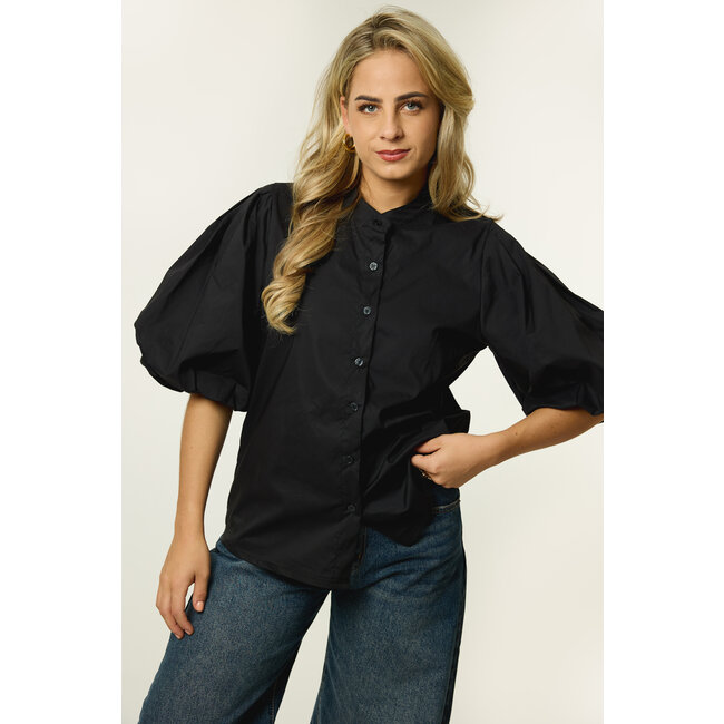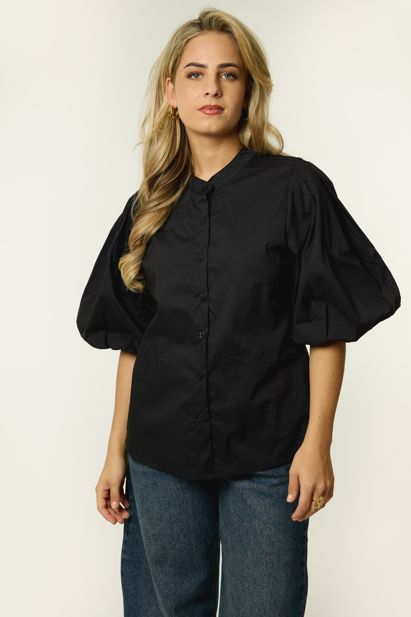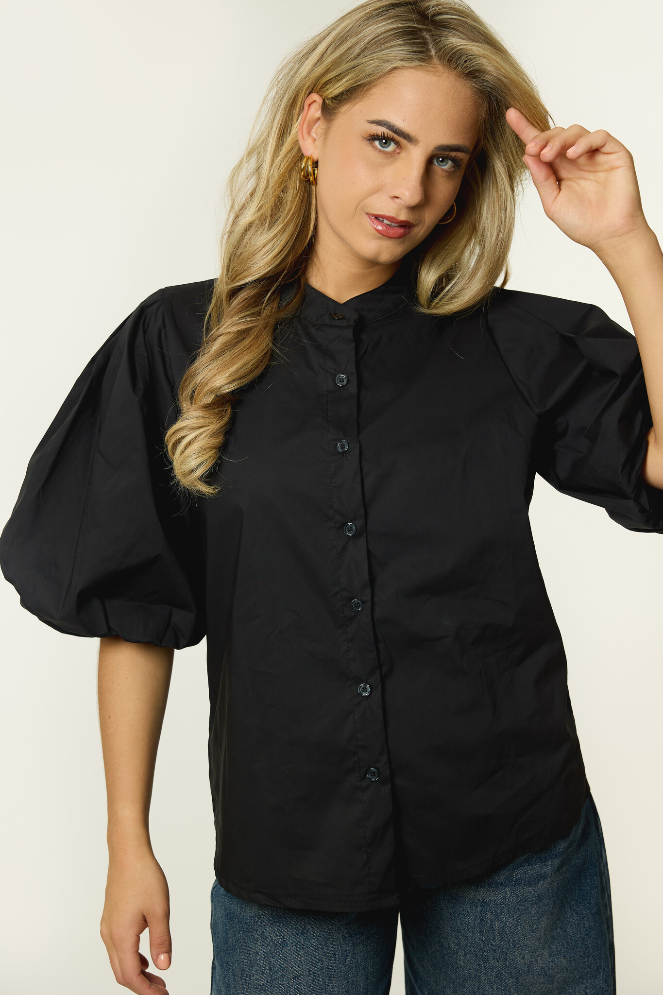Deze zwarte blouse is de perfecte nette basic. De korte pofmouwen geven de top net dat beetje extra, terwijl de neutrale kleur ervoor zorgt dat je de blouse eindeloos kunt combineren. Gemaakt van een luchtige stof, ideaal voor zowel een casual look als een nette outfit.