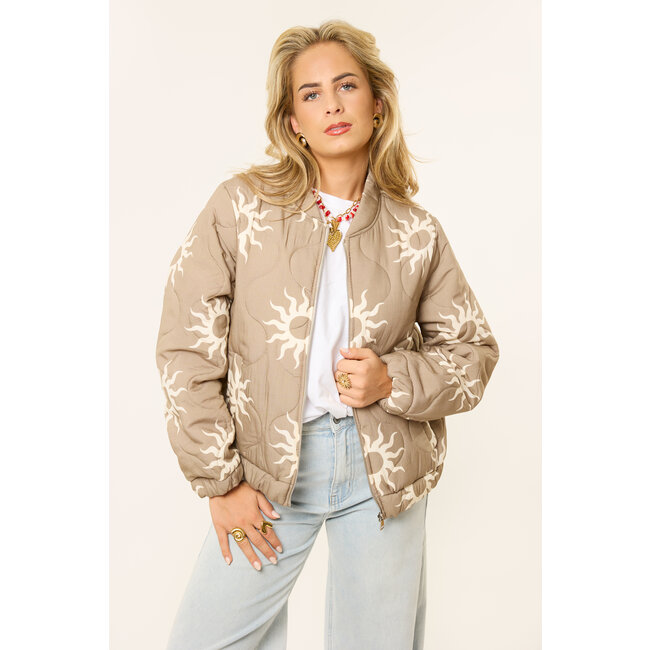Dit beige bomberjasje met zonnetjesprint is precies wat je nodig hebt voor dat beetje extra in je outfit. De neutrale kleur maakt de bomberjas super easy te combineren, terwijl de print zorgt voor een unieke touch. Draag de jas open over een basic look of maak het de eyecatcher van je outfit.